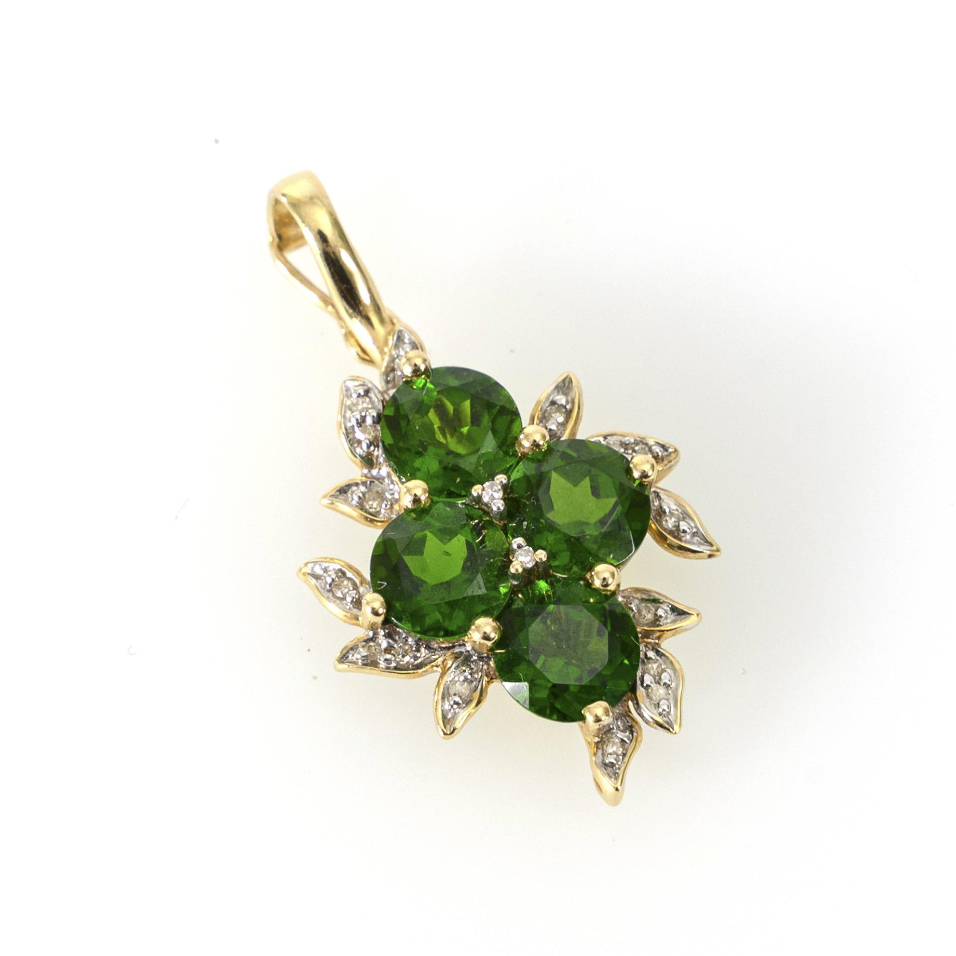 Clip-Anhänger mit vier zentralen grünen Steinen, wohl Tsavorit, umgeben von blattwerkartigen Elementen, besetzt mit kleinen Diamanten.