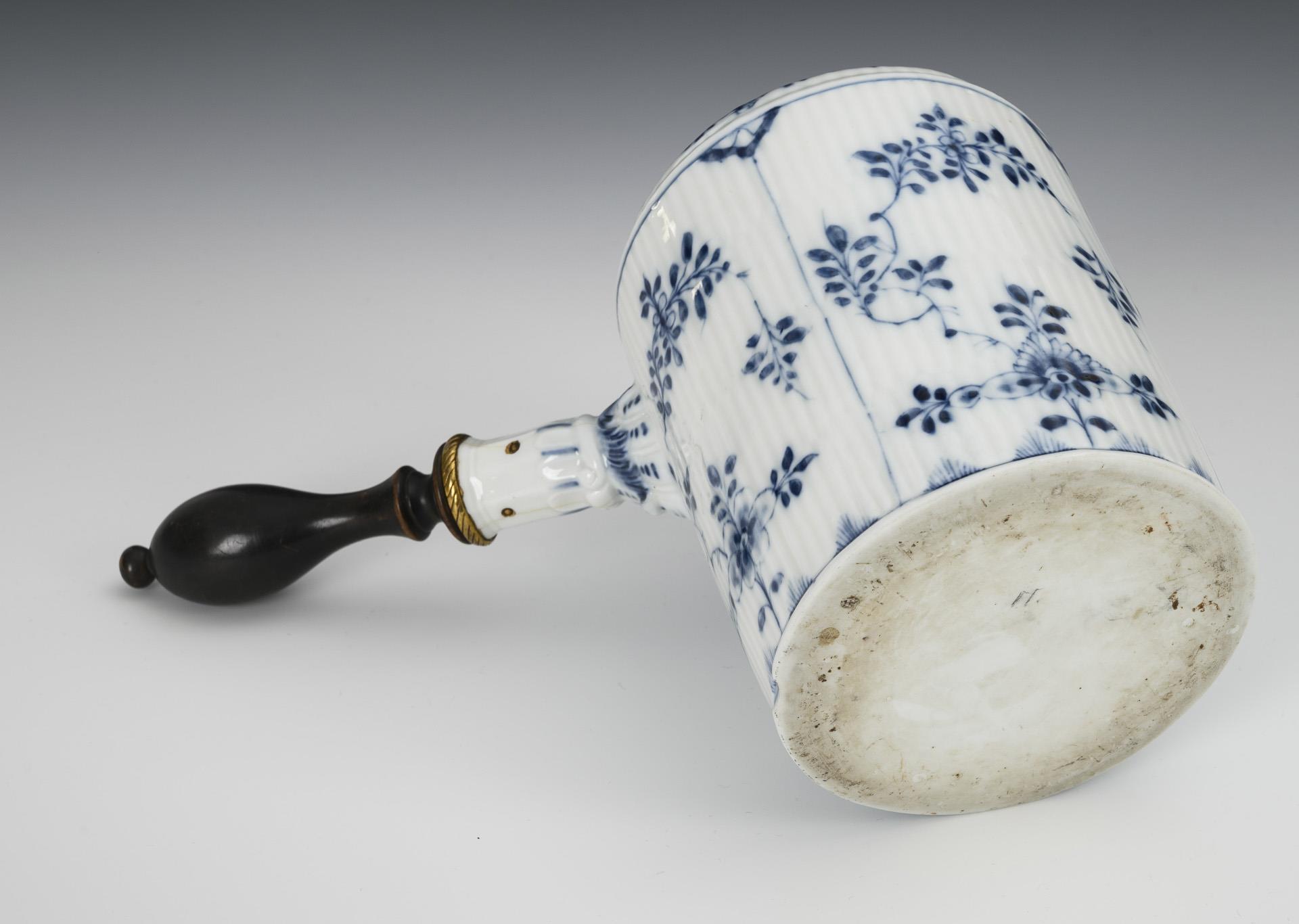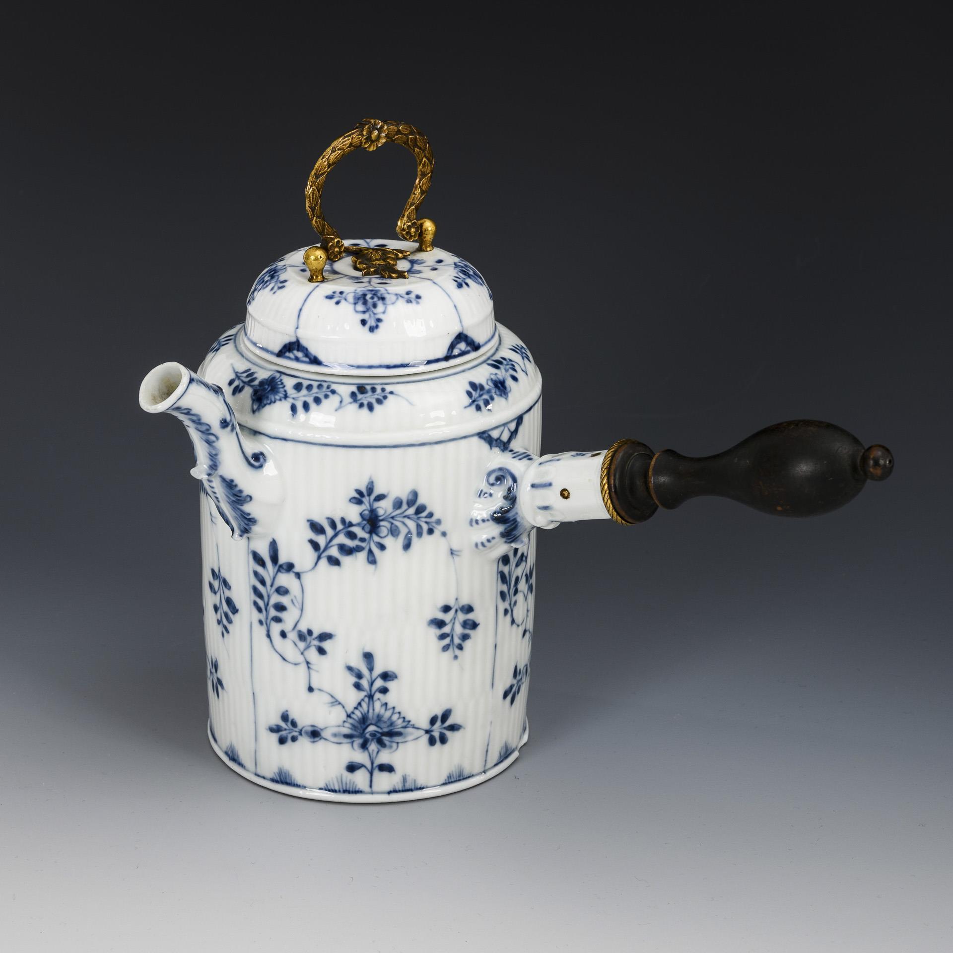 Form "Gebrochener Stab". Zylinderkanne mit seitlichem Holzhenkel, Röhrenausguß und Deckel mit Metallmontierung und -bügelhenkel. Kleine, zum Teil herstellungsbedingte Bestoßung am Stand, Haarriss im Stielhenkel, 1 Steg der Metallmontierung fehlt.