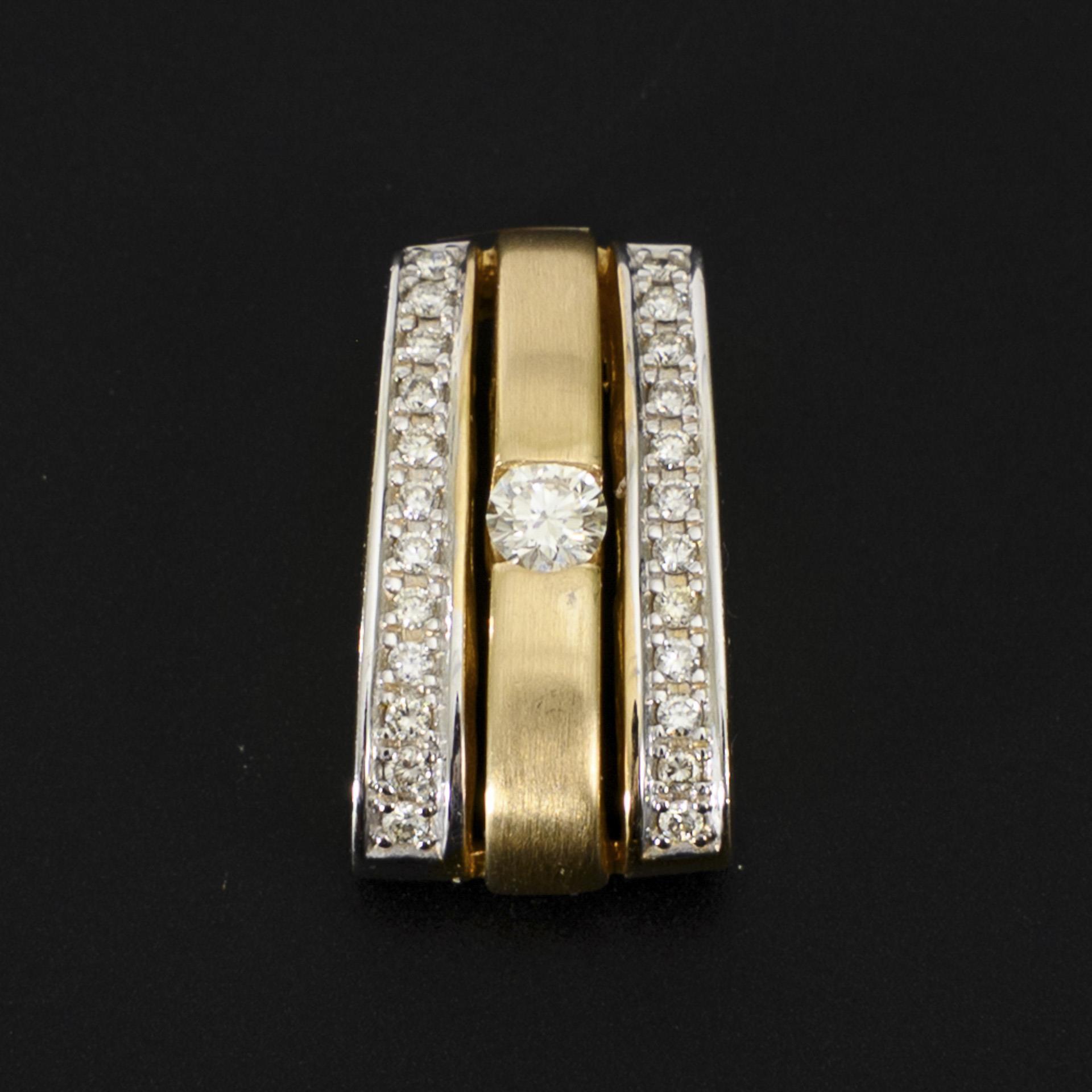 Moderner 3-bändriger, trapezförmiger Kettenanhänger, je seitlich mit einem Band aus kleinen pavégefassten Brillanten besetzt, das Mittelelement mit einem größeren Brillant als Solitär gestaltet. Leichte Tragespuren.