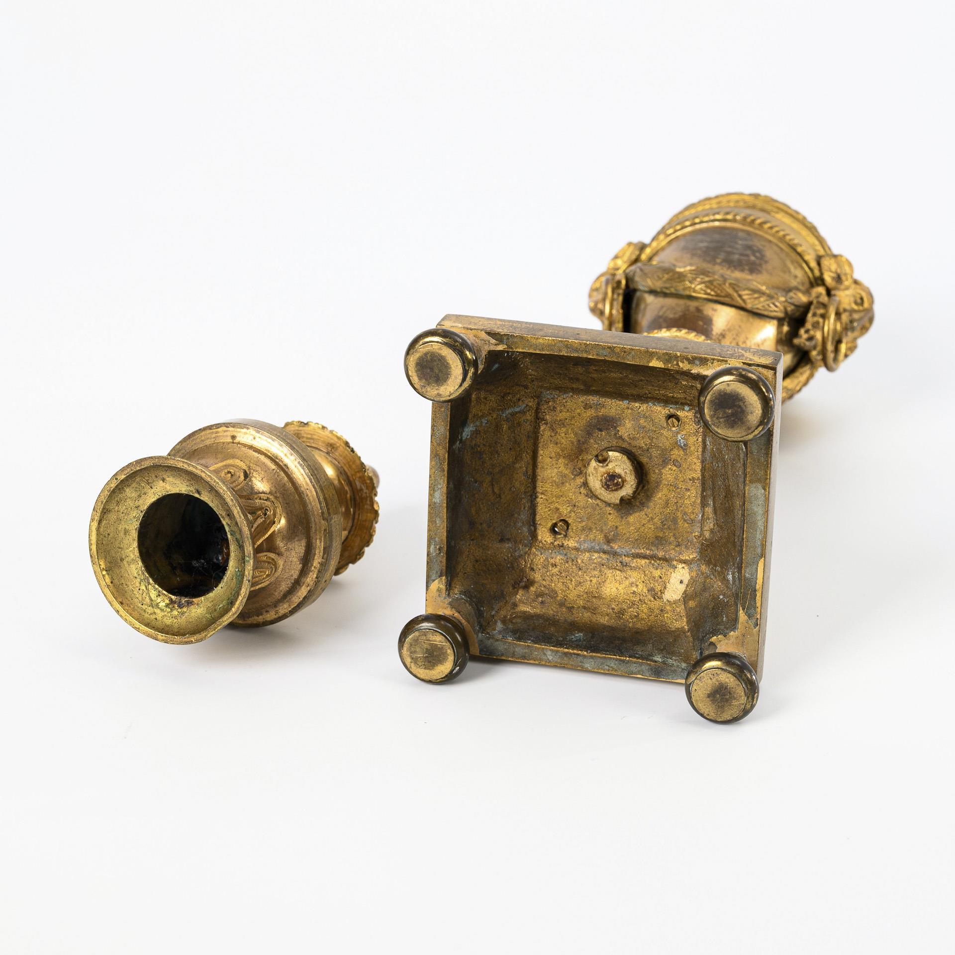 Quadratfuß mit Blattzier, kannelierter Säulenstumpf, Ziervase mit Ring-Handhaben am appliziertem Aigikranion, Deckel mit reicher Reliefzier ergibt umgedreht einen Hand-Kerzenleuchter. Vergoldung berieben.