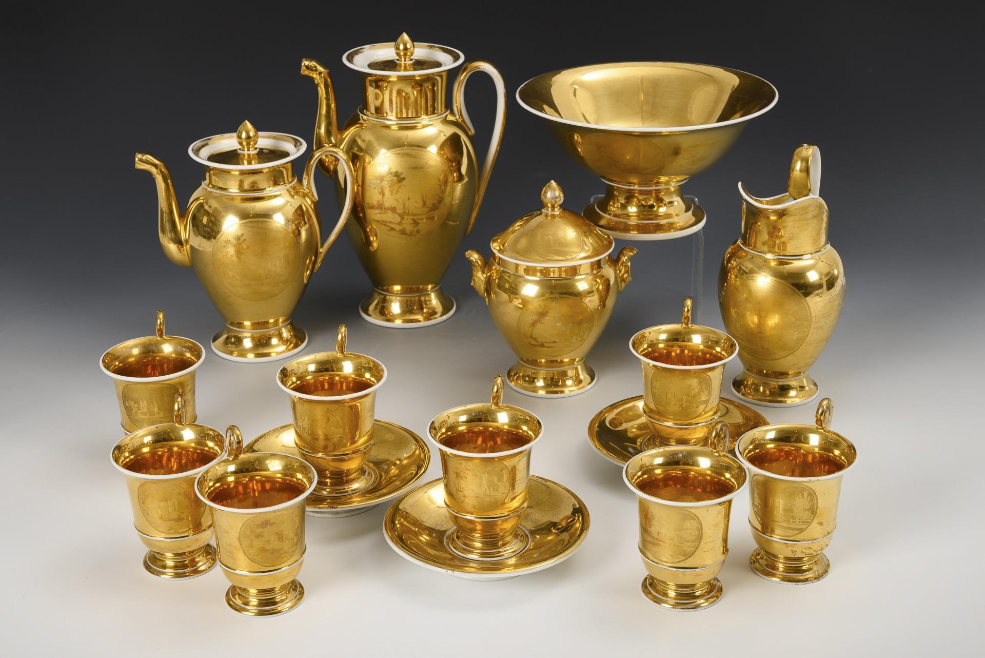 16 Teile. Goldfond, schauseitig Medaillons mit goldradierten Landschaften. 2 Kaffeekannen (H 26 und 20,5 cm), Milchkännchen, Zuckerdose, 8 Tassen, 3 Untertassen und 1 Spülkumme (H 11,5 cm). Partiell minimaler Goldabrieb, 1 Untertassenrand, 1 Deckelnase bestoßen.