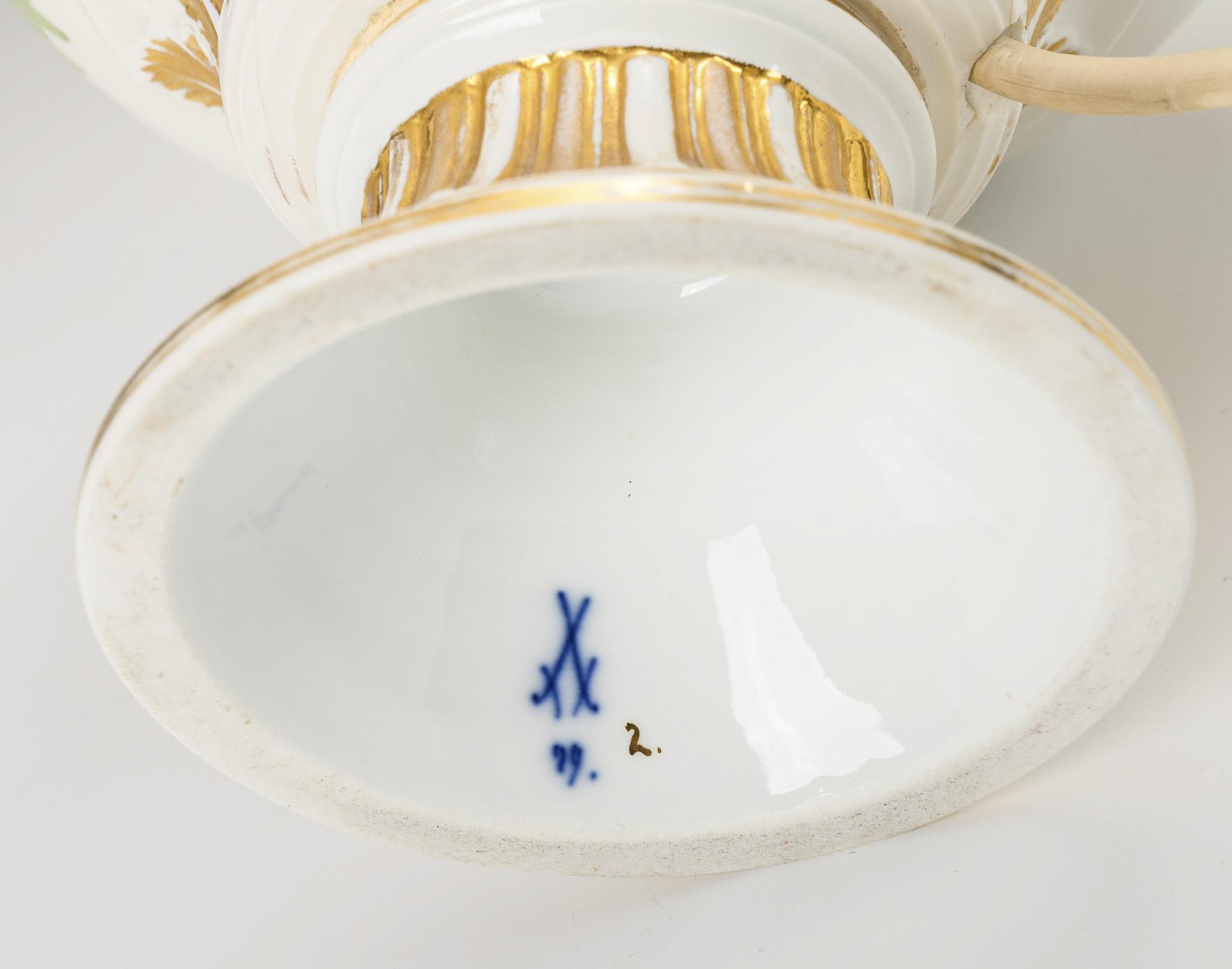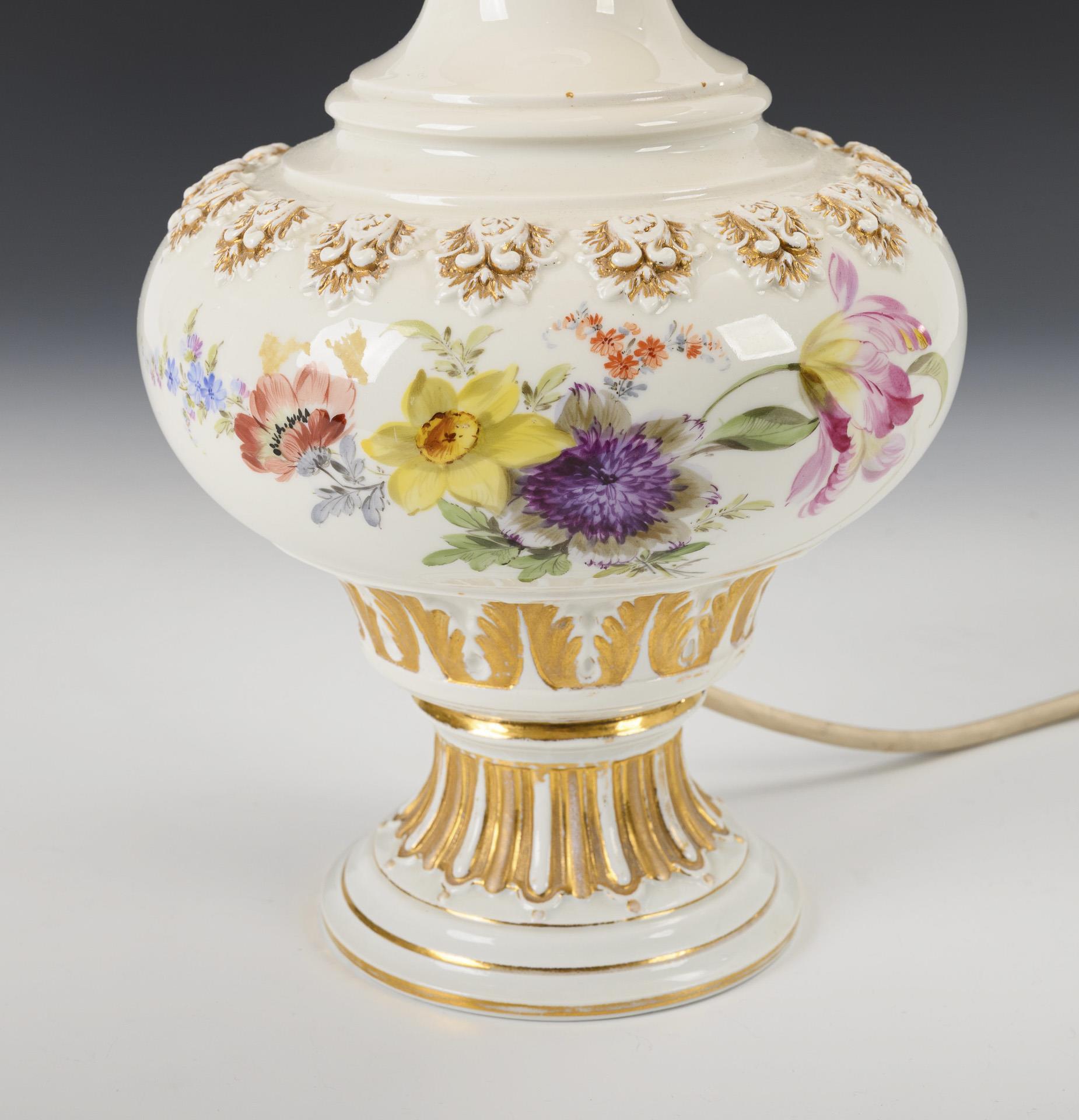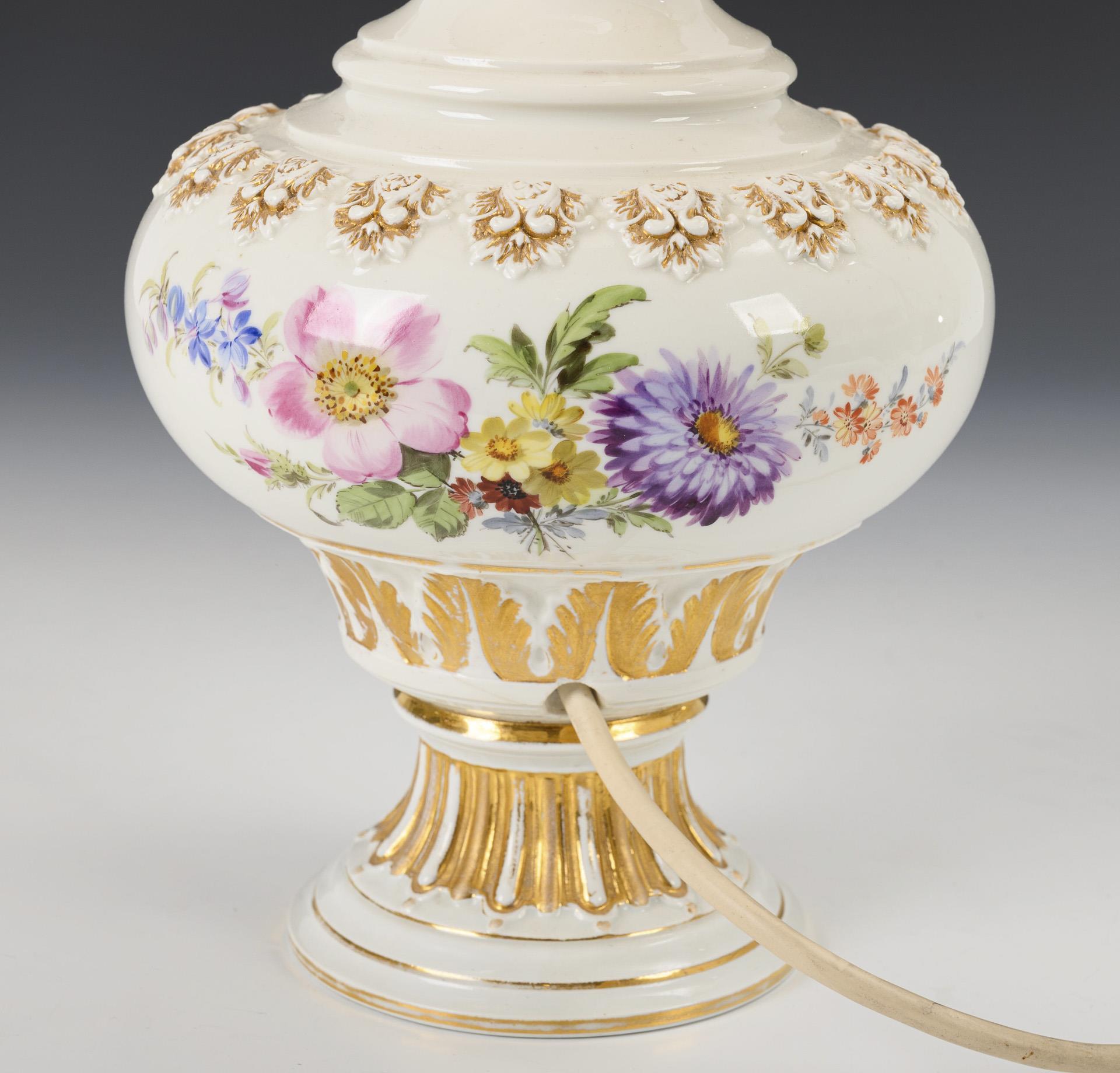 Balustervase mit goldbronzierten Ornamentreliefs, einem beidseitigen Blumenbukett und konischem Papierschirm. Elektrifiziert (Funktion nicht geprüft). Gold berieben.