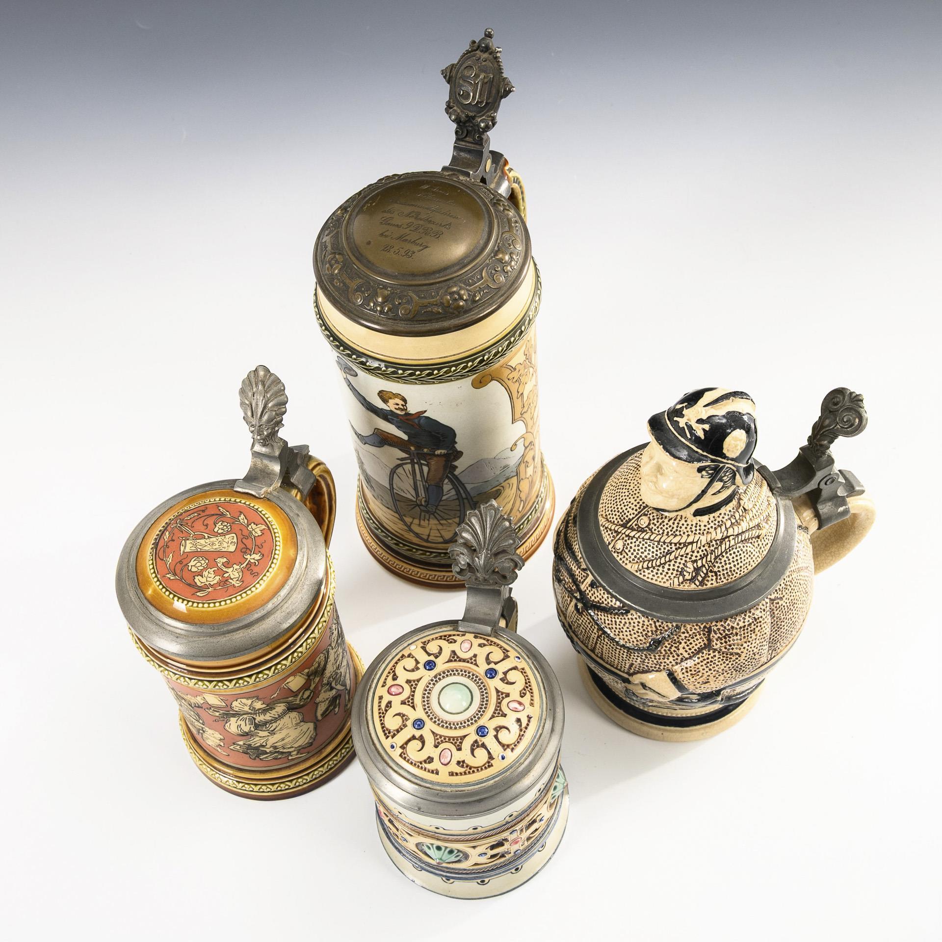 Mettlach gemarkter Krug mit Hochradfahrer und Messingdeckel mit Preisgravur vom Straßenwettfahren 1893 bei Marburg. / Gleich gemarkter Krug mit umlaufenden Tänzern; Deckel mit Zinnmontierung. / Villeroy & Boch gemarkter Krug mit reliefiertem Beschlagwerk-Ornament sowie Deckel mit Zinnmontierung. (Innenglasur am Boden krakeliert.) / Bauchiger Figurenkrug als Feuerwehrmann; Deckel mit Zinnmontierung (Glasur innen feinteilig krakeliert).
