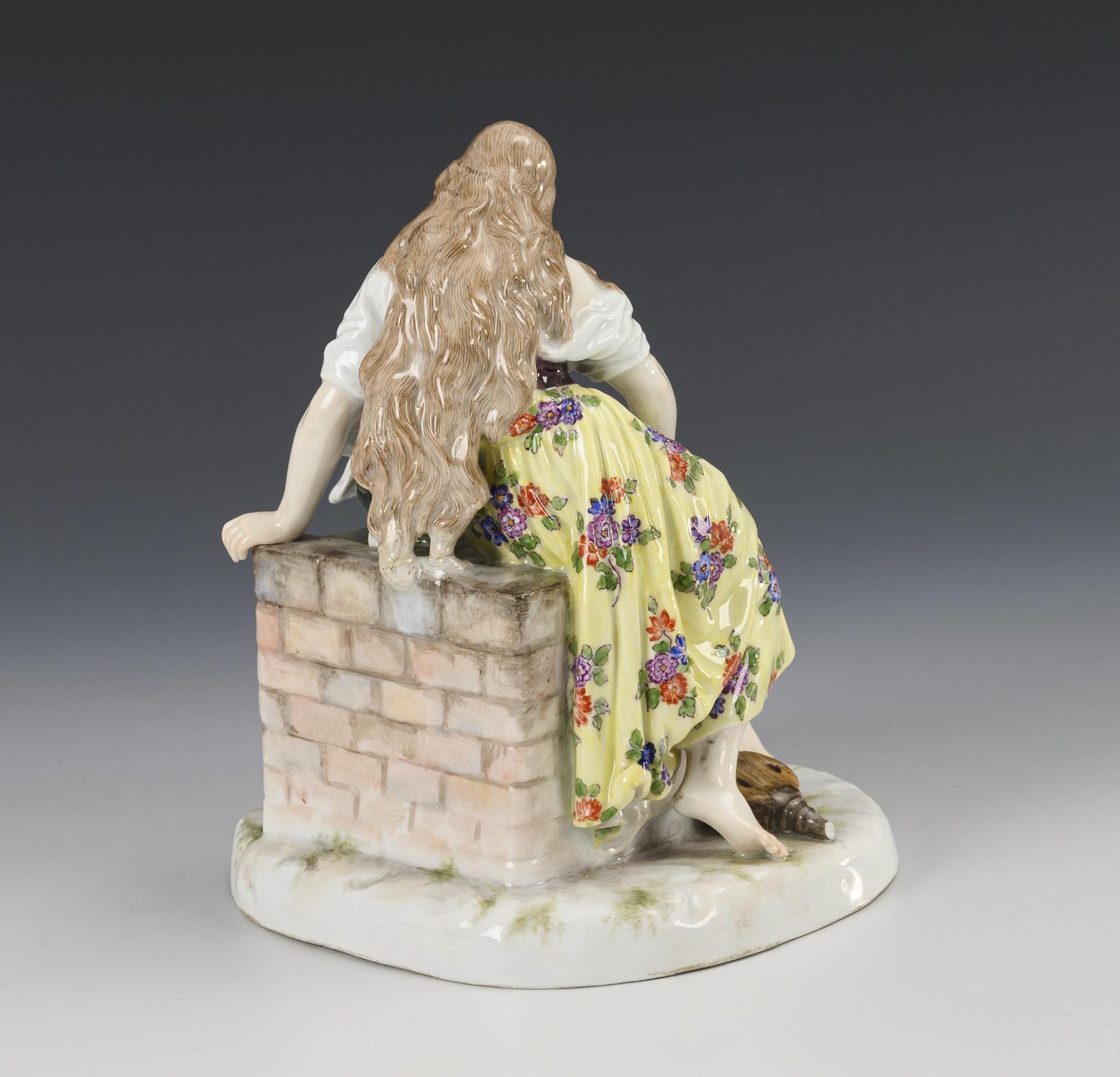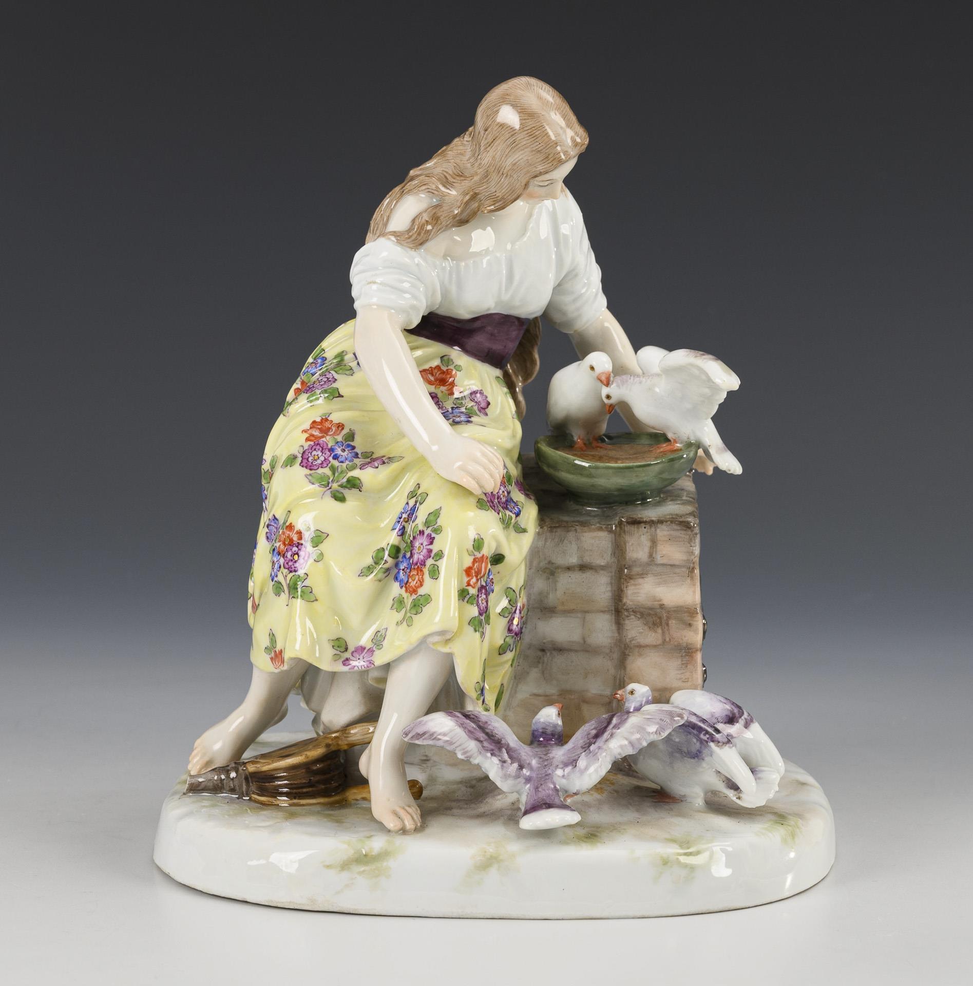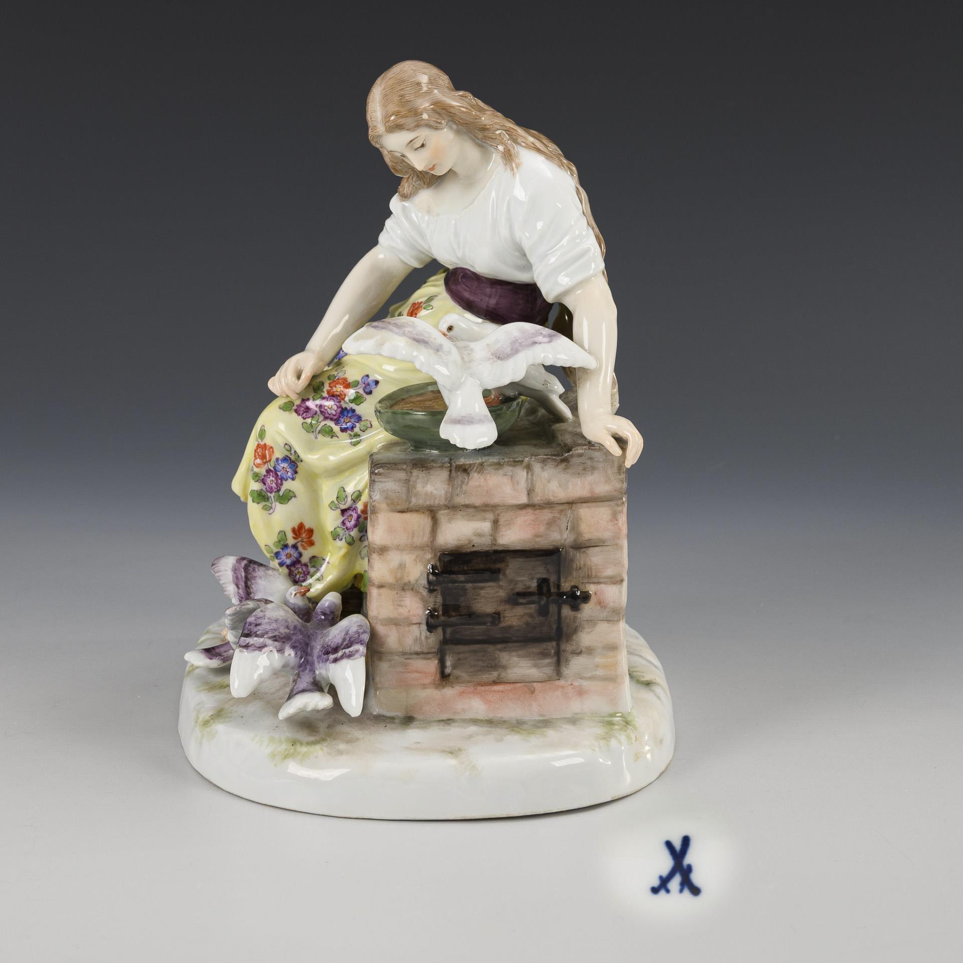 Auf einem Ofen sitzendes Aschenputtel, den Tauben beim Lesen der Linsen zuschauend.