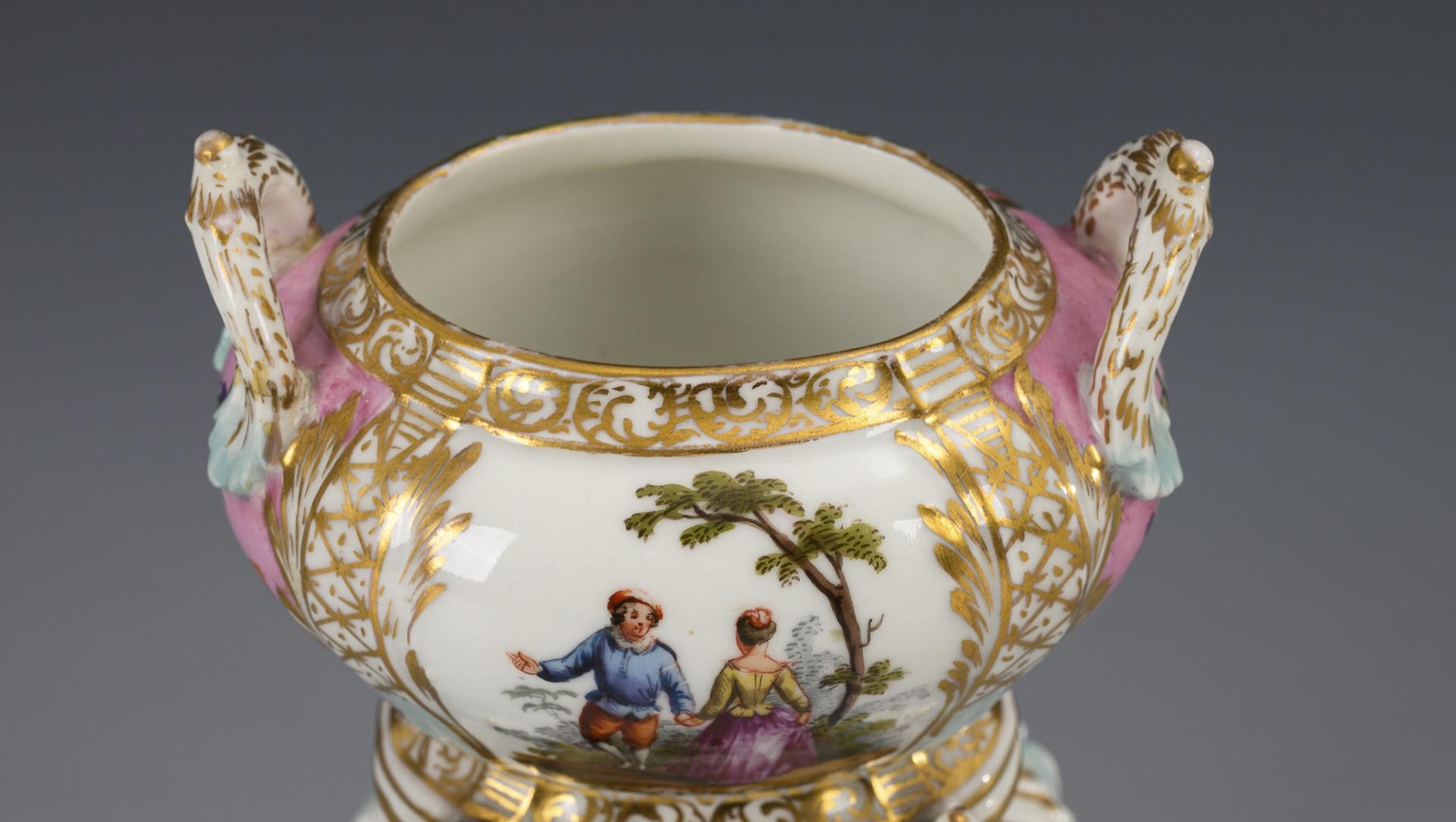 Polychrom bemalt, goldstaffiert. Brûle-Parfum (H 15,5 cm), Tintengefäss (ohne Deckel; H 6,5 cm). 540 g.