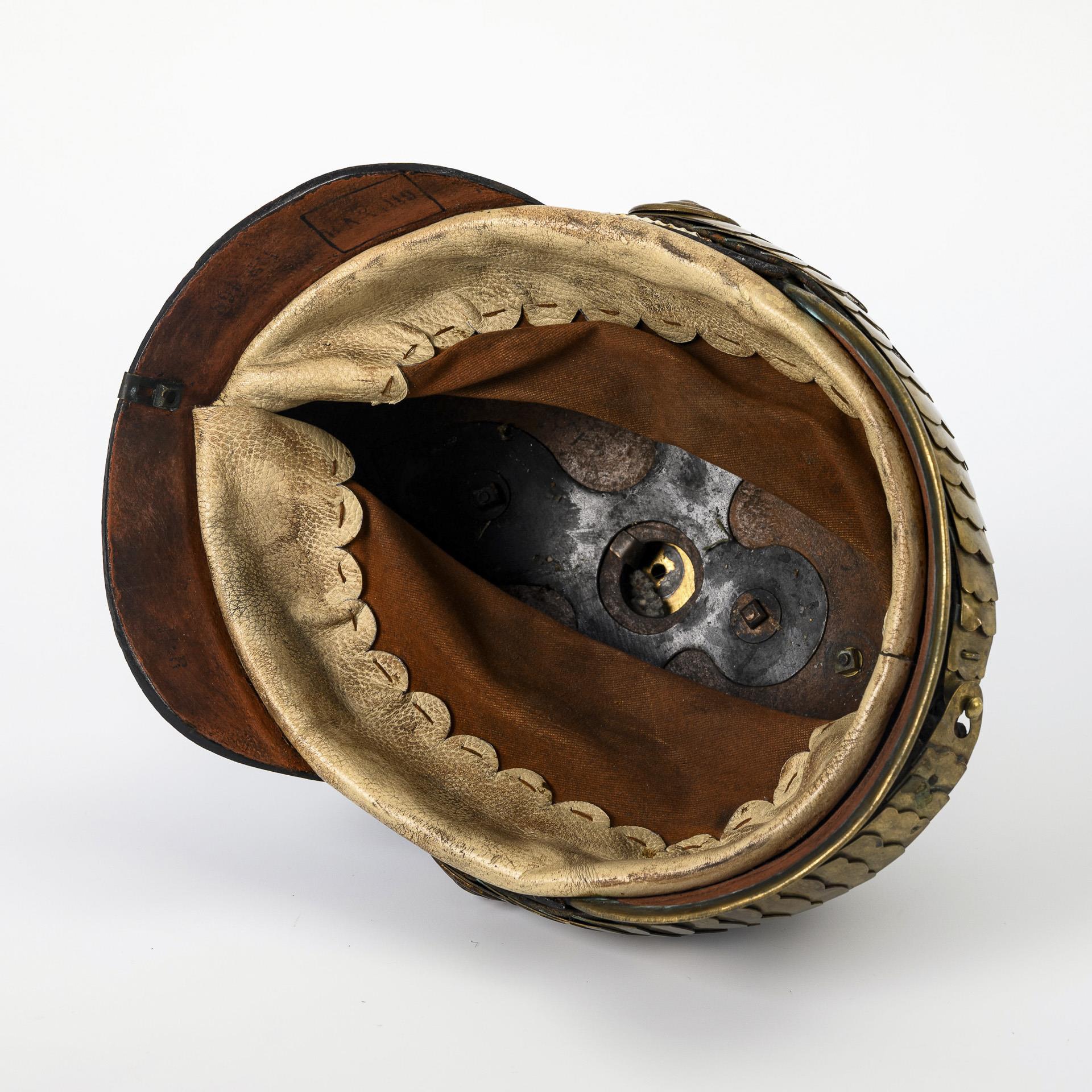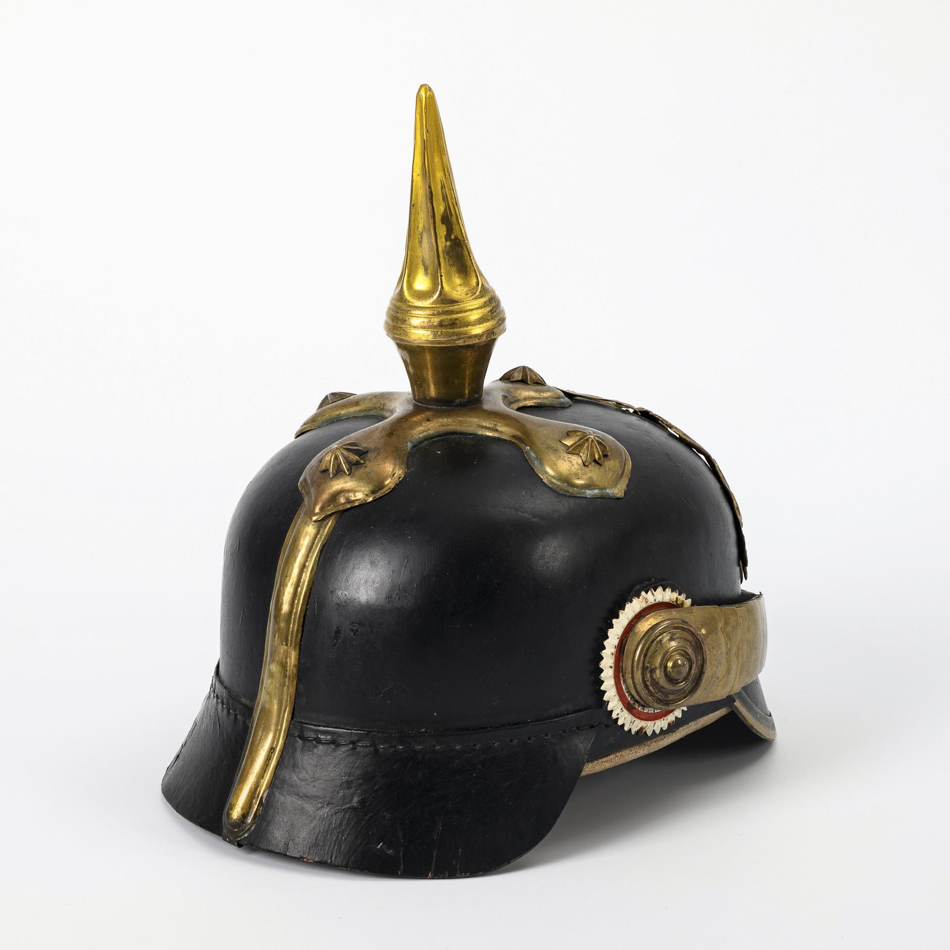 Schwarze Lederhaube mit Schuppenkette. Emblem mit Jahreszahl 1697 - 1897. Kreuzblatt mit Sternschrauben, Kannelierte Spitze aufgesteckt, mit Lötstelle (wohl nicht original dazugehörig). Beide Kokarden vorhanden. Wohl originales Innenfutter. Auf dem Nackenschild Stempel: "IR 168" (5. Großherzogliches Infanterie Regiment Nr. 168) / Im Rechteck "BAX 1119".