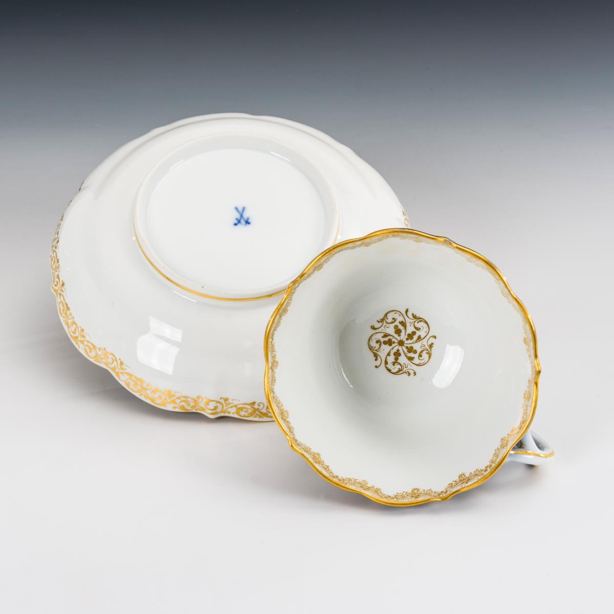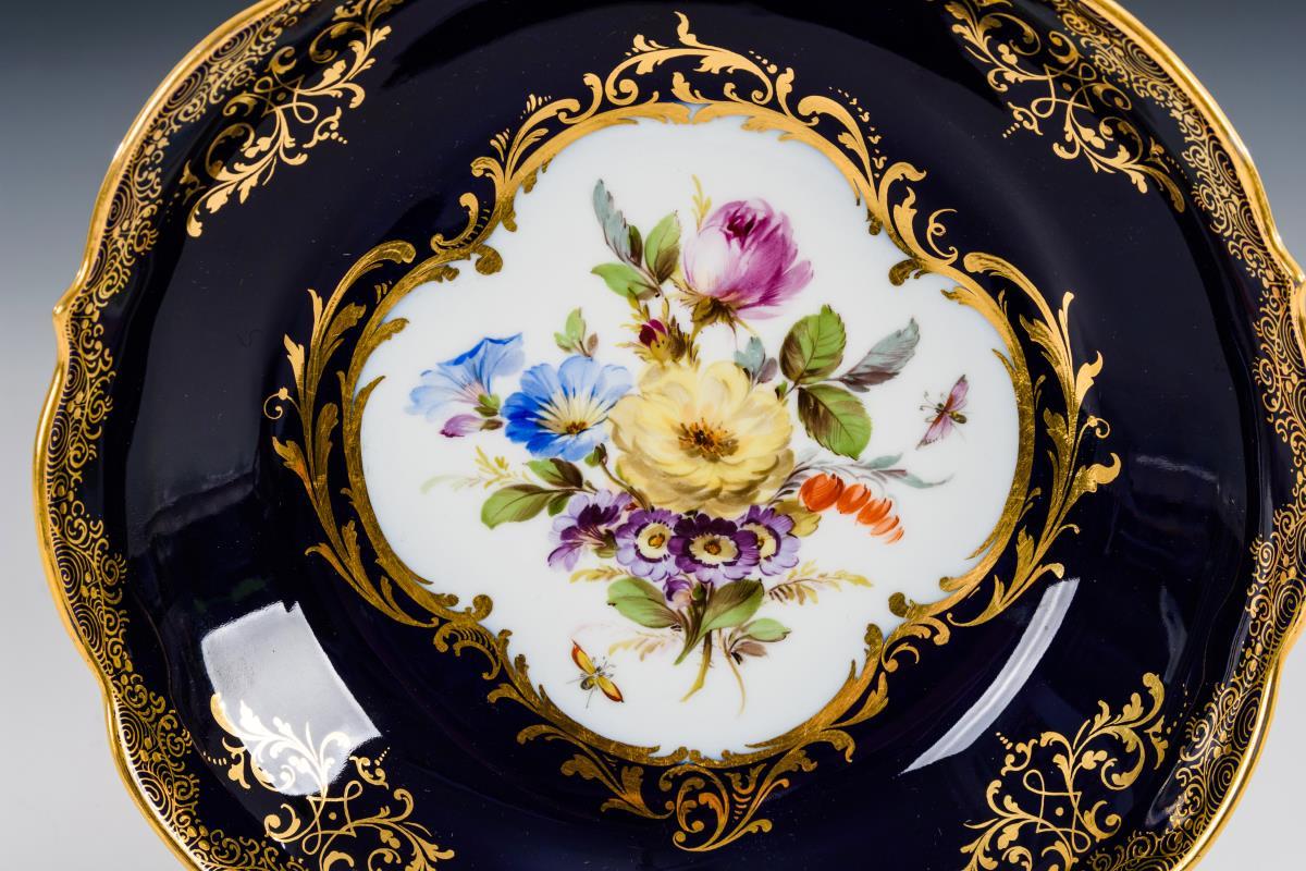 Kobaltblauer Fond, polychrome Malerei, Goldstaffage. H Tasse 8,5 cm, Ø originale Untertasse 18 cm.