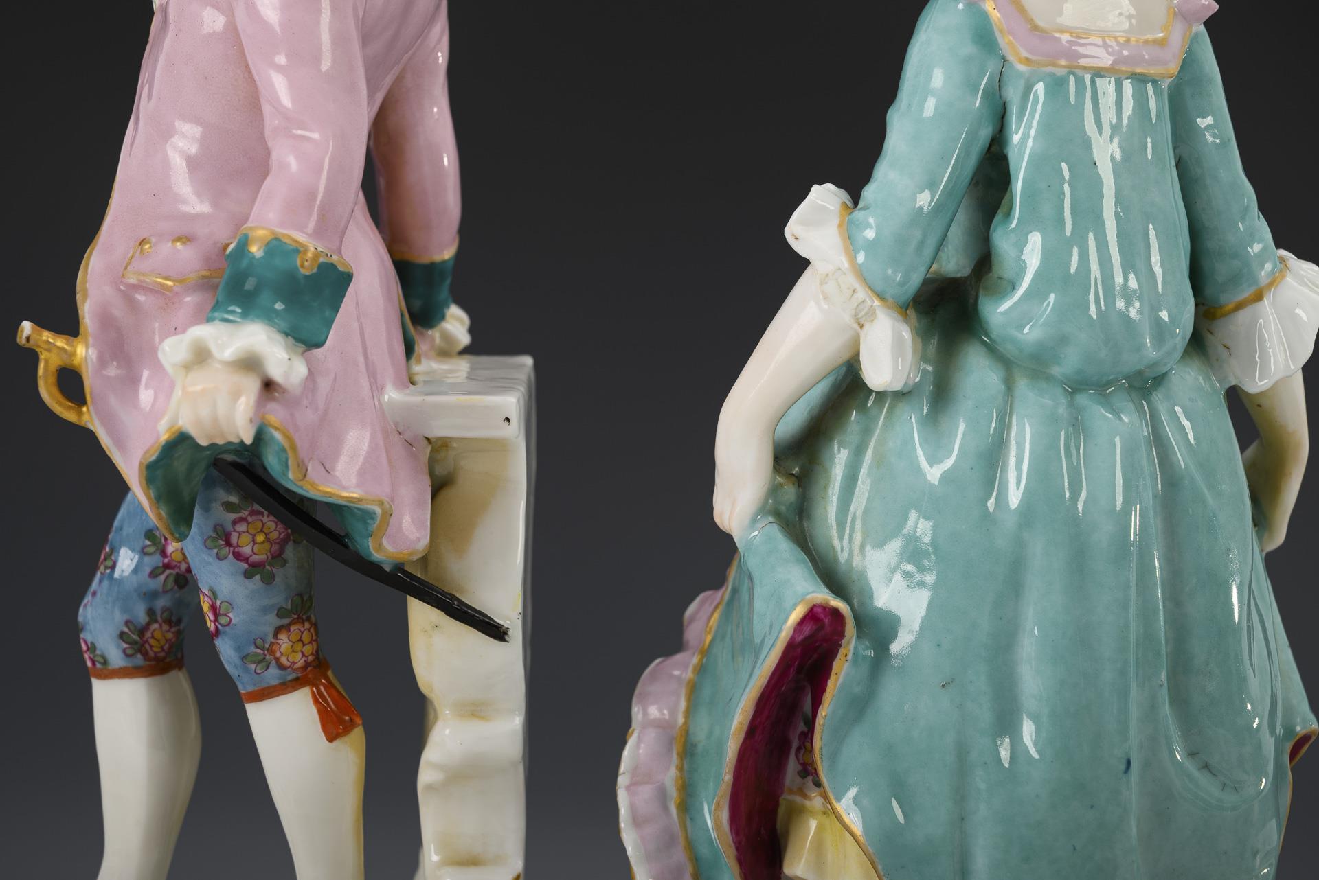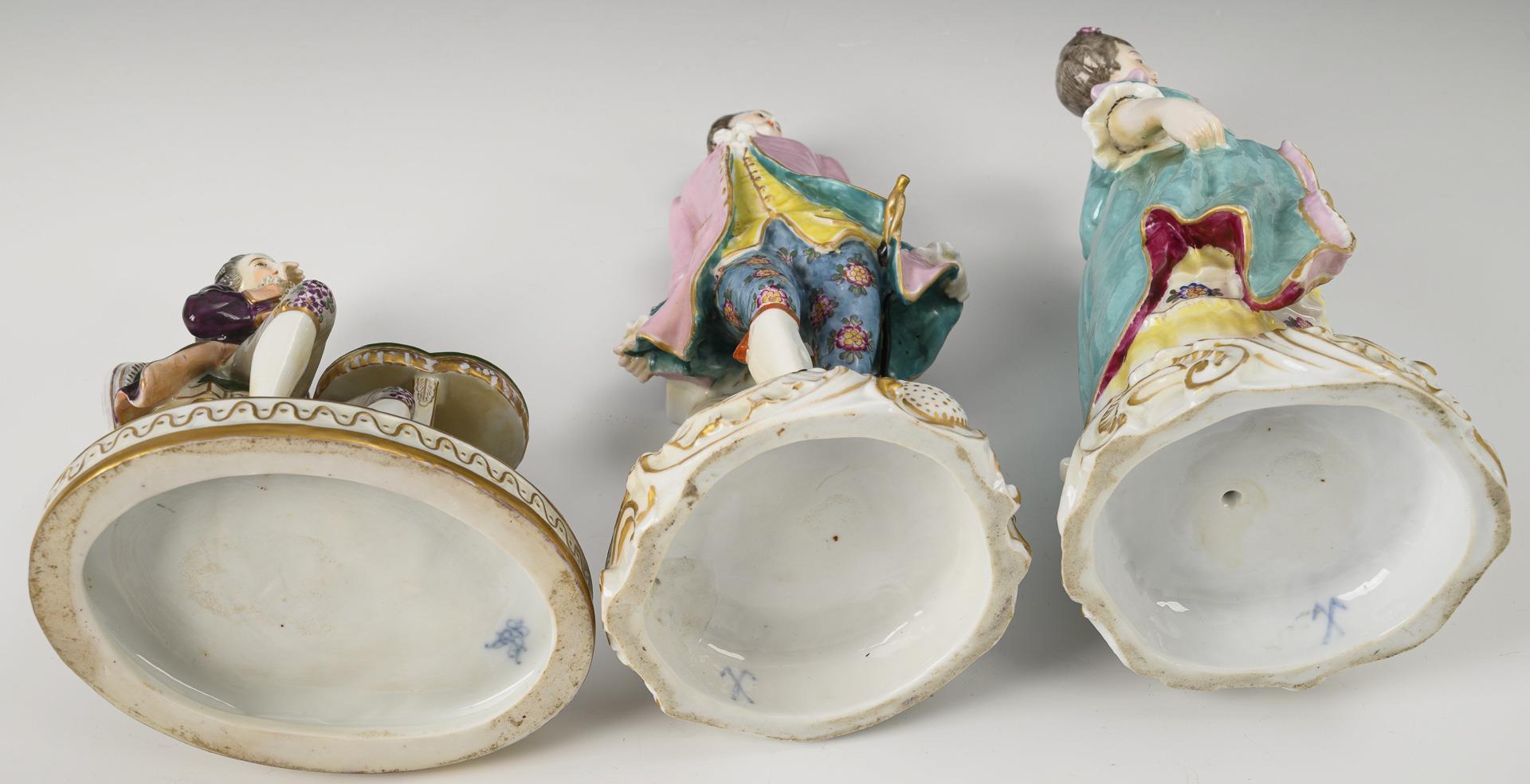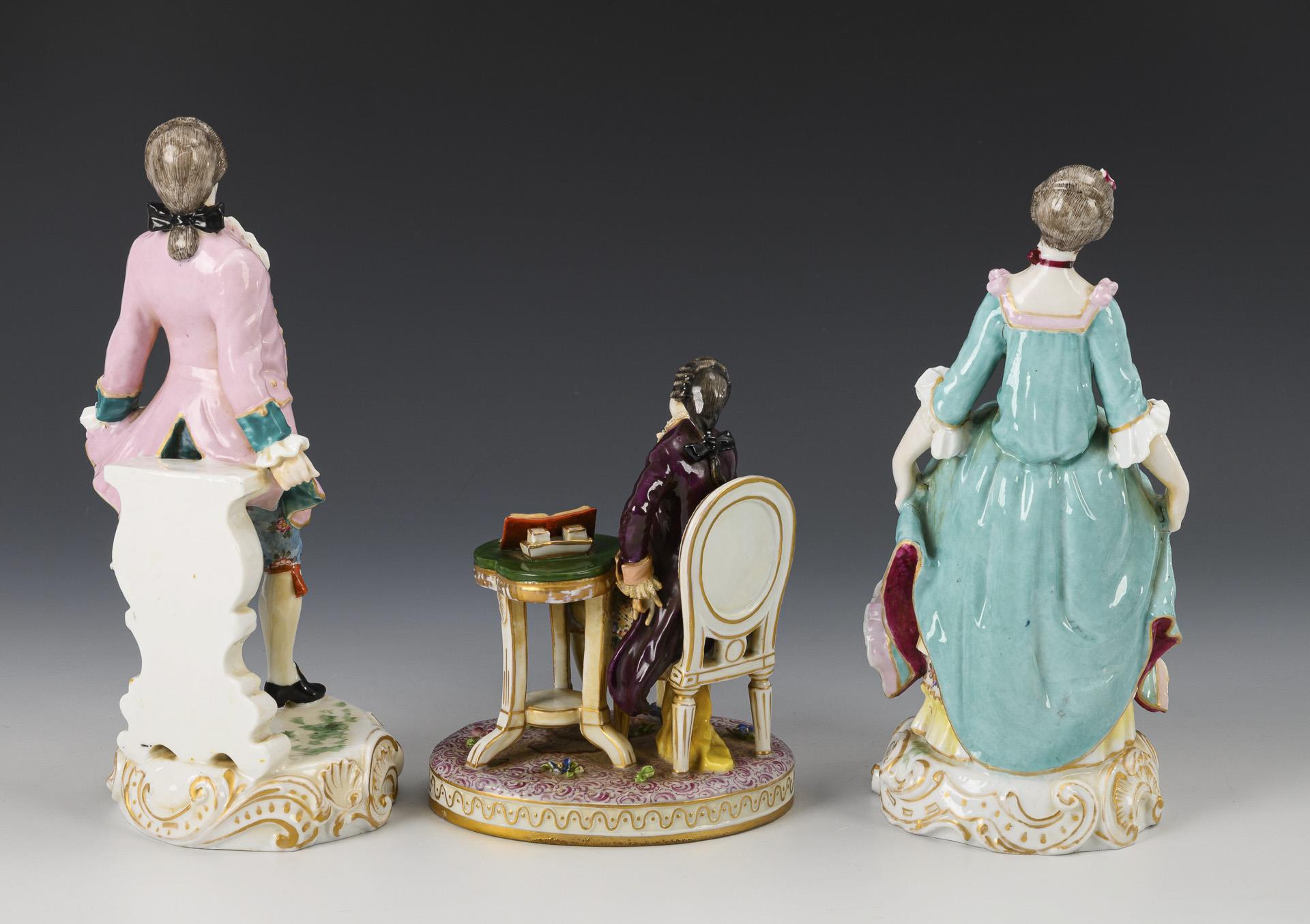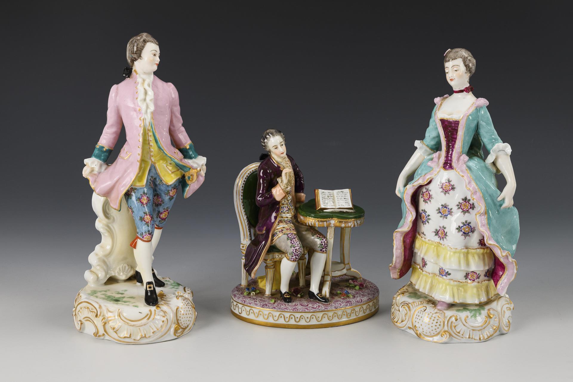 2x FONTAINEBLEAU, 1862: Rokokodame (H 24 cm) und Rokokokavalier (H 25 cm) je auf einem Rocaillesockel stehend. / 1x AELTESTE VOLKSTEDTER, ab 1915: an einem dreipassigen Tisch mit Buch und Feder sitzender Rokokoherr (H 16,5 cm). Partieller Goldabrieb, Rokokodame mit vereinzelten Brandrissen.