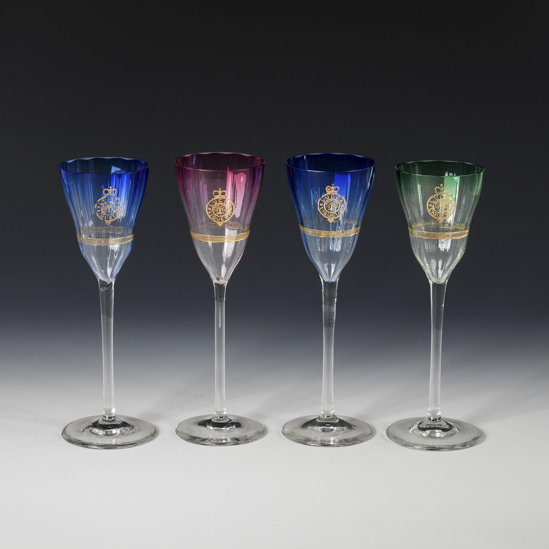 Längsoptisch gerippte, schlank glockenförmige Kuppa, Stängel und Rundfuß. Schauseitig auf der Kuppa ein geätztes und vergoldetes Logo mit der Bezeichnung "LUCCA LIQUEUR 1900". Partiell minimale Chips am Mündungsrand.