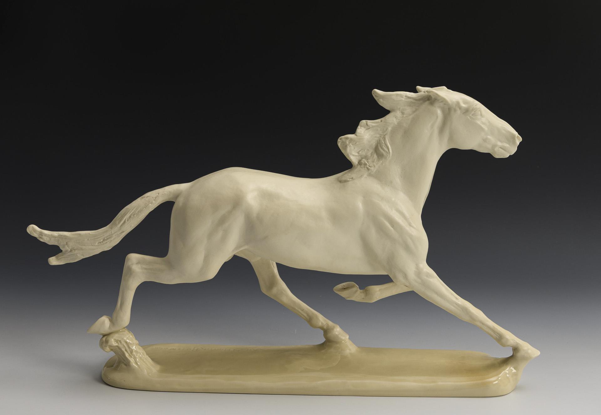 Weiße Biskuitplastik des Trabers Hannibal, glasierter Sockel.