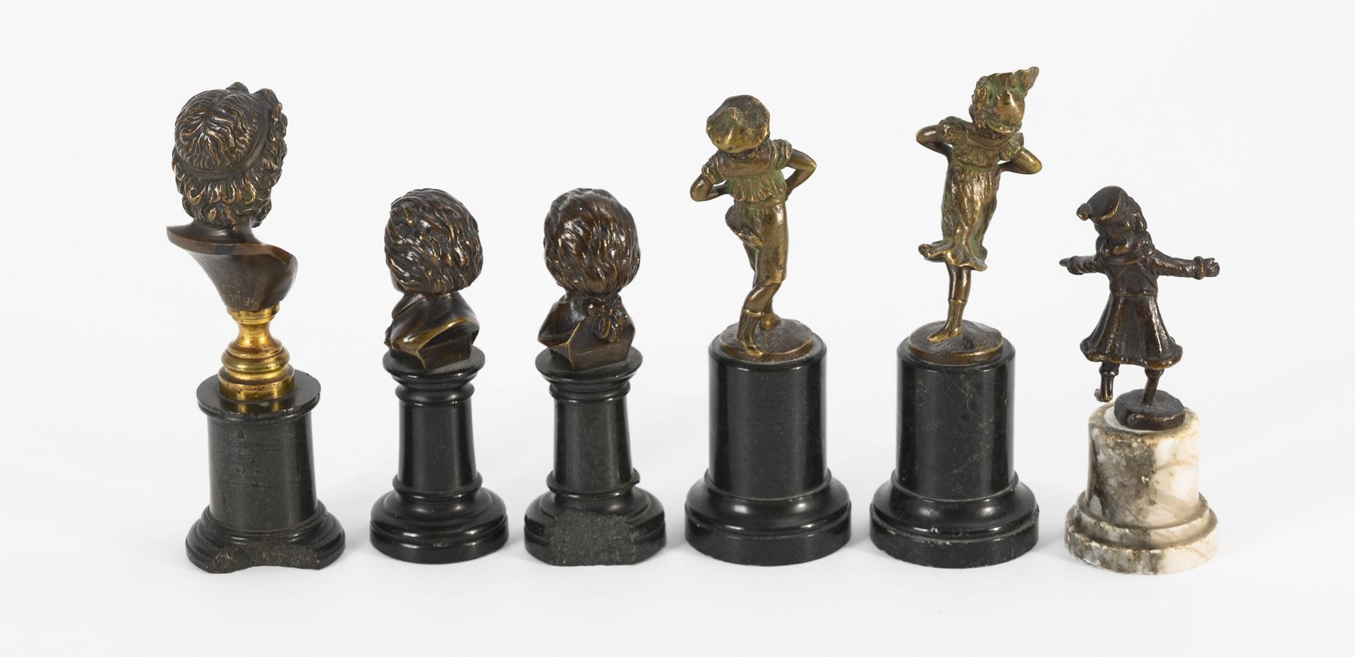 Je "Iffland" signiertes Paar ausgelassen tanzender Kinder. / Paar Musikerbüsten: Beethoven bzw. Mozart. / Zeusbüste nach der Antike. / Schlittschuh fahrendes Mädchen. Zeus mit Kerbe an der Nase und Kratzern hinten. Große Ausbrüche an den Serpentinsockeln von Zeus und Mozart.