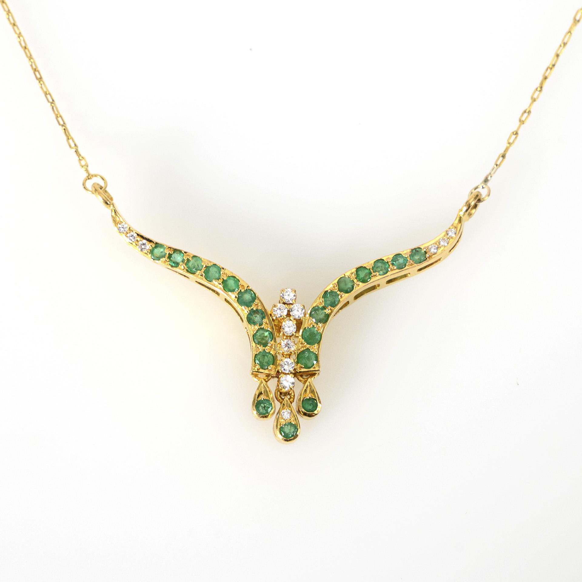 Elegant geschwungenes Collier mit einem Besatz aus grünen Farbsteinen, wohl Smaragden, und Brillanten, unterseitig mit 3 kleinen pampelartigen Abhängungen.