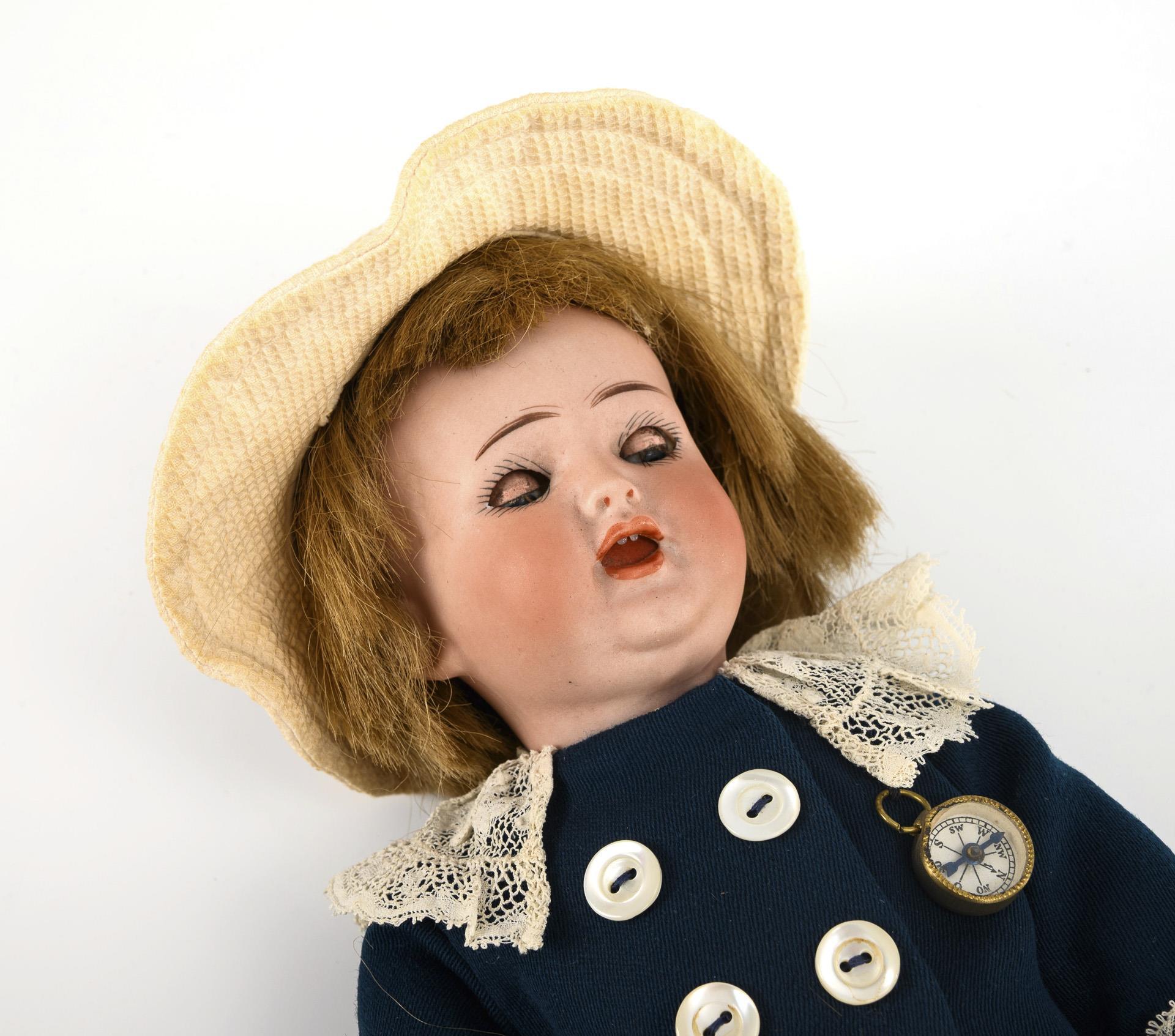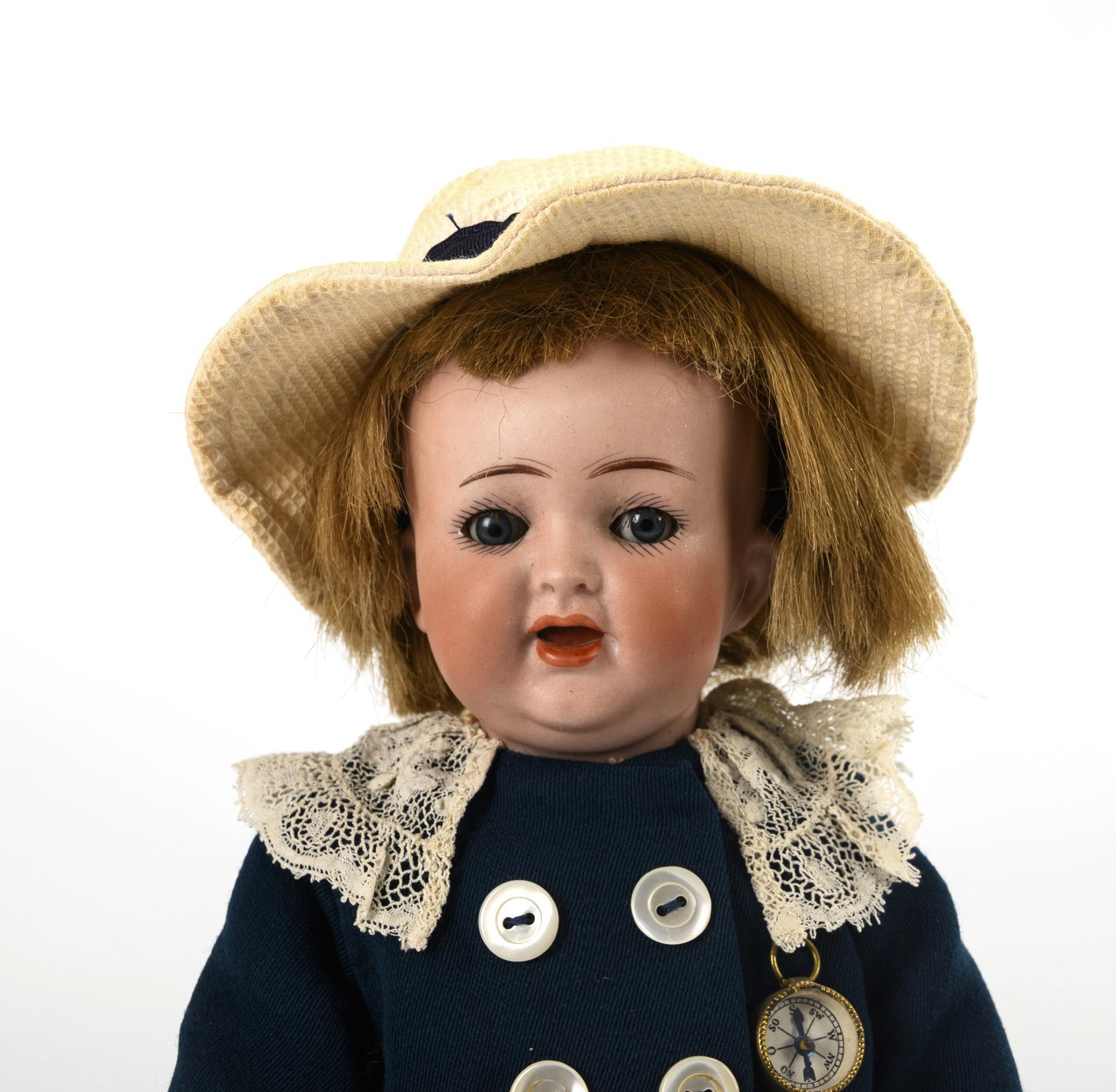 Kurbelkopf, blaue Schlafaugen, blonde Echthaarperücke. 11-teiliger Toddlerkörper. Petrolfarbener Anzug, weißer Hut, schwarze Filzschuhe. Kopf durchleuchtet: ohne Risse, lediglich 2 winzige Chips in den Augenwinkeln.
