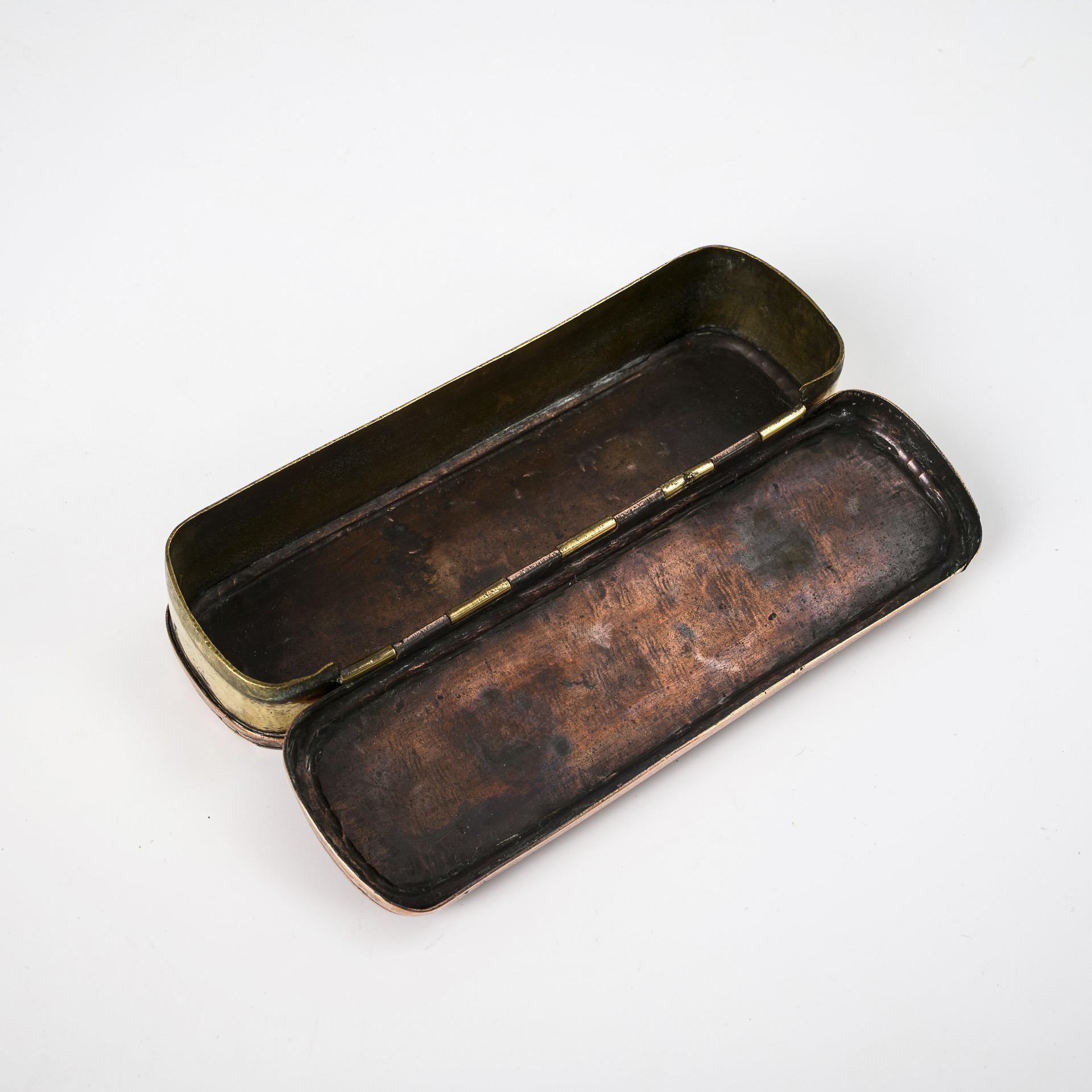 Boden und Deckel Kupferblech geprägt, Messingblech-Wandung. 3 x 15 x 4,5 cm.