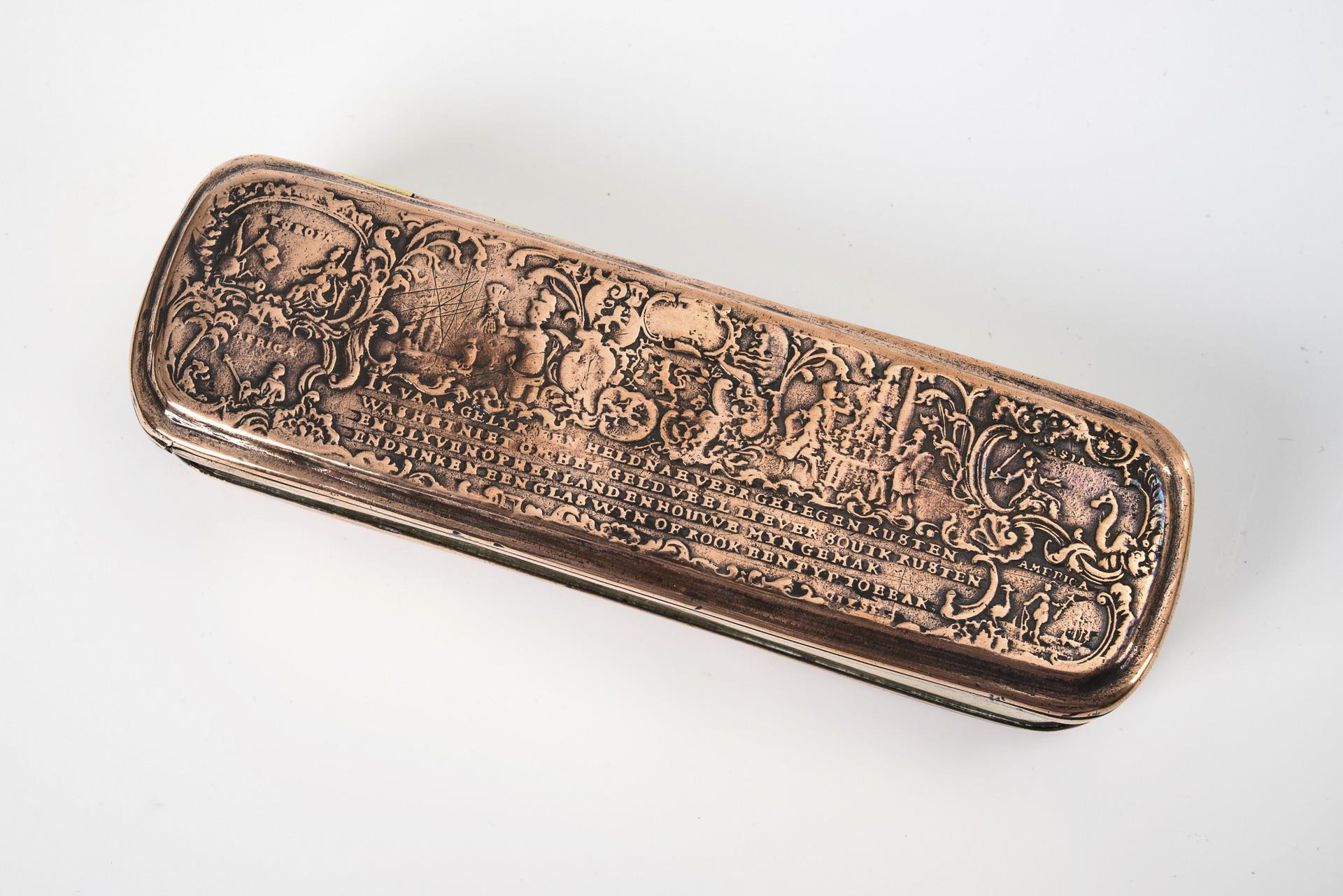 Auf dem Scharnierdeckel einige Kartuschen mit Wappen, flankiert von Allegorien der Kontinente Asien, Amerika, Afrika und Europa sowie holländischer Inschrift, den Handel und die Seefahrt preisend. Auf dem Boden Kauffahrteiszene mit holländischer Beschriftung sowie Rocaillen- und Blütenrahmung. Kleines Bohrloch in der Wandung hinten, kleine Fehlstelle der Wandung von außen nicht sichtbar, teils stärkere Alters-/Gebrauchsspuren.