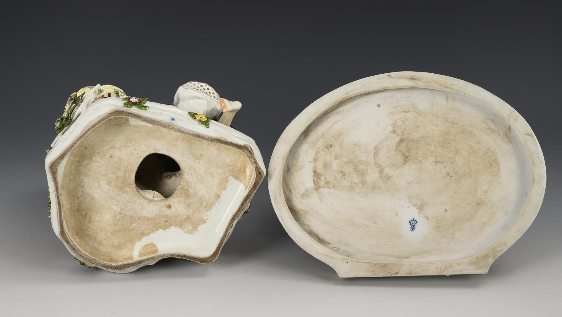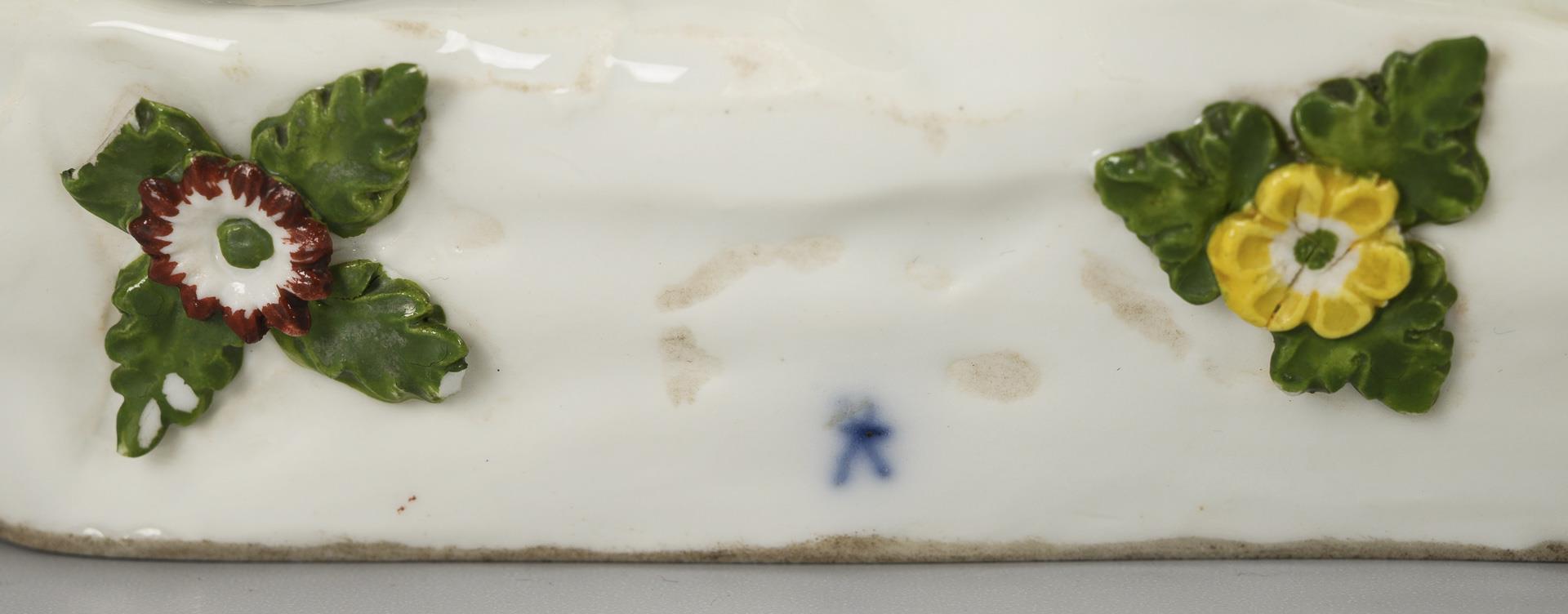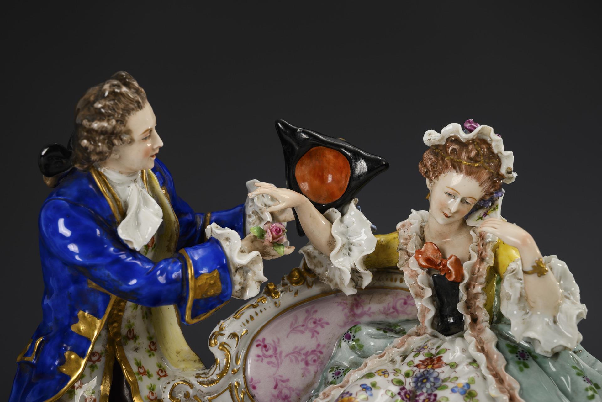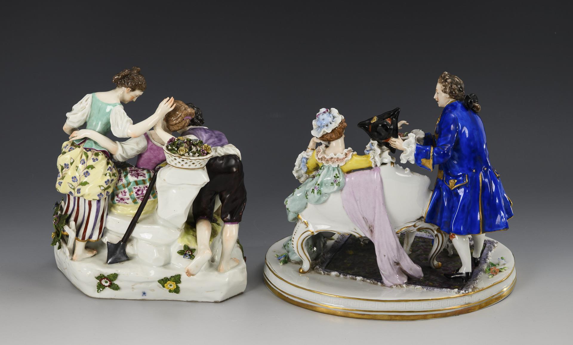 1x SAMSON, 2. H. 19. Jh.: dreifigurige Gärtnergruppe auf einem blütenbelegten Felssockel. / 1x SITZENDORF, 2. H. 20. Jh.: sitzende Rokokodame sowie ein an sie herantretender, ihr eine Rose reichender Kavalier. Gärtnergruppe: Bestoßungen an Blüten und Blättern.