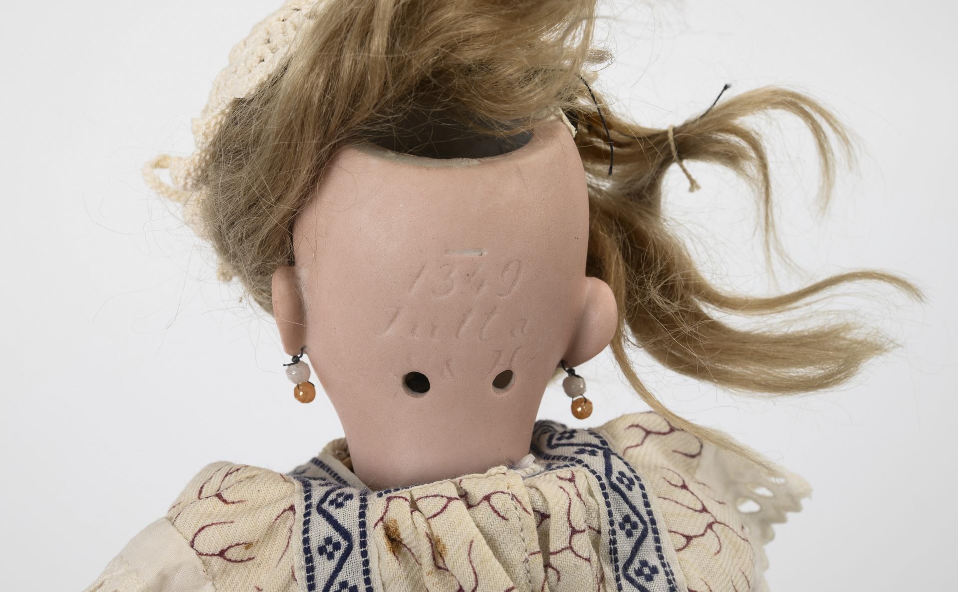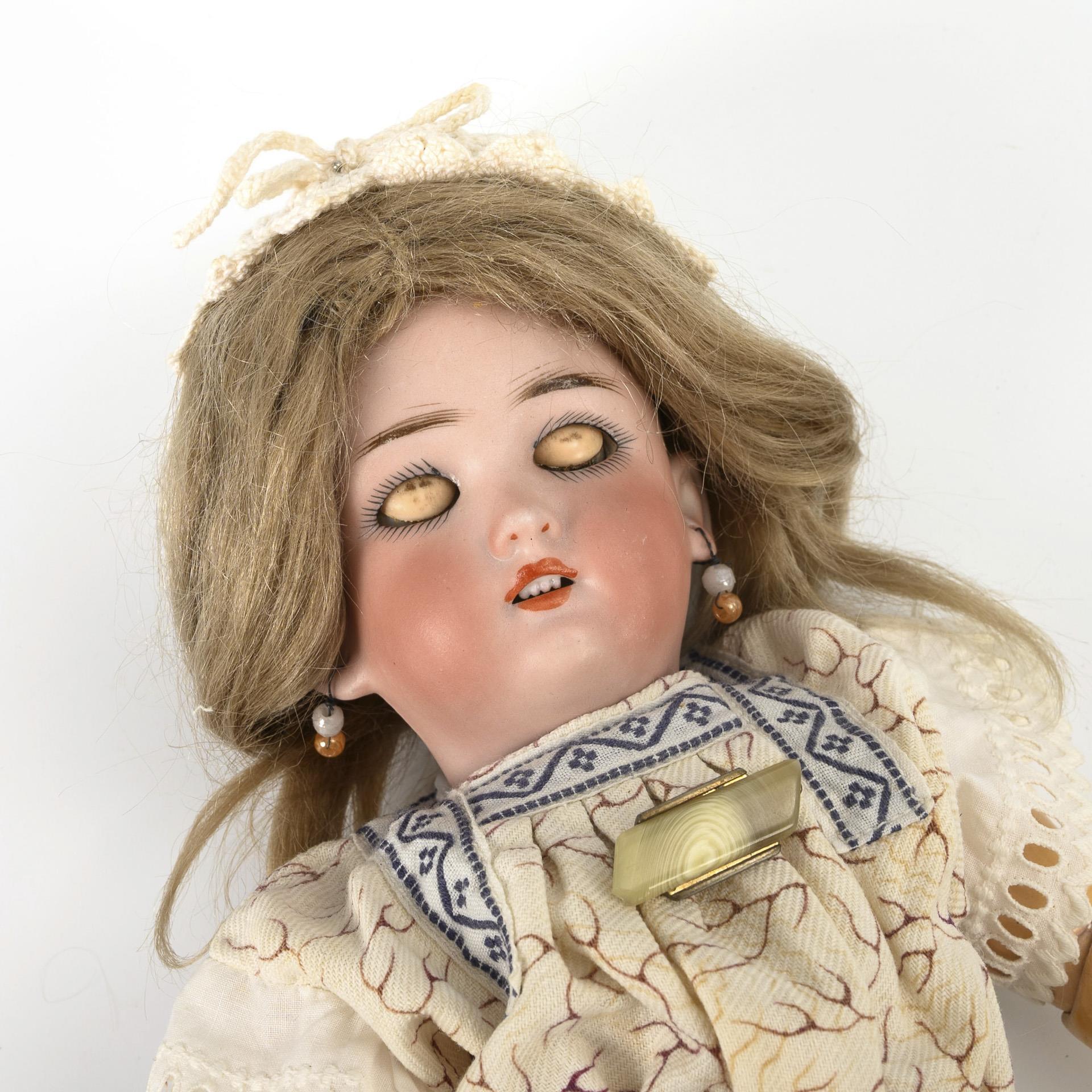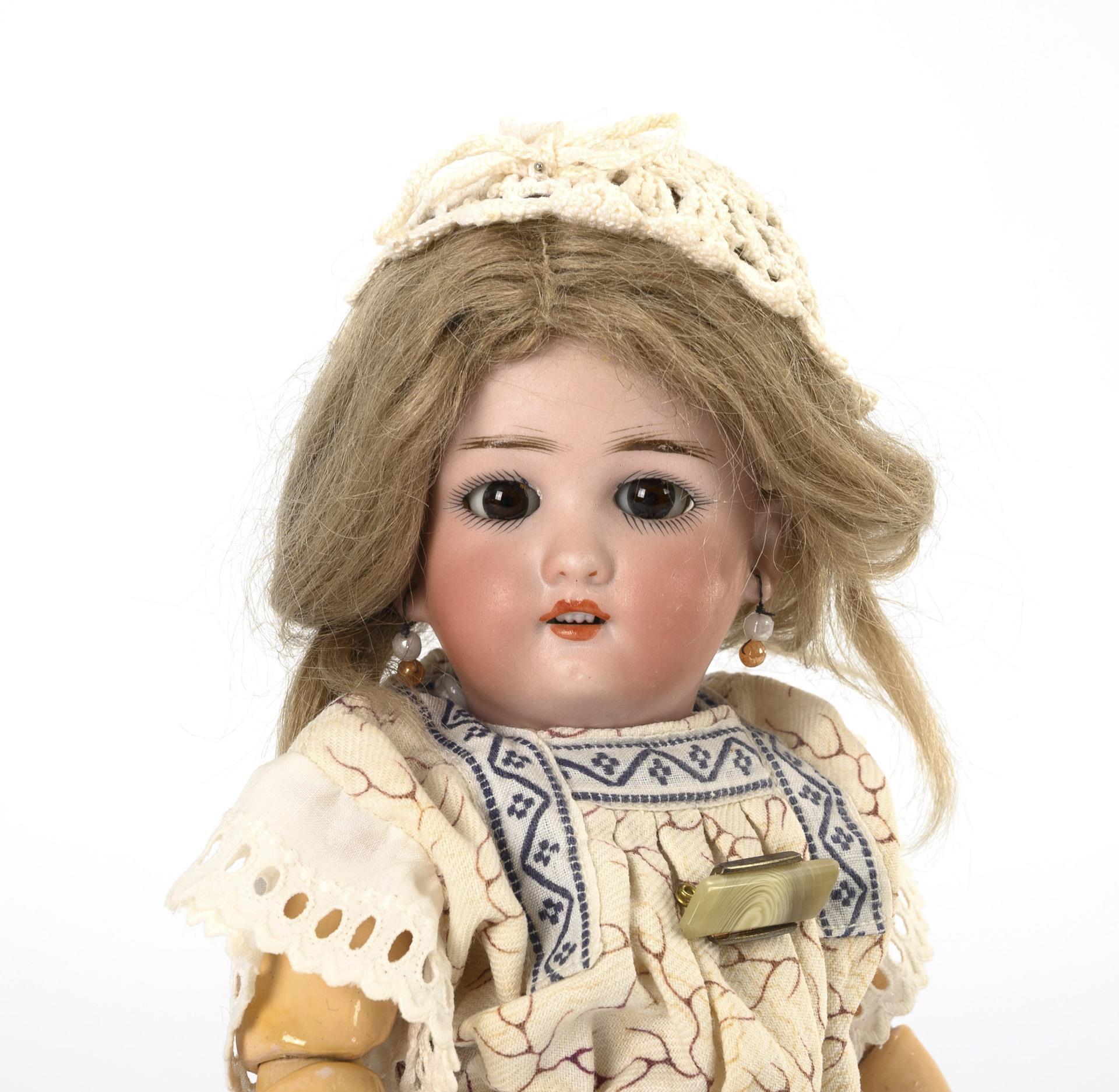 Kurbelkopf, braune Schlafaugen, blonde Mohairperücke, 15-teiliger Gliederkörper, helles Kleid, Häkelhäubchen, rote Schuhe. Kurzer Haarriss? (oder Kratzer) am Hinterkopf.