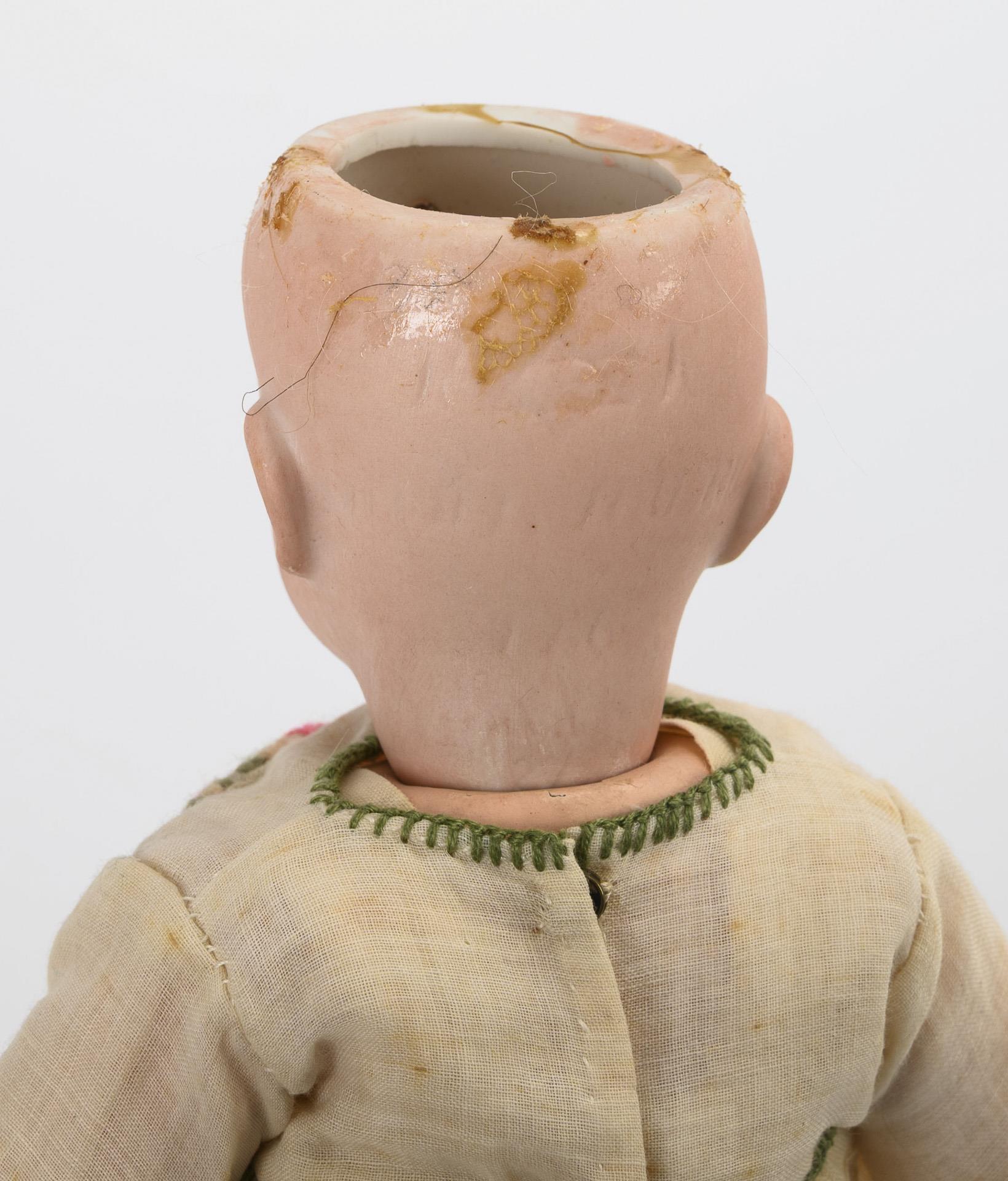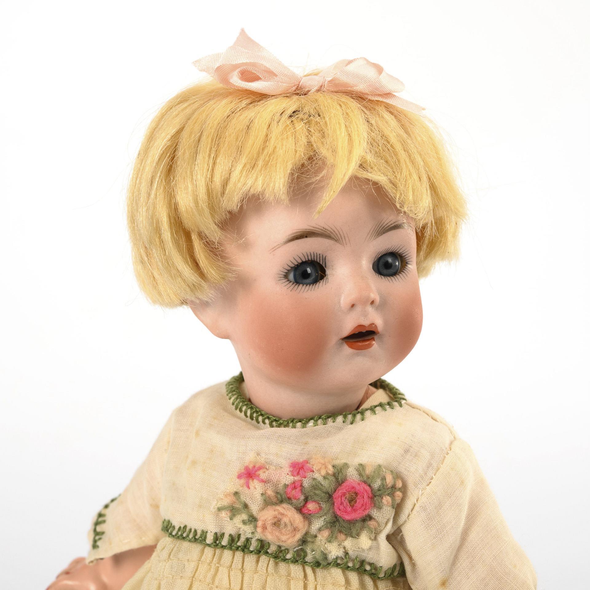 Kurbelkopf, blaue Schlafaugen, Mohairperücke, 5-teiliger Stehkörper mit abgespreizten Händen in Googlie-Art. Helles Kleid mit Stickerei, schwarze Schuhe. Kopf durchleuchtet: ohne Defekte.
