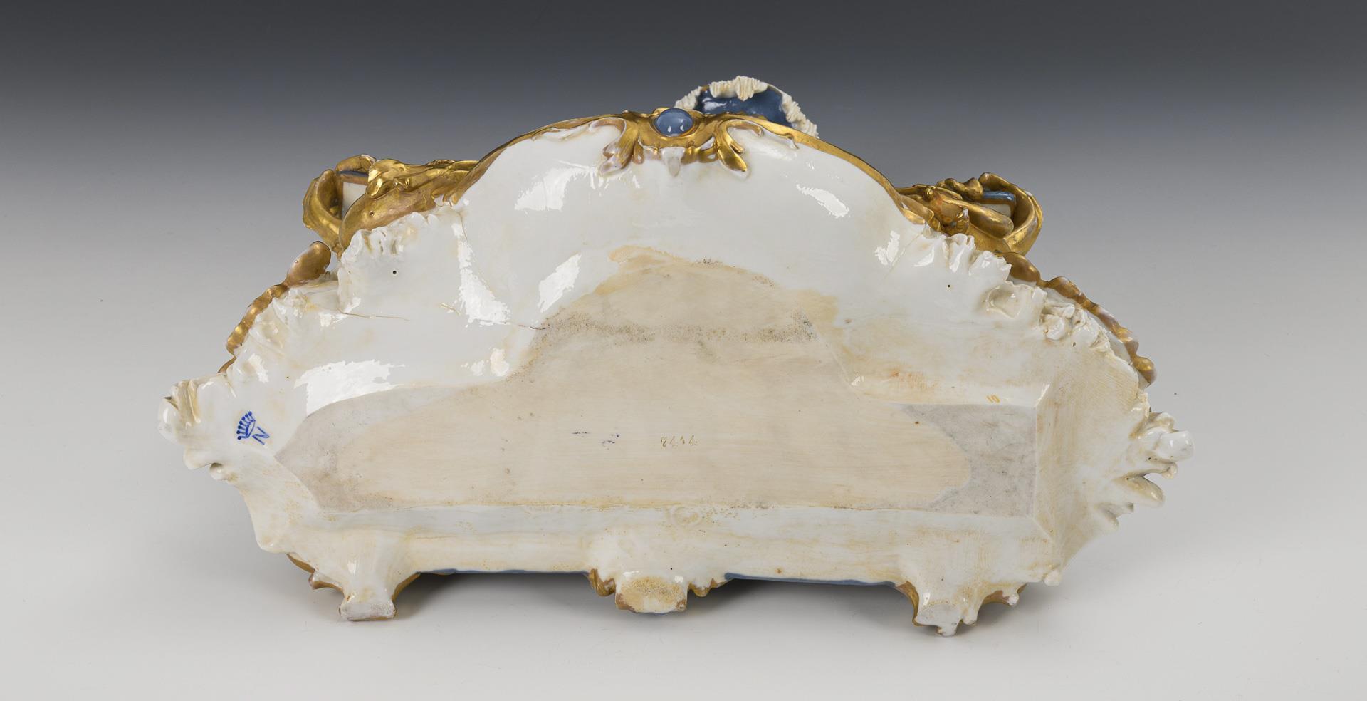 Rechteckige, in Form eines Brunnens gestaltete Jardiniere mit Delfinen und Maskaronspeier, auf der Jardiniere zwei ein Füllhorn als Vase tragende Putten. Partieller Goldabrieb, 1 Delfinflosse bestoßen, Brandriss im Bart des Maskarons.