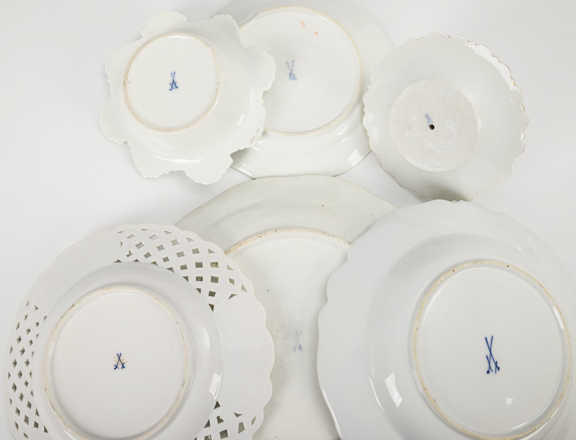 1x um 1750: Teller "Altozier" (Ø 26,5 cm). / 4x ab 1850-1924, 1. Wahl und 4 Schleifstriche: Suppenteller (Ø 22,5 cm), Durchbruchteller (Ø 20,5 cm), Ascher "Rote Rose" (Ø 14,5 cm) und Relief-Handleuchter (Ø 13 cm). / 1x 1934-1945, 4 Schleifstriche: Salatteller "Neuer Ausschnitt" (Ø 18 cm). Barocker Teller und Handleuchter berieben, Bestoßung am Standring des Salattellers, Randausbruch am Ascher, Haarriss an der Fahne und Chips am Rand des Kerzenleuchters.
