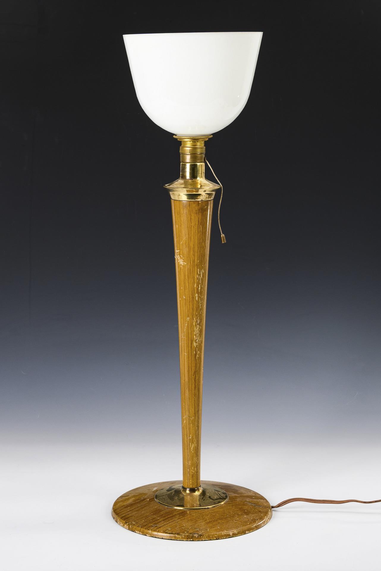 Eisen und Holz je holzfarben lackiert, Eisen vermessingt, Messing, Milchglas, Elektrifizierung mit Zugschalter an der Schraubfassung. H 71 cm, Ø Schirm 20 cm. 2,5 kg.