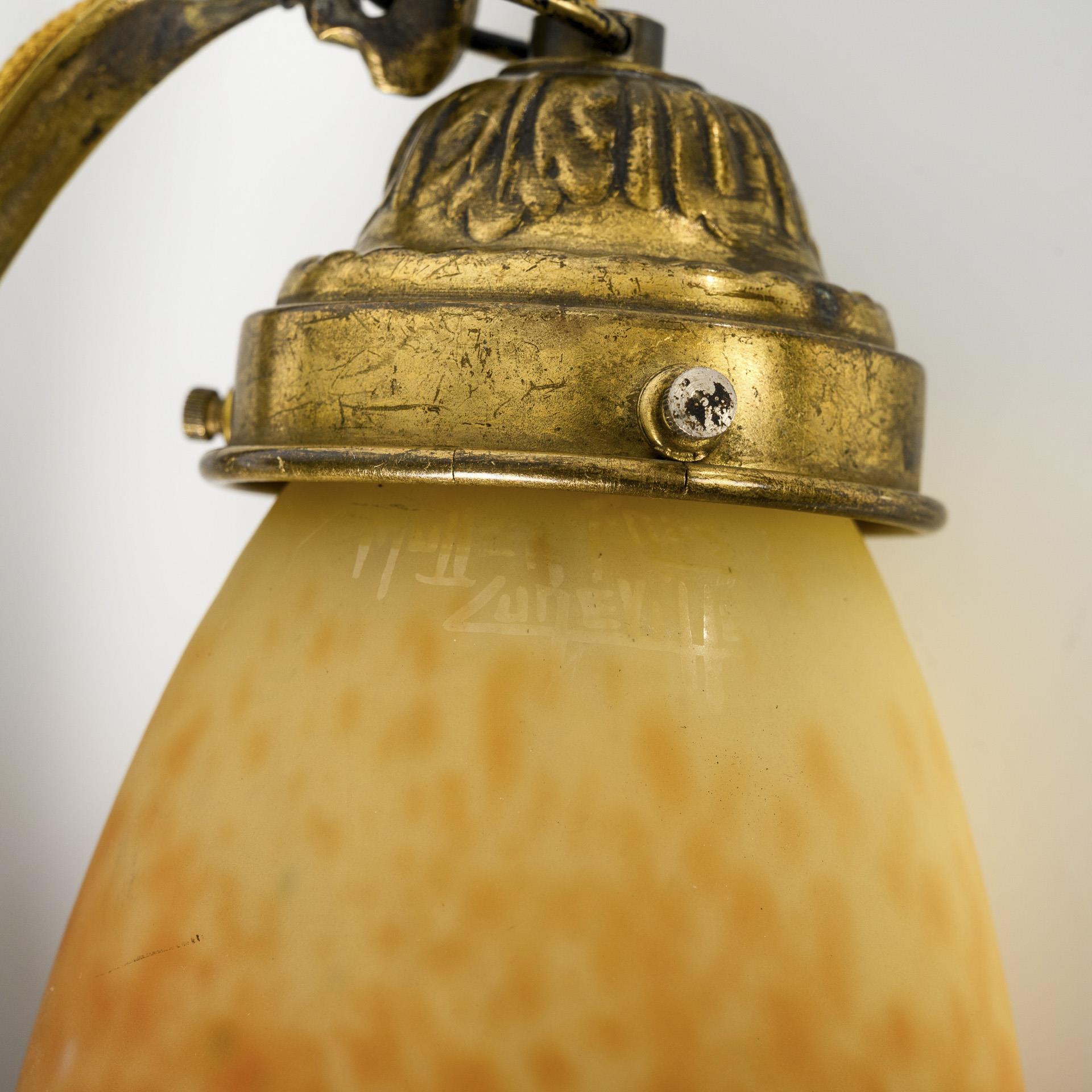 Geschweiftes Wandbrett mit Bronzehalterung für den Bogenarm, verzierte Fassung für den glockenförmigen Schirm. Holz wohl jünger mit Beizmattine gestrichen, Funktion nicht geprüft.