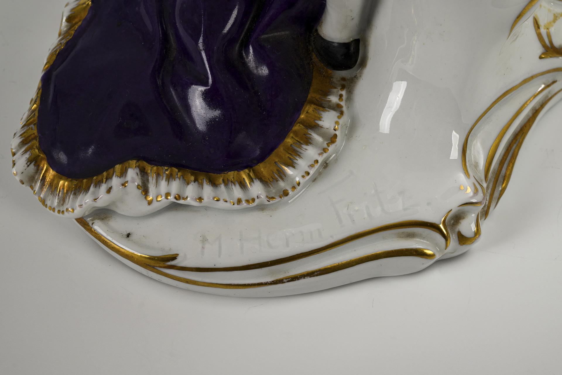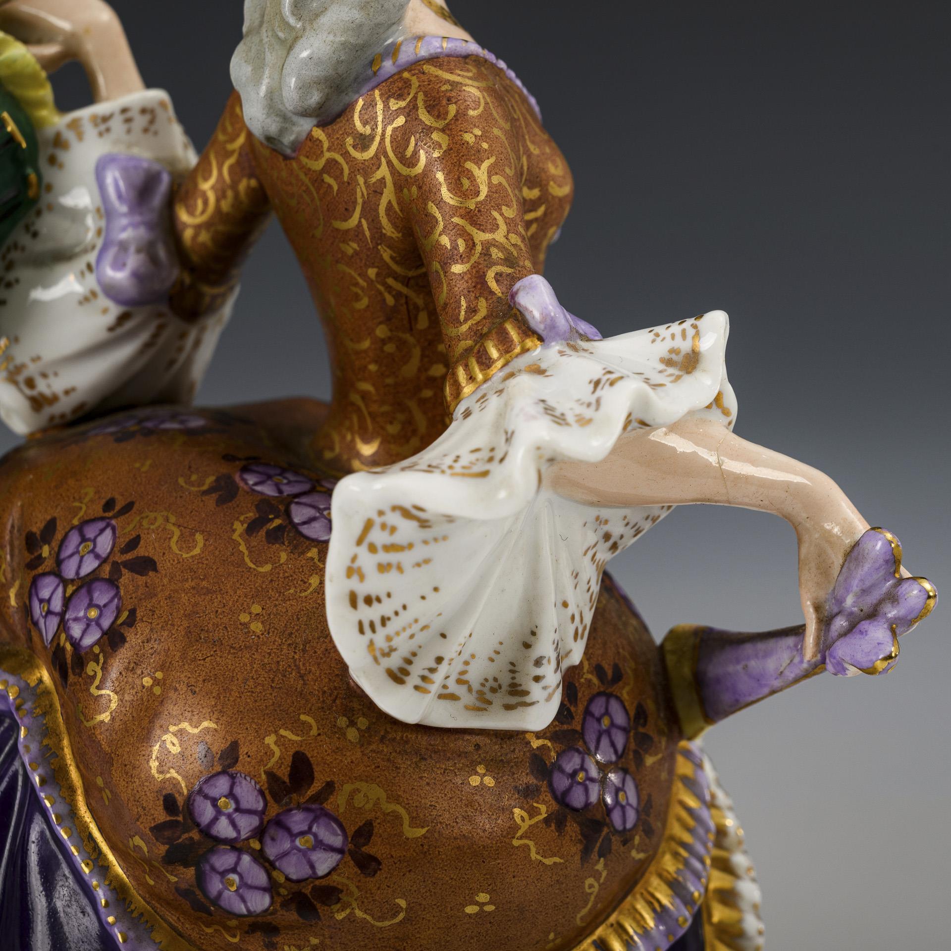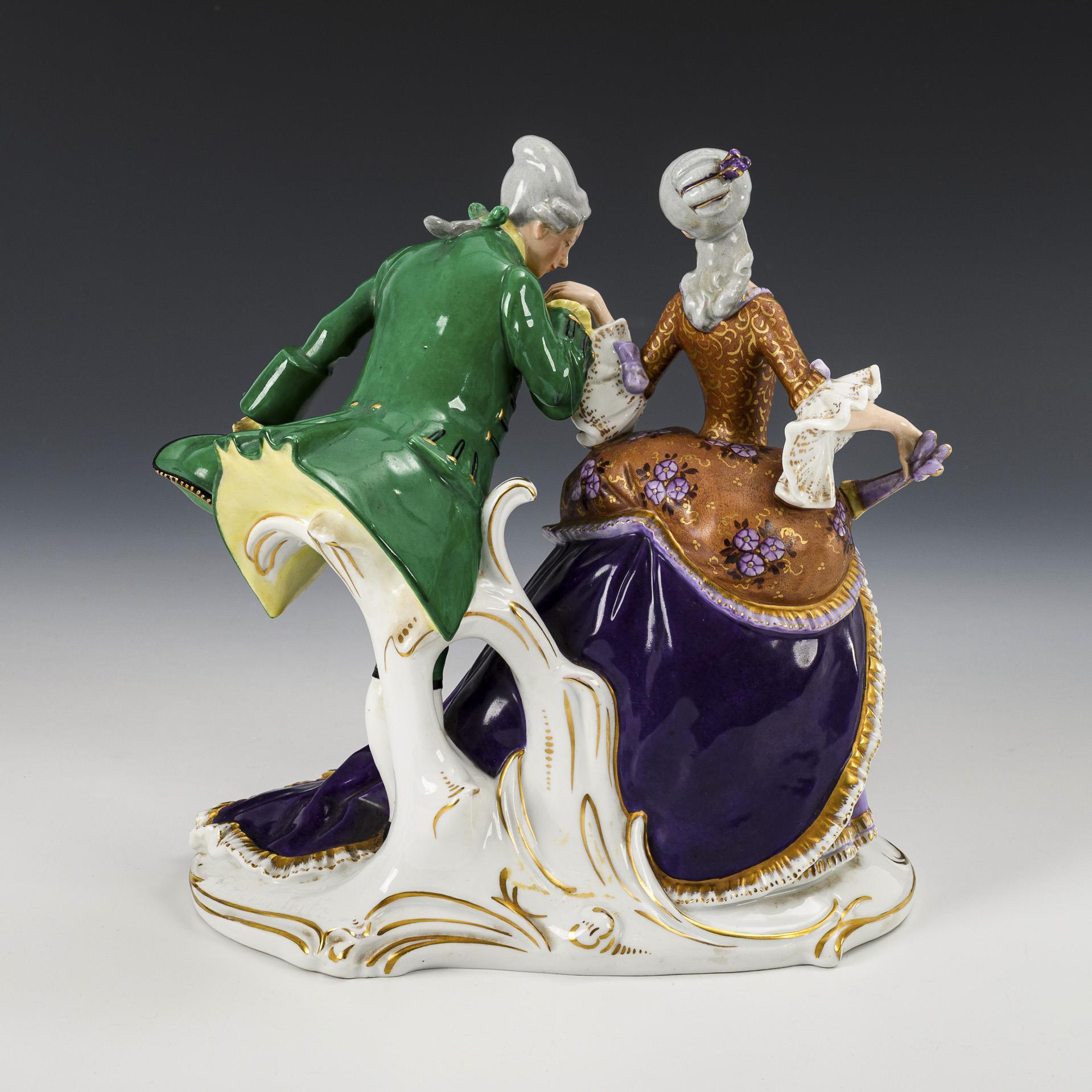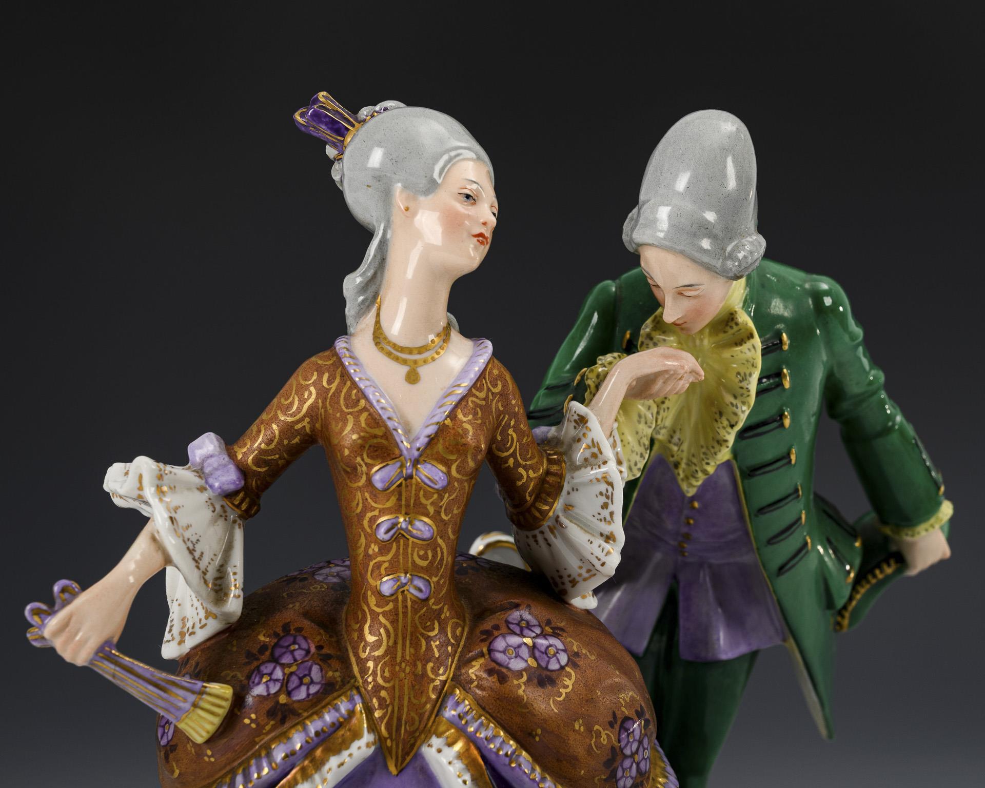 Rokokodame mit Fächer sowie Rokokoherr mit Dreispitz, der Dame die Hand küssend.