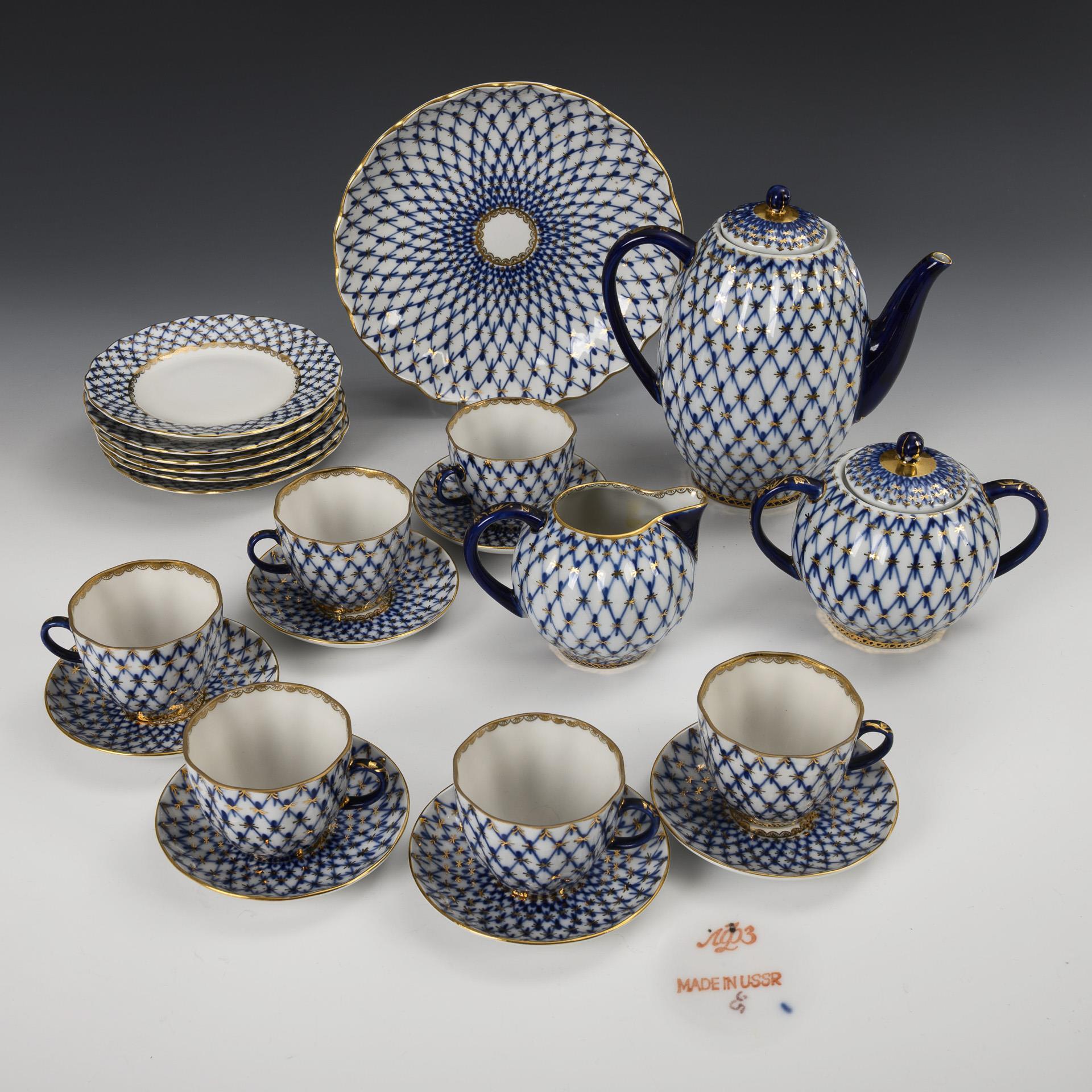 Kobaltblaues Netzmuster und Goldstaffage. H max. 19 cm. 3,7 kg.