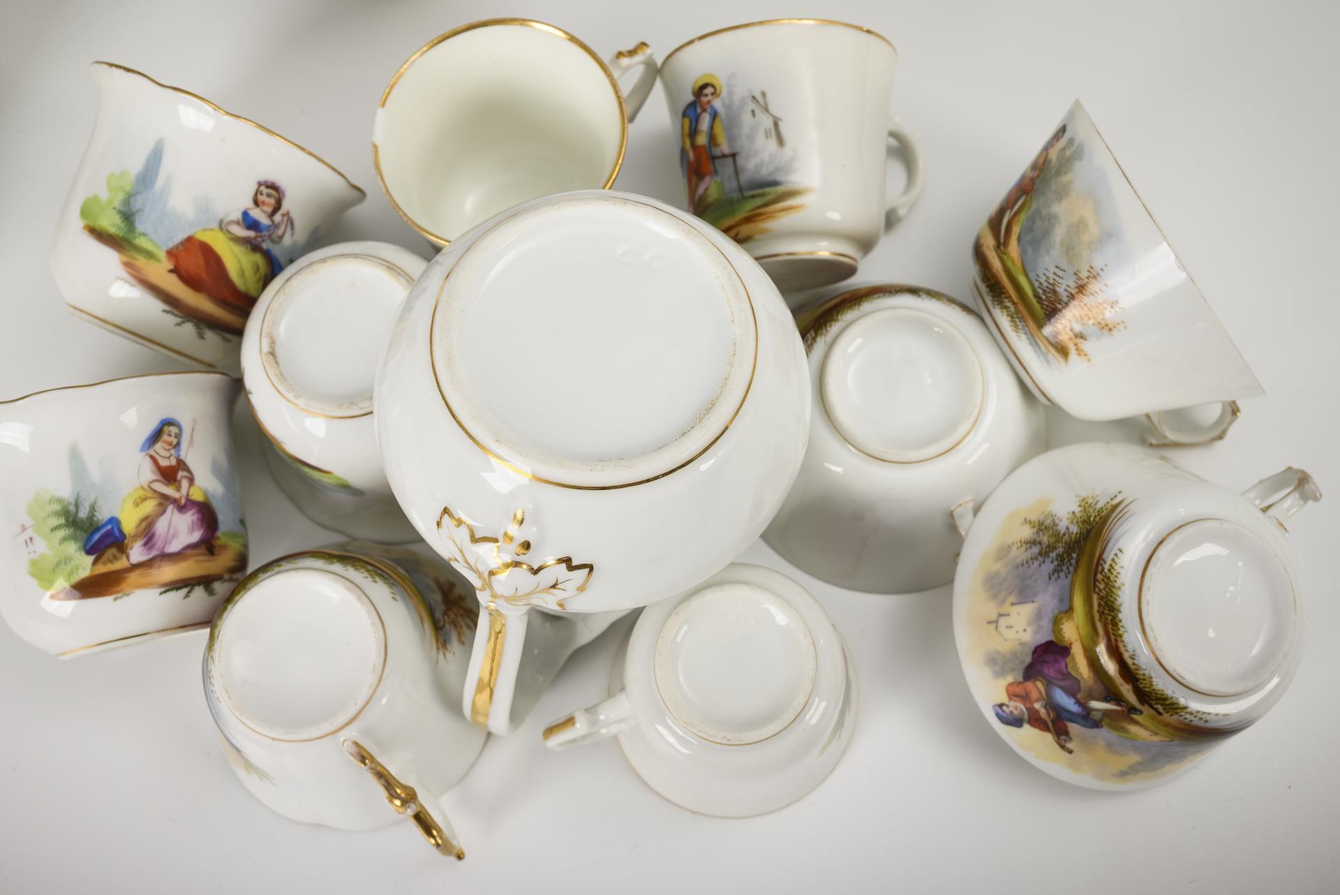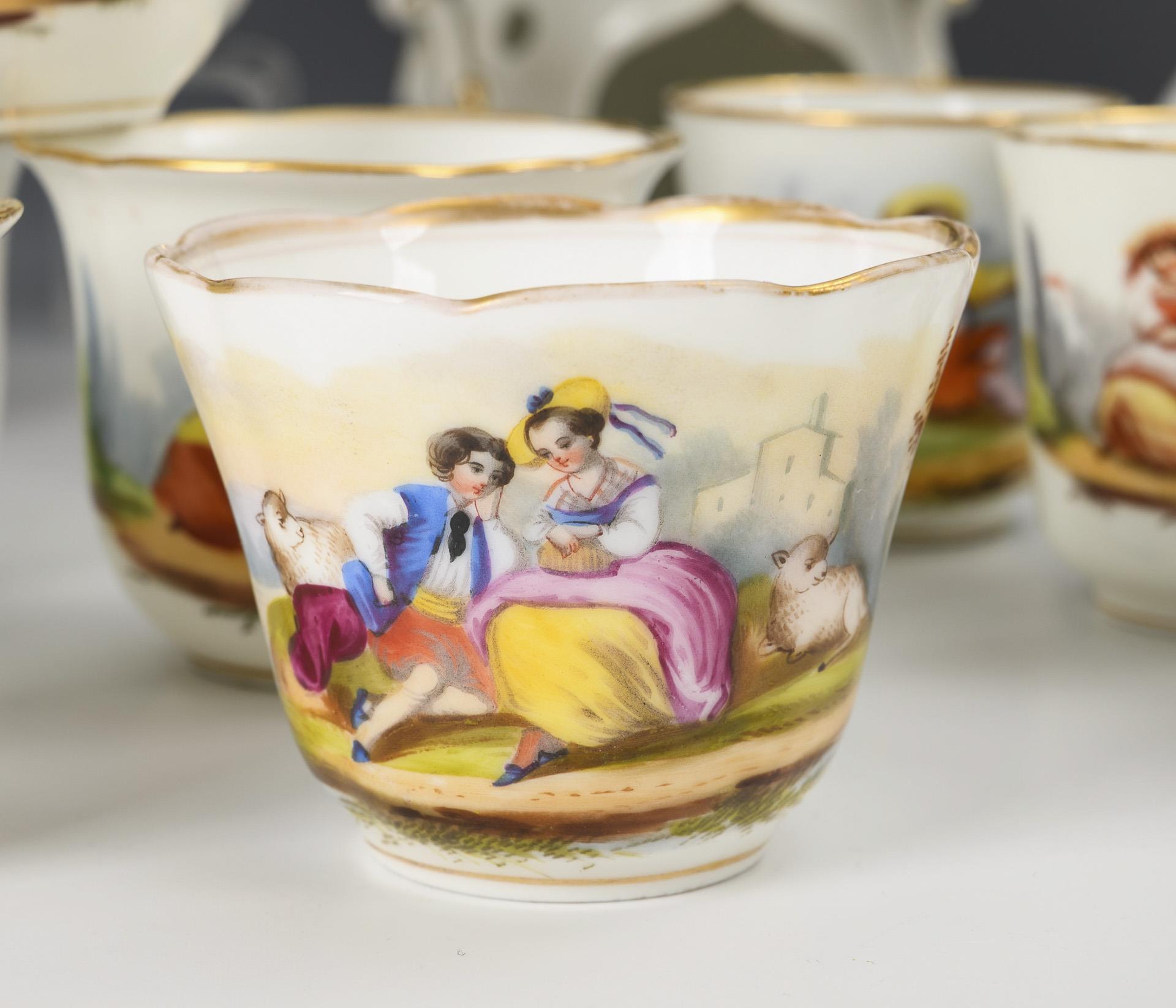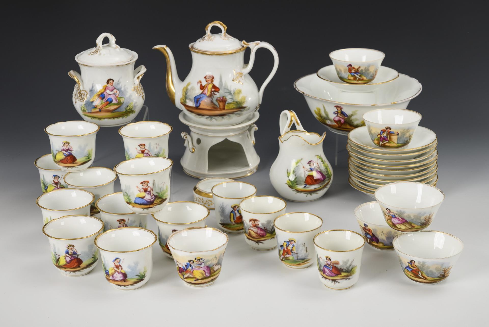 36+1 Teile. Bemalt mit Schäferfiguren und -szenen. Teekanne (H 16,5 cm), Milchkännchen, Zuckerdose, 10 + 5 + 4 + 1 Tassen (H 4,5-6,5 cm), 11 Untertassen, 1 Stövchen (H 9,5 cm) und 1 Kumme (Ø 21 cm). Dazu 1 zylindrischer Untersatz (Ø 7,5 cm). Gold teils berieben, Chip am Kannenrand, Schneppenspitze der Kaffeekanne geklebt, Bestoßung an 1 Tassenrand, Bestoßungen am Stand des Stövchens, Haarriss in 1 Untertasse.