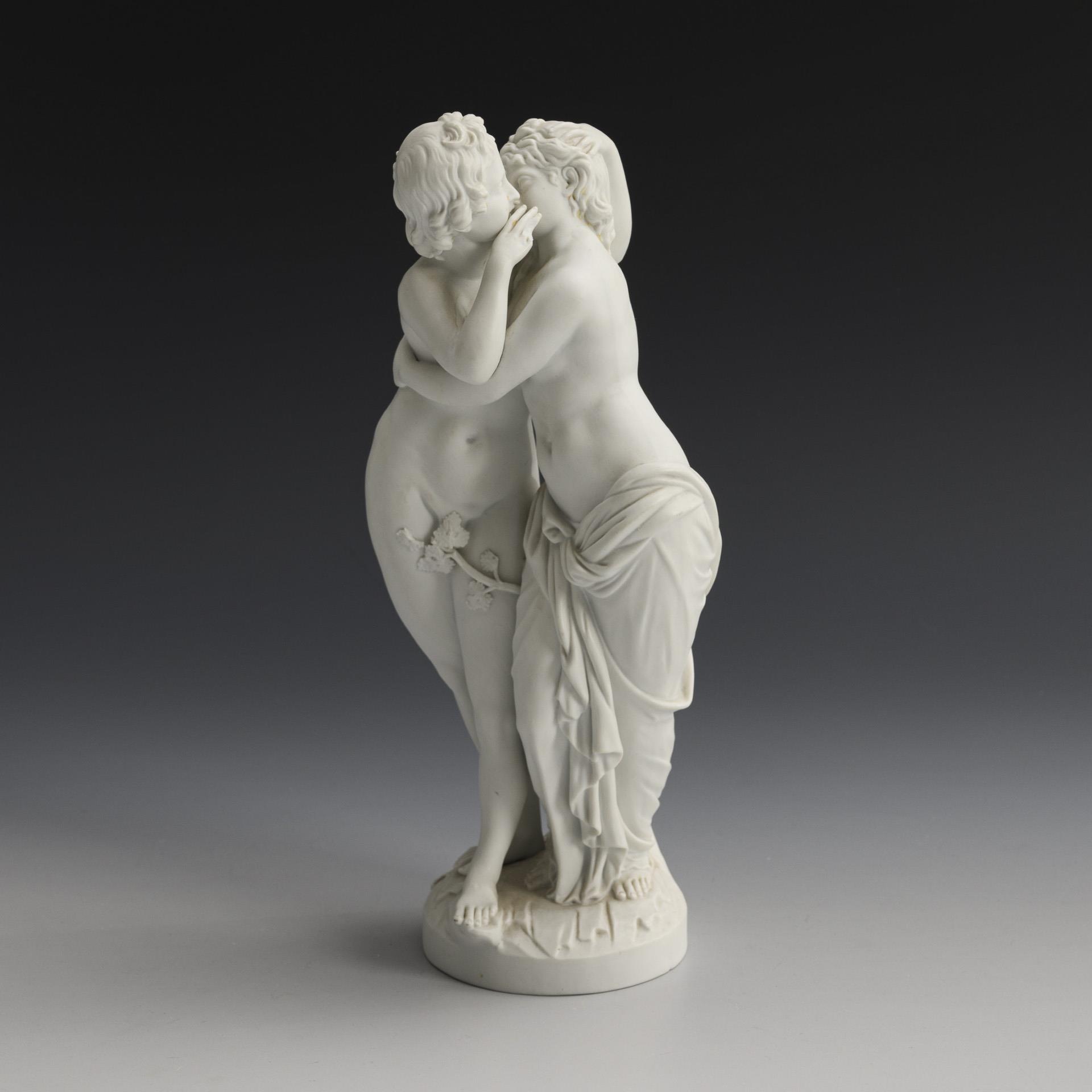 Biskuitplastik des stehenden, sich küssenden Paares. Flügel fehlen, 3 Blätter bestoßen, 2 Finger bestoßen.
