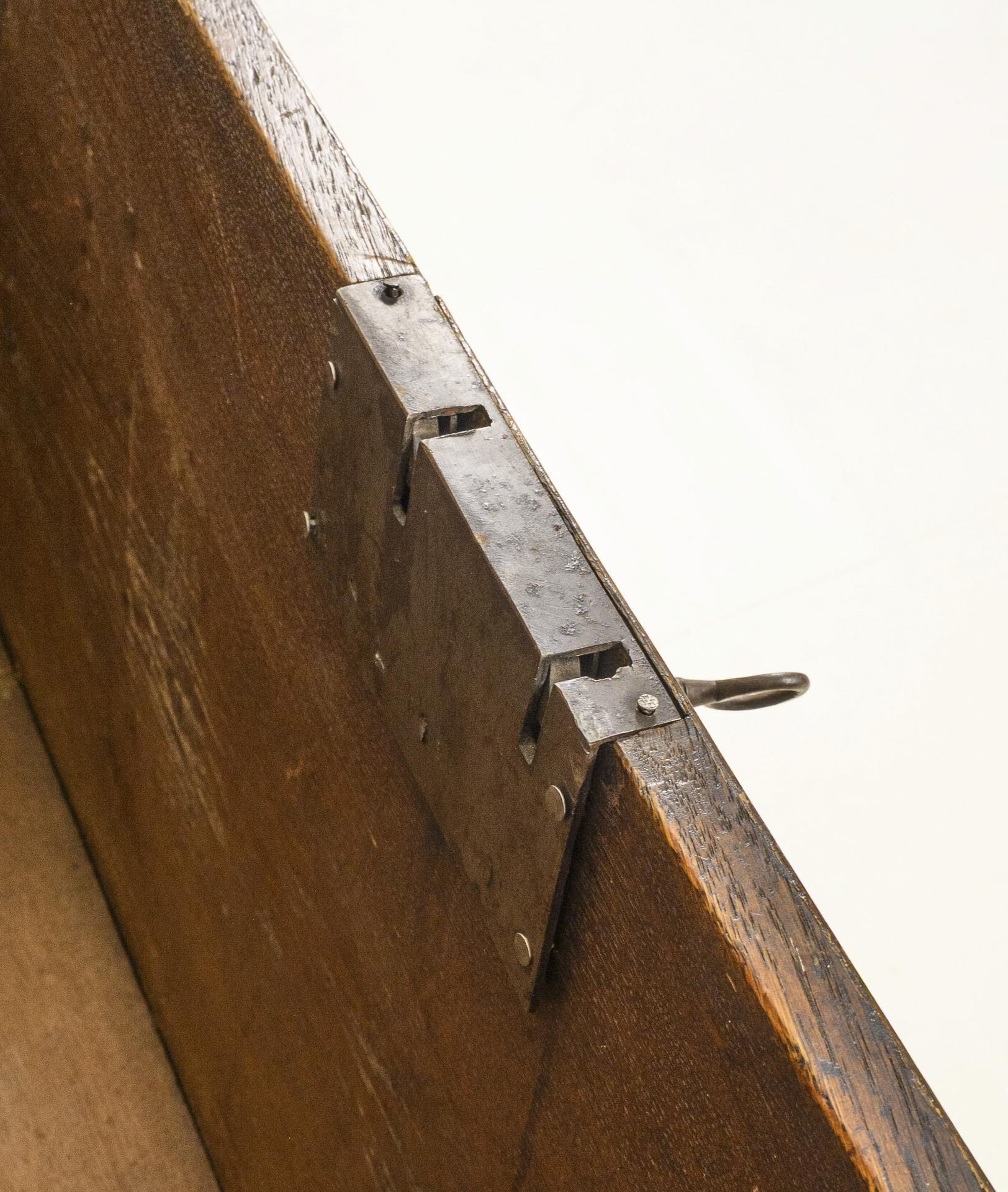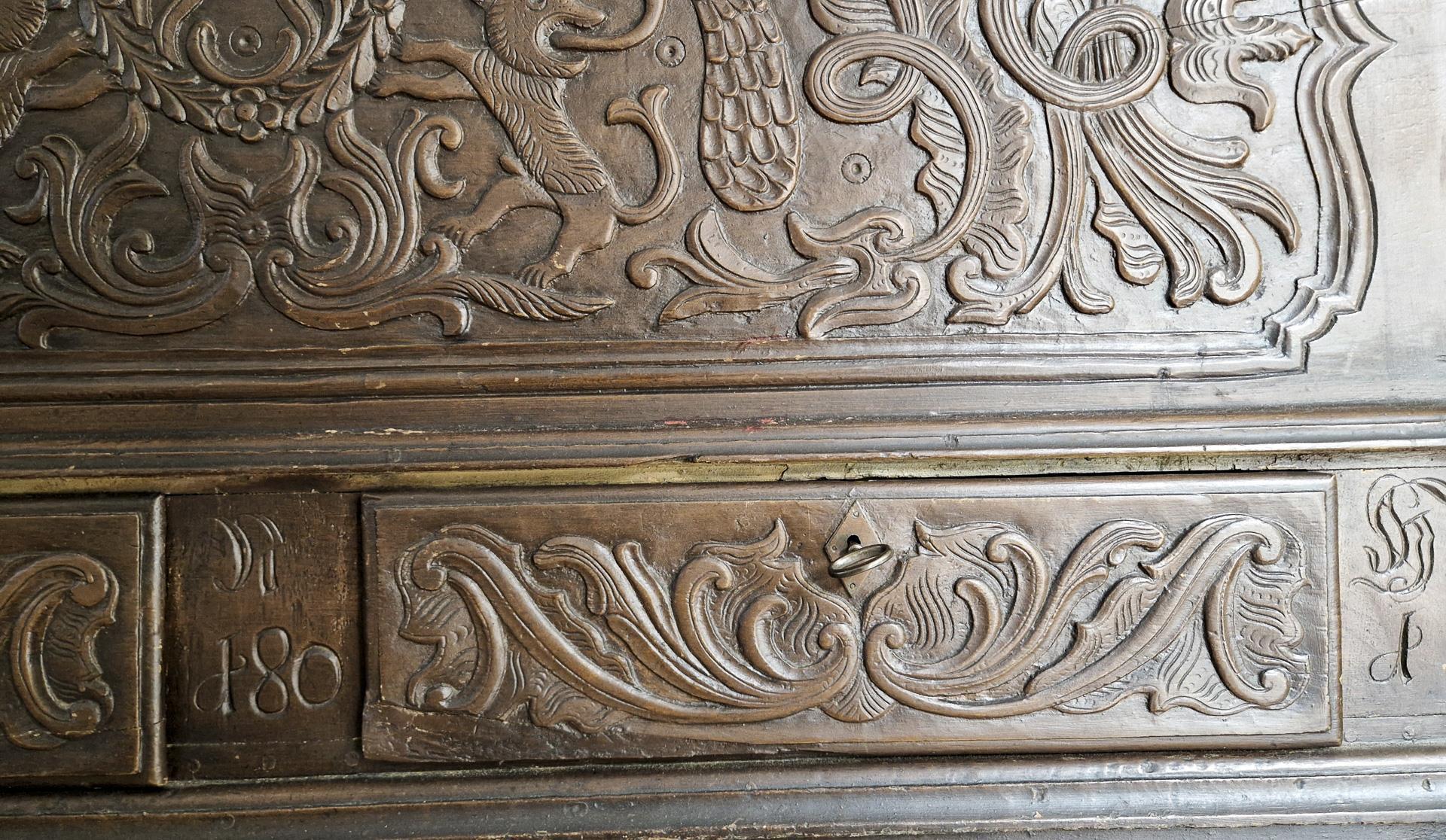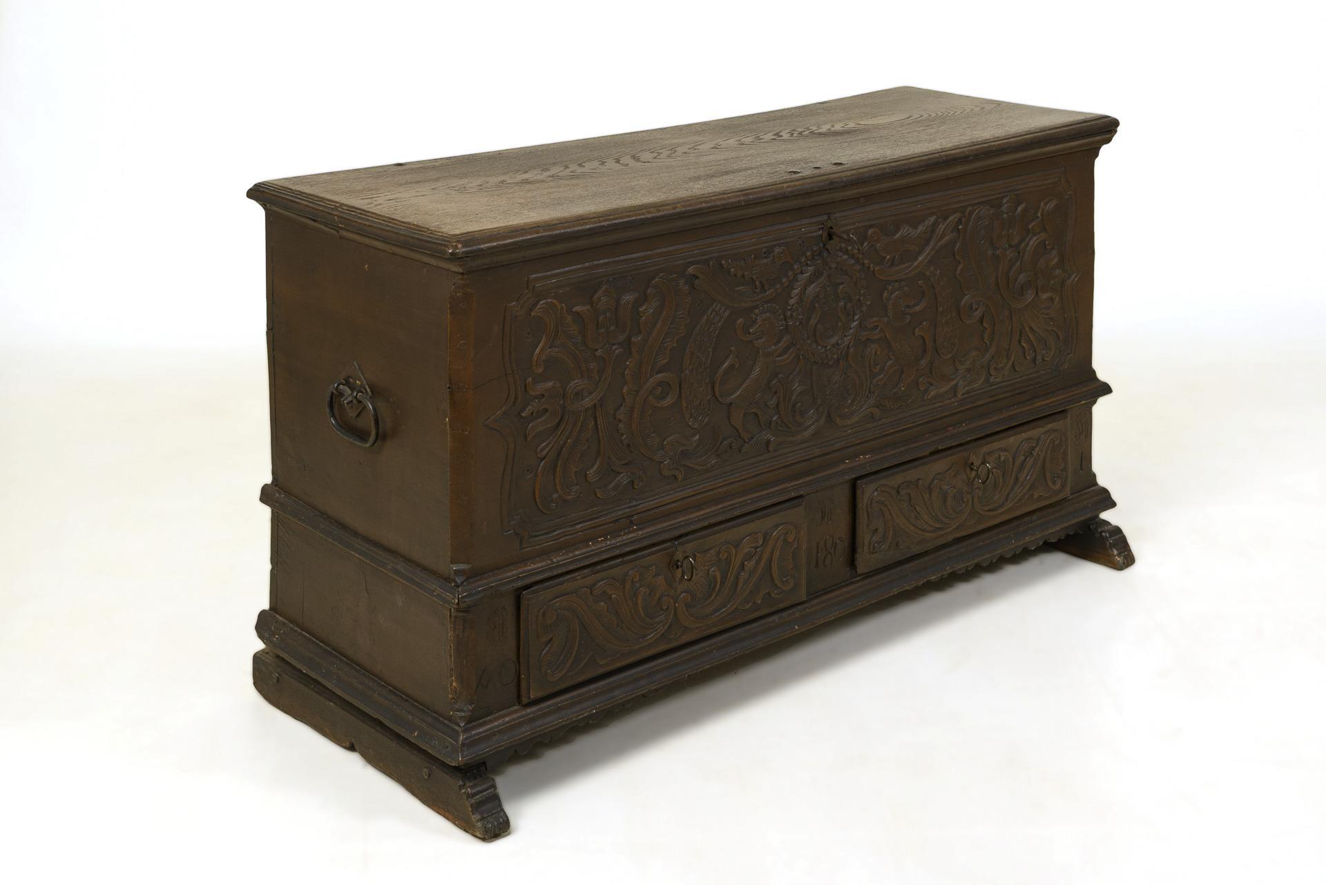 Kastentruhe mit vorkragendem Scharnierdeckel und 2 Sockelschüben, Profilleisten, geschweifte Sockelzarge, auf 2 Kufenfüßen. Frontseitig lebhafte Reliefschnitzereien mit einem zentralen Kranzmotiv, umgeben von 2 Löwen und 2 Vögeln sowie geschwungenen Blättern, Rocaillen und Blumen. Im Sockel datiert "A[nn]O 1801". Seitliche Eisengriffe, Scharnier mit beschlagenen Eisenbändern, Eisenschloss, Schlüssellochbeschläge aus Messing. Innen eine Beilade mit leicht klemmendem Deckel. Leichte Alters- und Gebrauchsspuren, partiell rissig.
