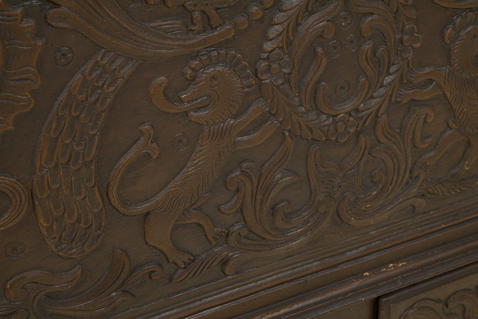 Kunstvoll beschnitzte Flachdeckeltruhe.