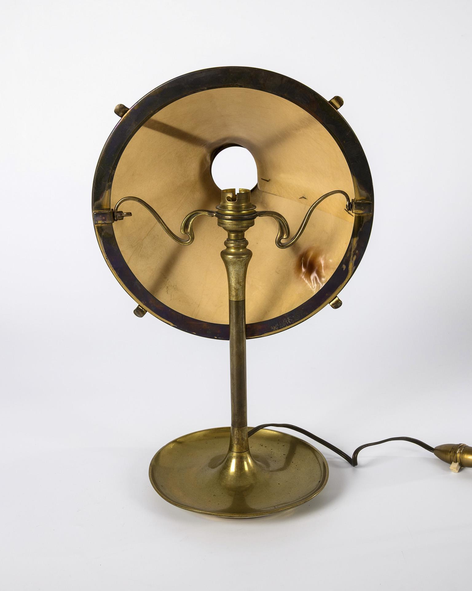 Schalenfuß, schlanker Schaft, geschweifte Haltearme für den drehbar gelagerten Schirm in Form eines Kegelstumpfes. Hitzeschaden an einer Stelle, Funktion nicht geprüft.