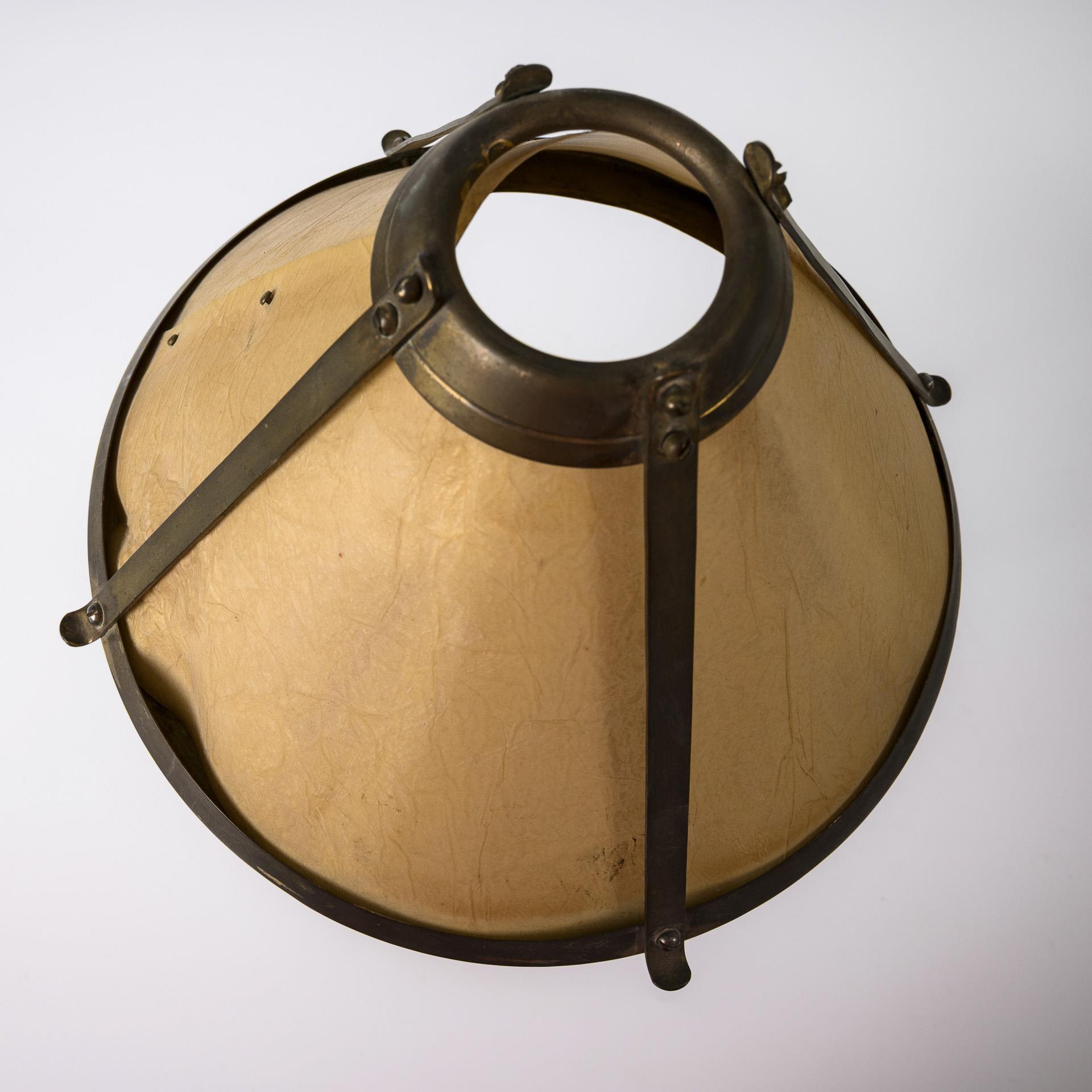 Bronze, Messing, Schirm innen Kunststoff, außen beigefarbenes Papier, Elektrifizierung mit Bajonettfassung. H 38 cm, Ø Schirm 23 cm.