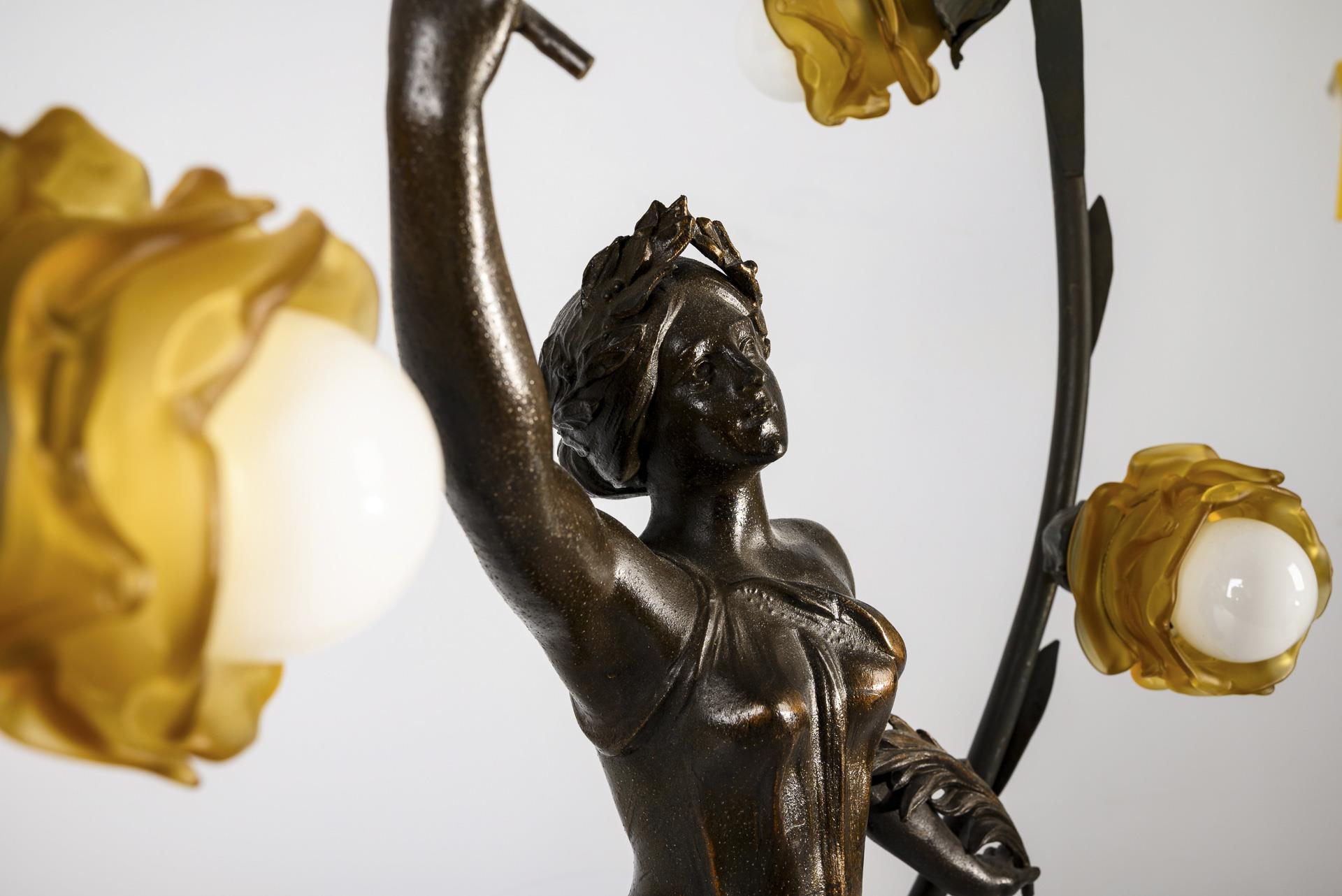 Neben dem Buch mit Lorbeerzweigen stehende Allegorie mit Lorbeerkranz. Mit ihrem erhobenen Arm stützt sie den bogenförmigen Zweig mit 6 blütenförmigen Lampen. Leichte Alters-/Gebrauchsspuren, 1 Glasschirm ergänzt, jünger verkabelt, funktioniert.