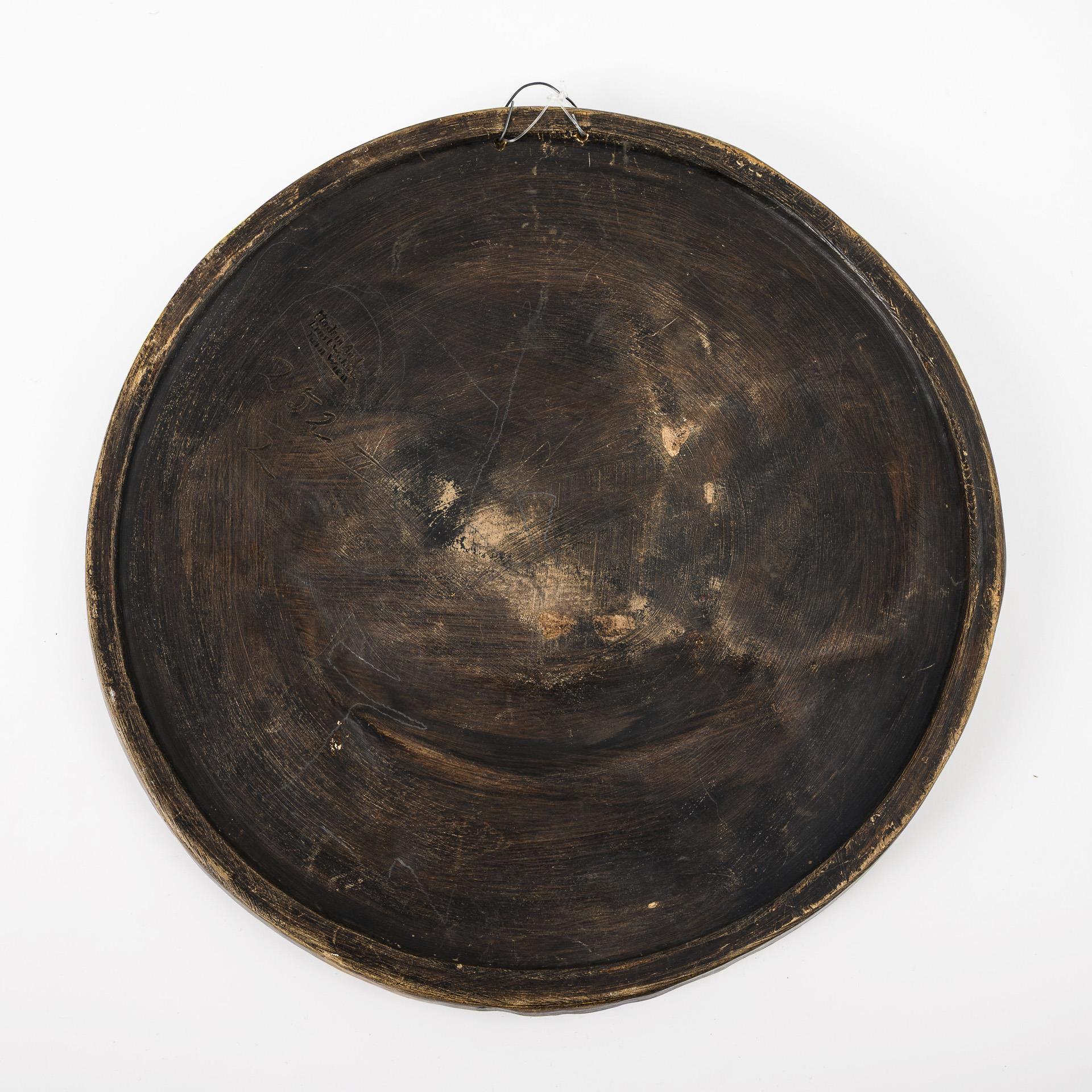 Runder, reliefierter Wandteller mit dem Motiv eines zärtlichen Kusses zwischen Kind und Mutter, umgeben von Blütendekor. Ergänzte Drahtaufhängung. Glasurdefekte.