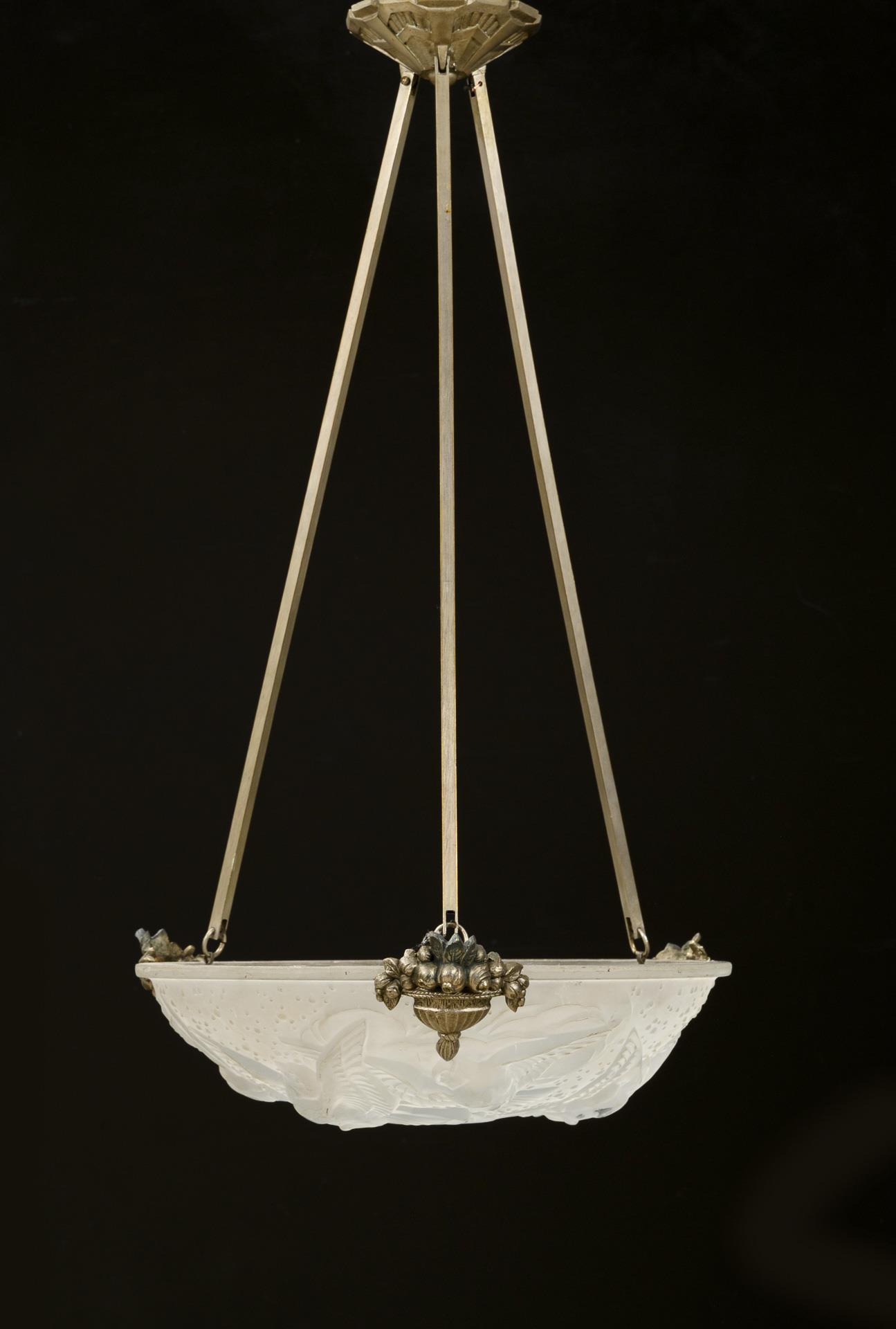 Art-déco-Schalenlampe mit Spatzen. Muller Frères, Luneville.