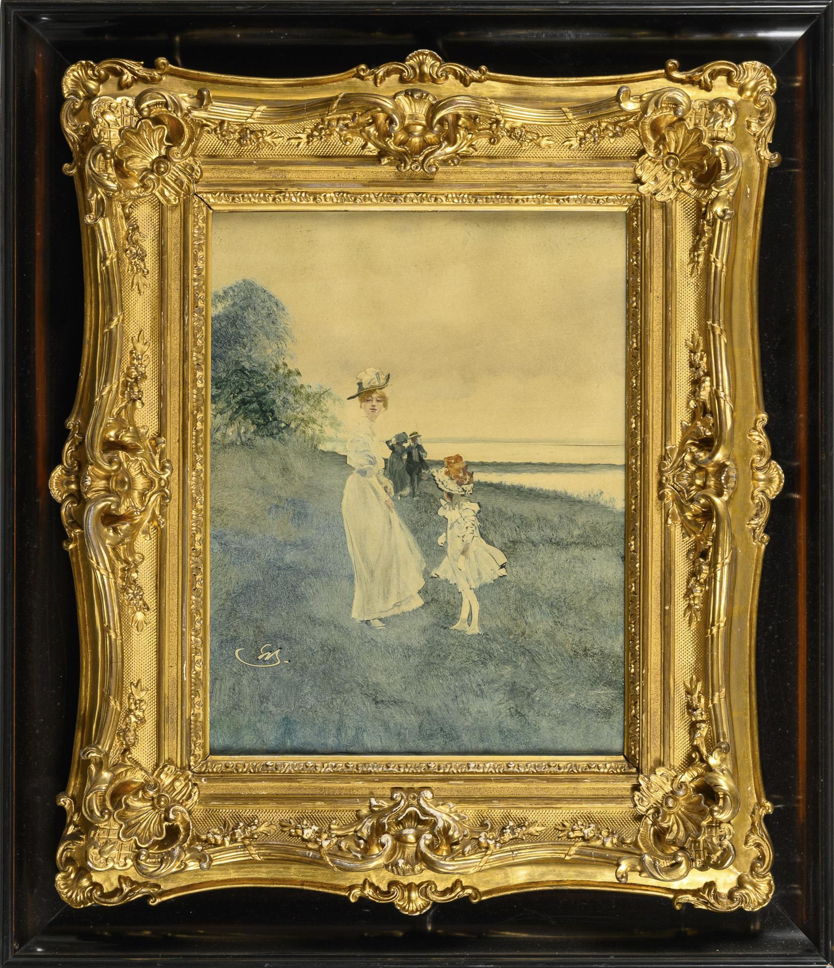 44,5 x 34 cm. Gerahmt & hinter Glas : 75 x 65 cm (Goldstuckrahmen auf dunklem Lackrahmen); 9,2 kg.
