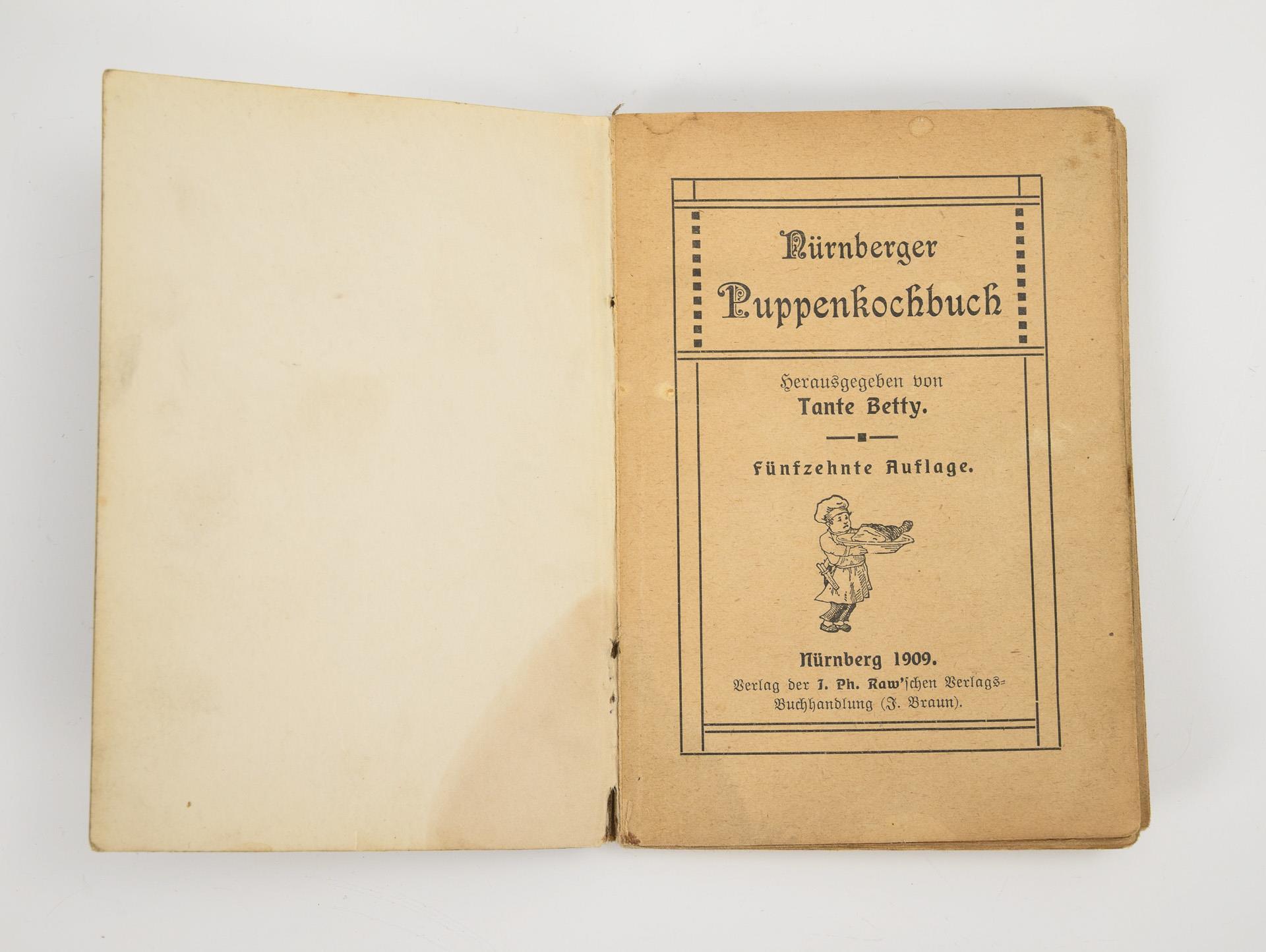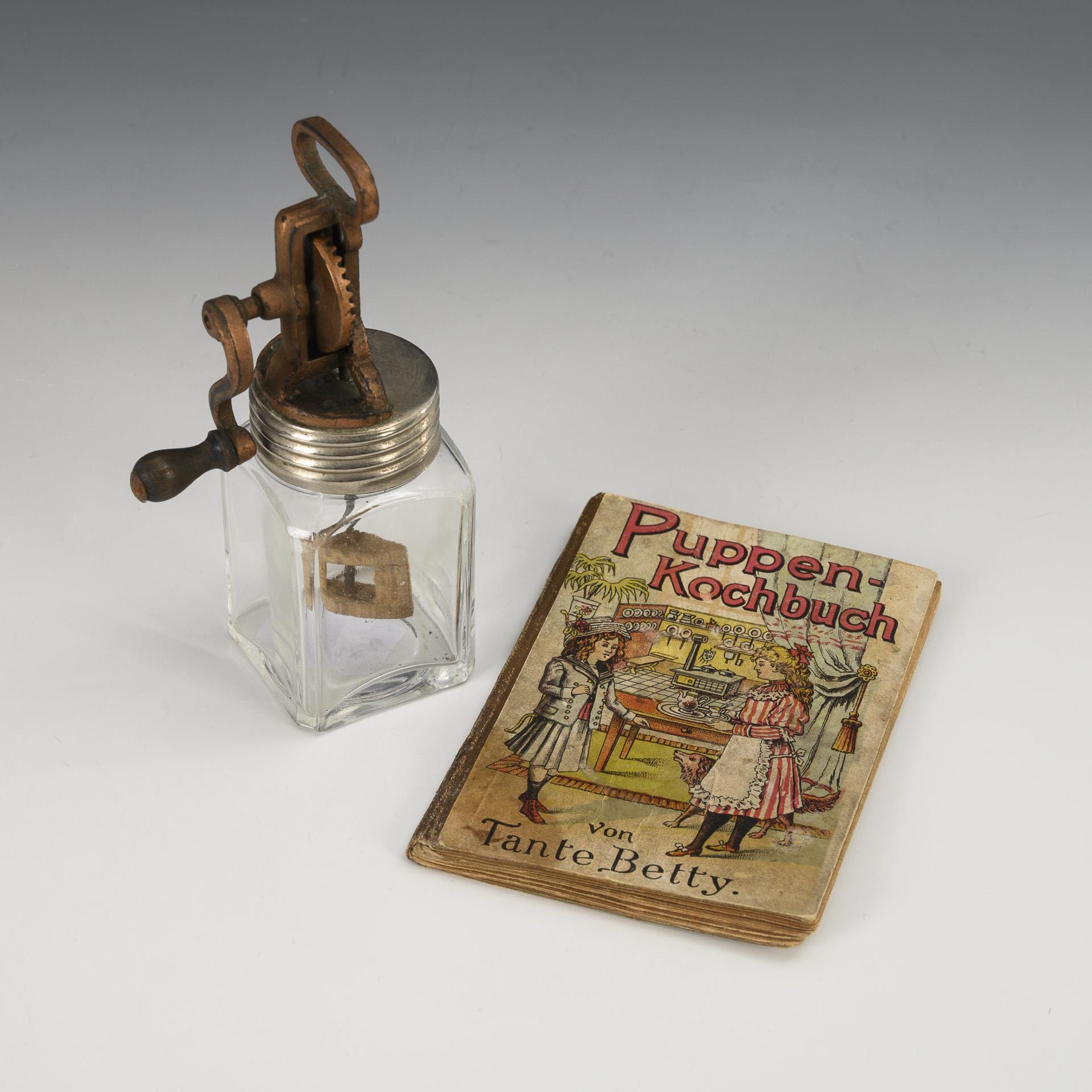 Glasgefäß mit kupferfarbenem Kurbelaufsatz (H 13 cm). / "Nürnberger Puppenkochbuch. Herausgegeben von Tante Betty, Nürnberg 1909". Mit Gebrauchsspuren und handschriftlichem Eintrag (11,5 x 8 cm).