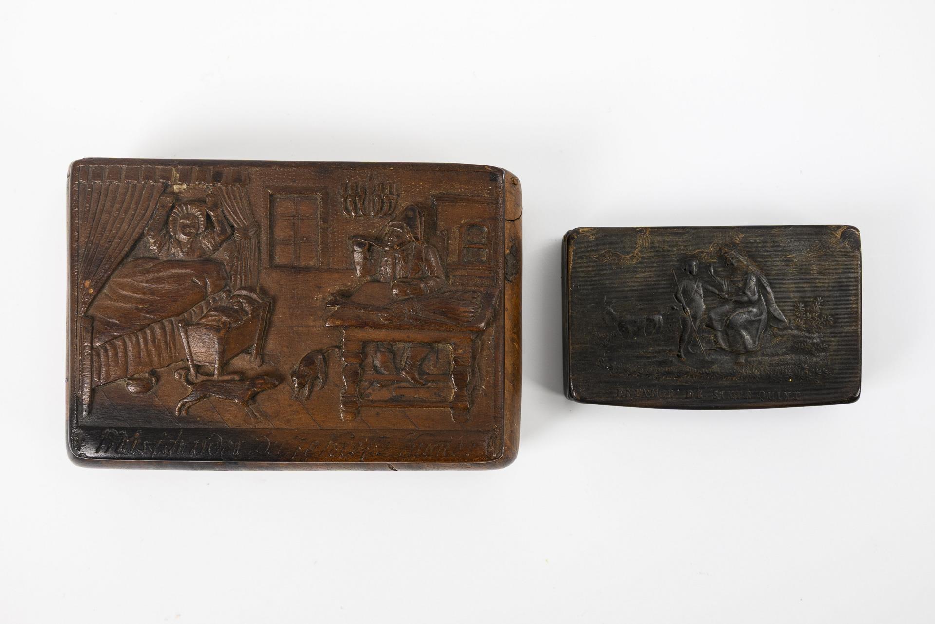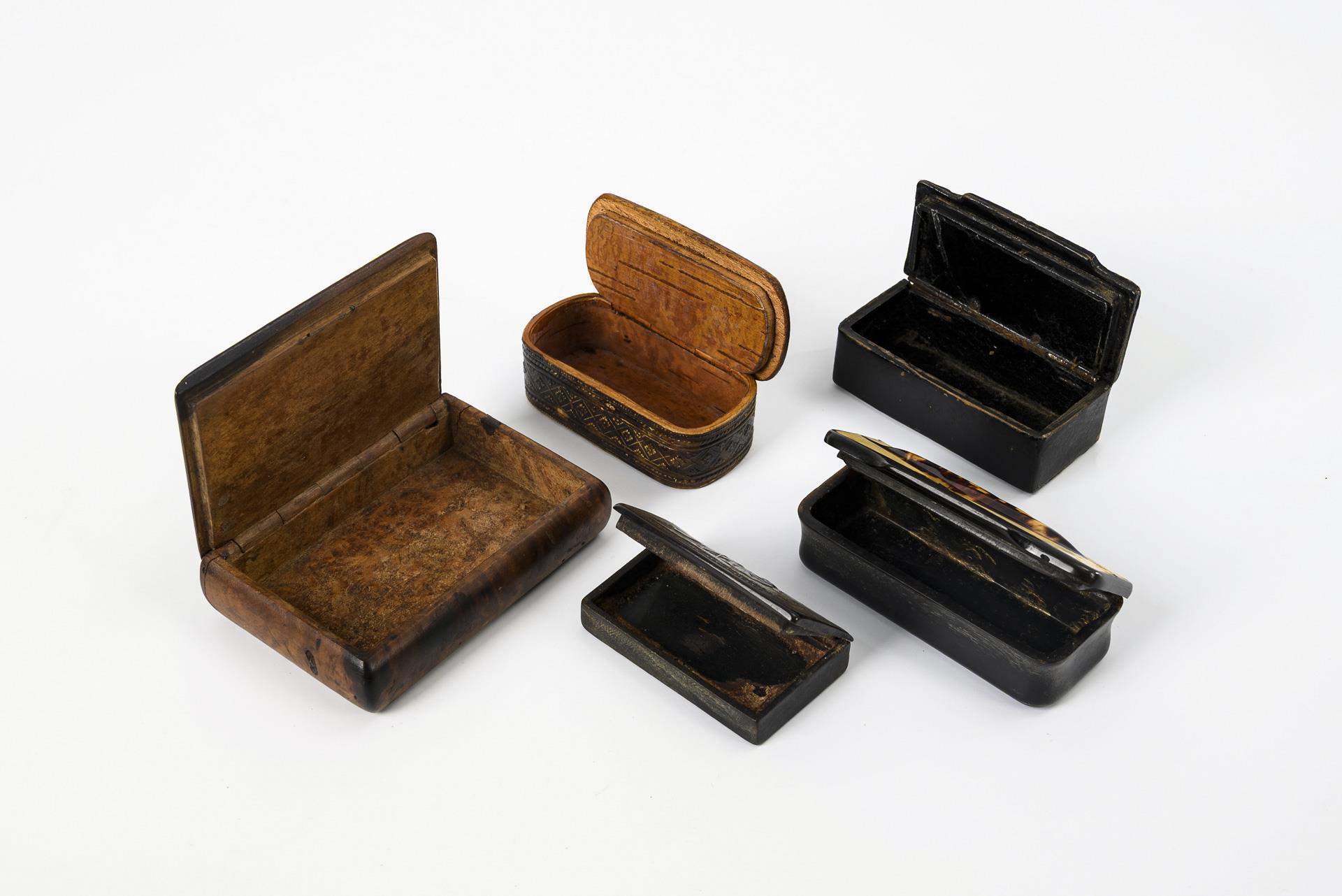 Maserholzdose mit geschnitzter Genreszene auf dem Scharnierdeckel: "Mus ich oder Du ze Krefte kumme?". Holz geklebt, minimale Ausbrüche und geringe Anobienspuren. / Horntabatiere mit Einlagen auf dem Scharnierdeckel: Reliefierte Raute auf weißem Steinnuss-Grund. Geringe Haarrisse, Scharnier schwergängig. / Horndöschen mit geprägtem Scharnierdeckel: Mutter mit Hirtenknaben "Enfance de Sixte Quint" (Kindheit von Sixtus V.) betitelt. Geringer Abplatzer, innen verschmutzt, Scharnier schwergängig. / Tabatiere mit geprägter und teils eingefärbter Birkenrinde beklebt. Auf dem Scharnierdeckel geprägter Tabakschnupfer sowie Ornament. Minimale Rindenfehlstelle am Scharnier. / Schwarze Lackdose aus Papiermaché, auf dem Scharnierdeckel Fadeneinlagen aus Zinn. Alters-/Gebrauchsspuren.
