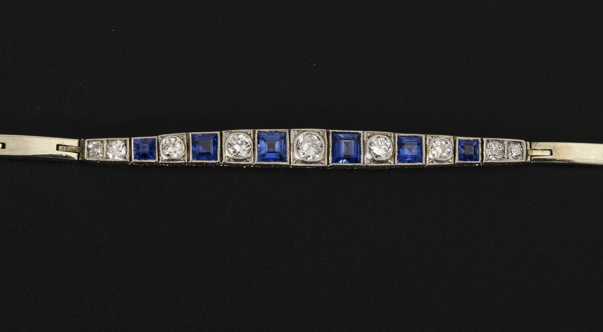 Sie befinden sich hier: Startseite Kategorien Schmuck Art déco-Armband mit Altschliff-Brillanten und blauen Farbsteinen
