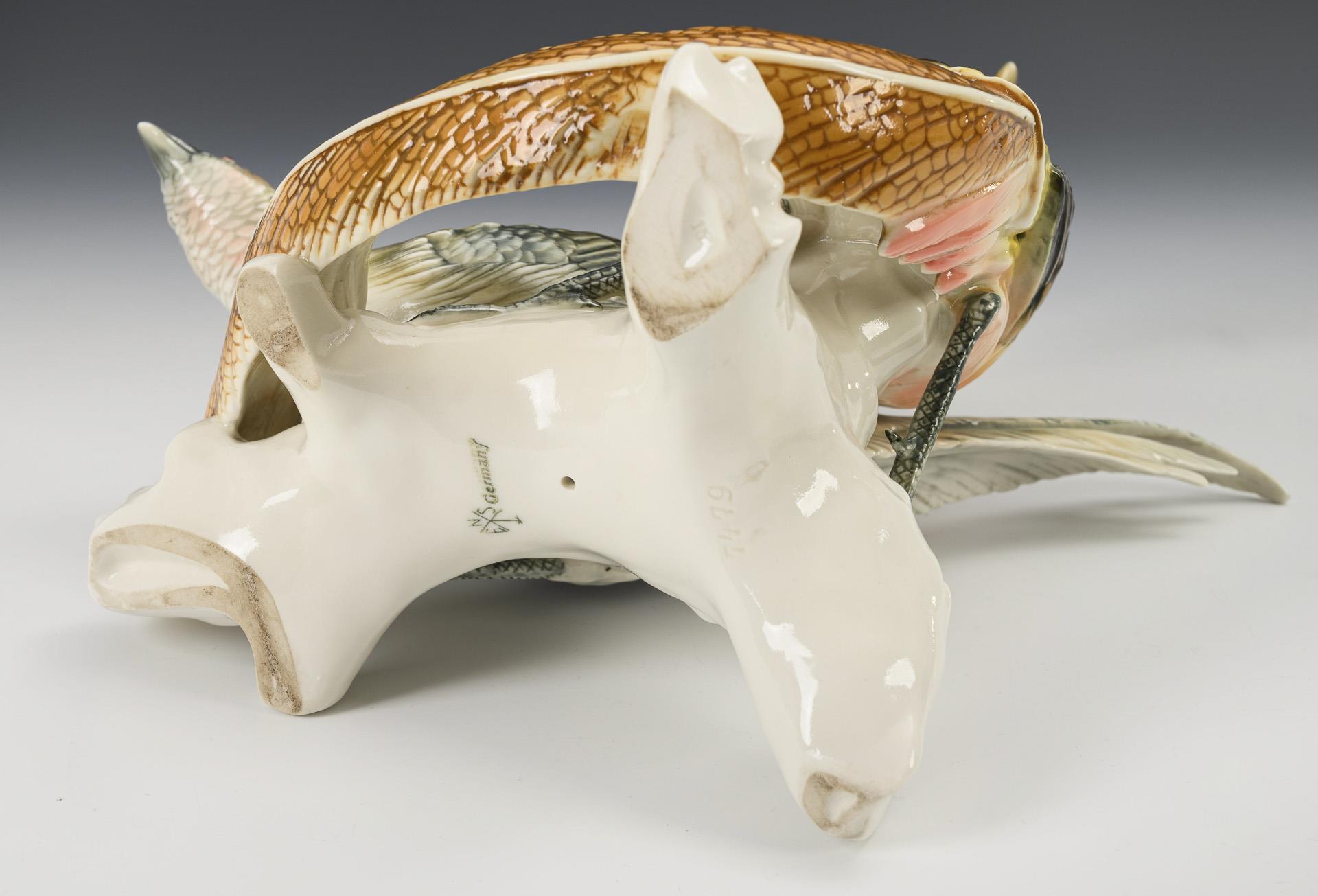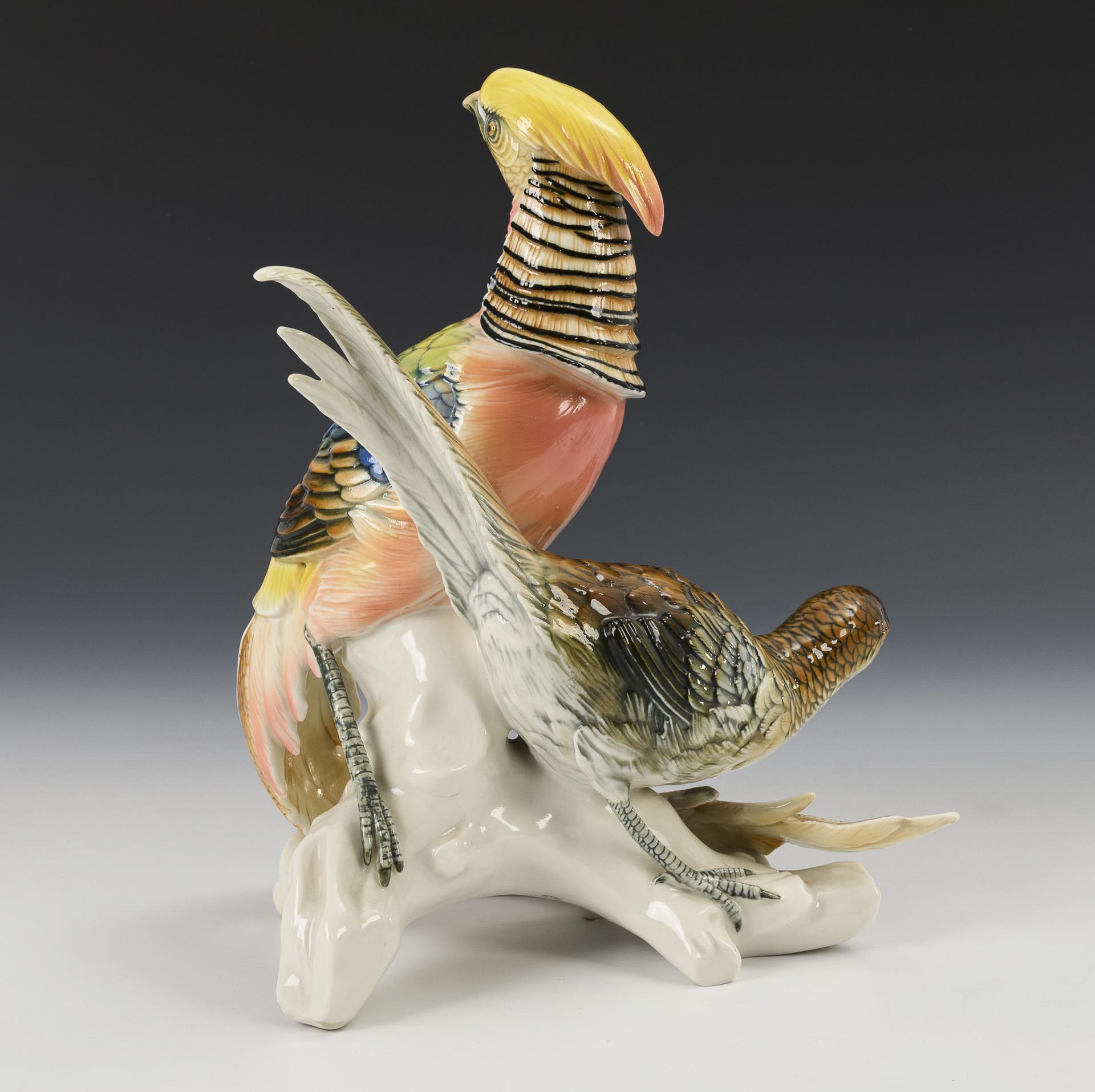 Auf einem Astsockel sitzendes Paar Goldfasane. Haarriss im Schwanz des Fasanenhahnes.