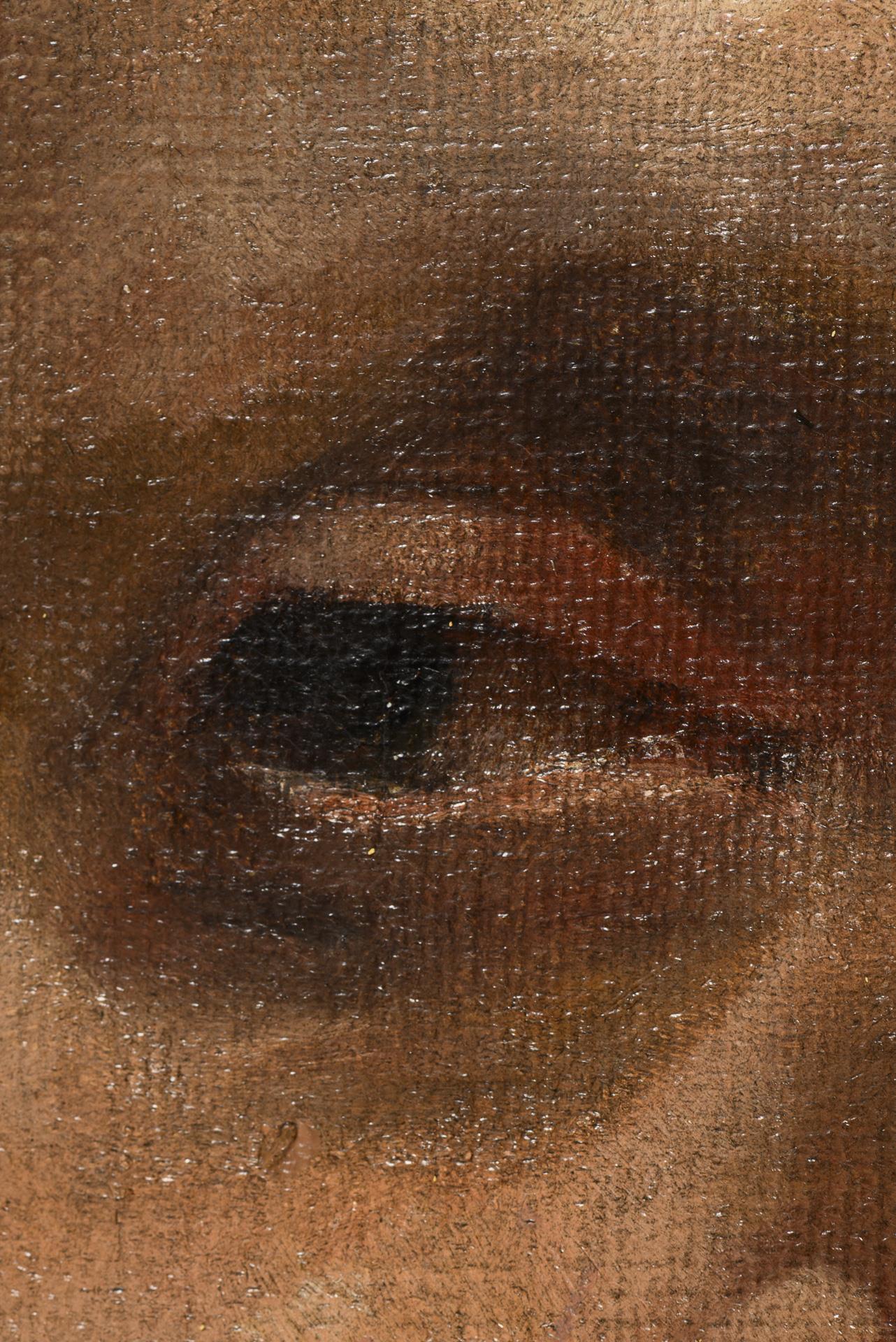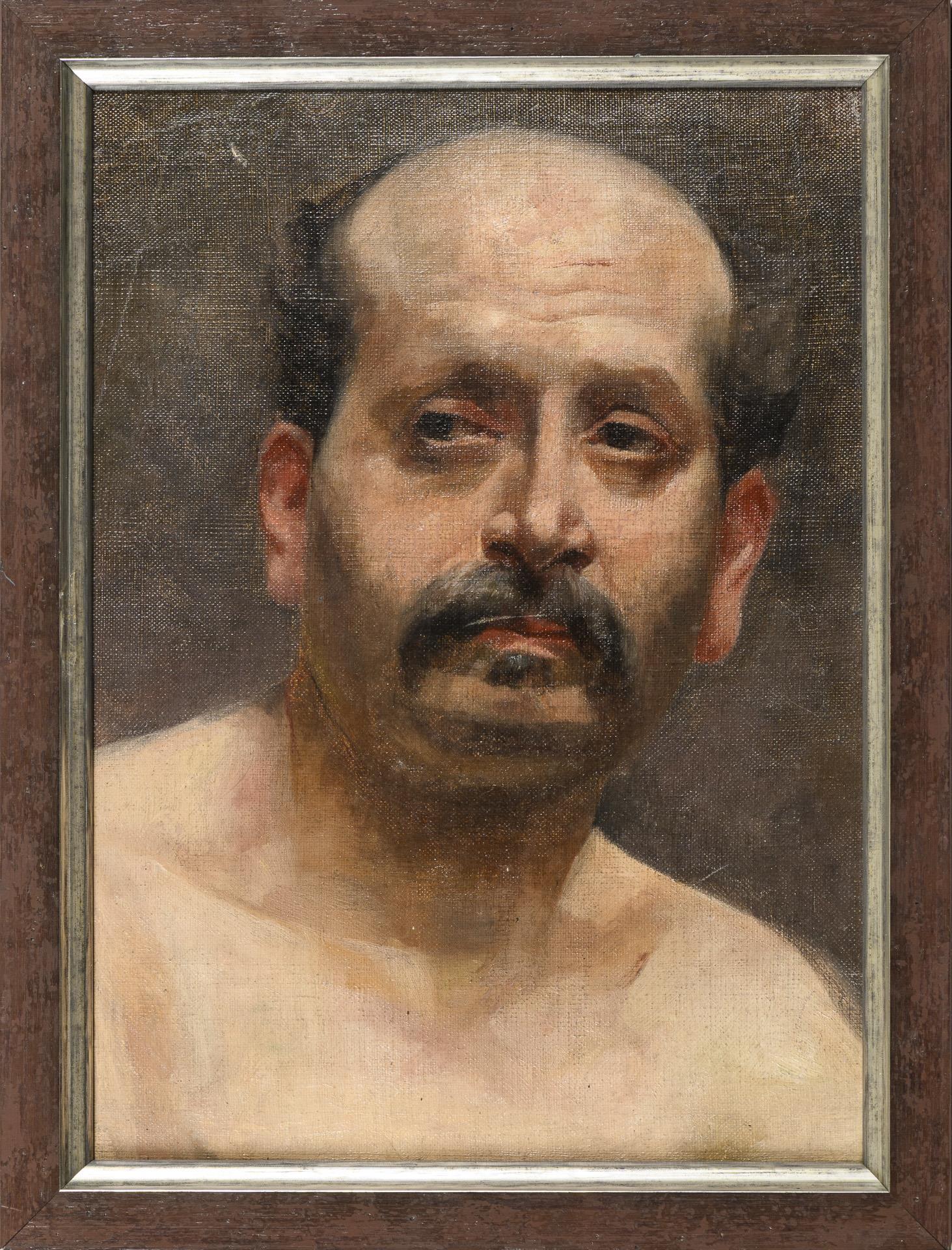 Bildnis eines älteren Mannes mit Schnauzbart und freiem Oberkörper im hellen Licht. Leinwand doubliert.
