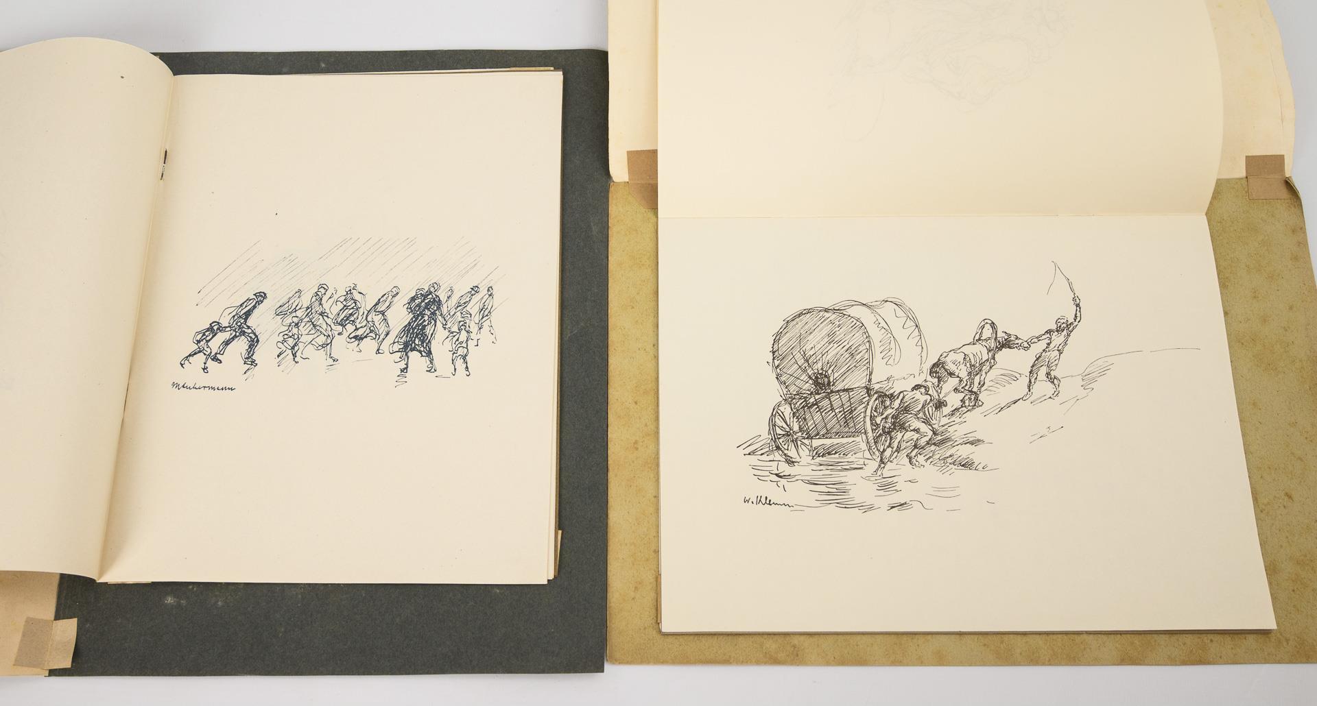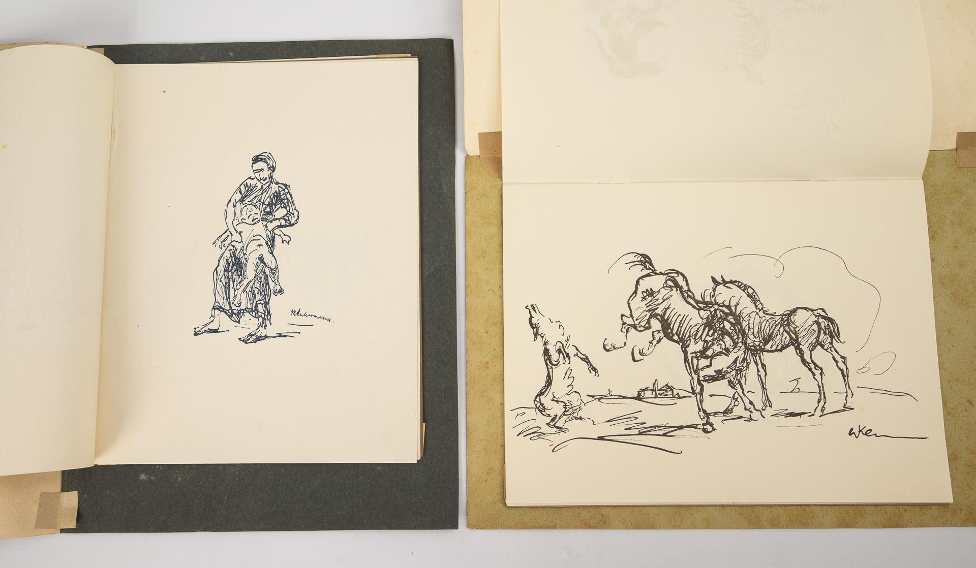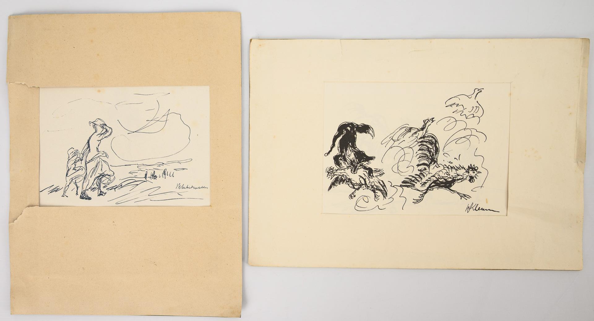 Max Liebermann und Walter Klemm. Jeweils 8 im Druck signierte Lithografien, pro Heft. Im Einband ein kurzer Text der Künstler über das Zeichnen. Hefte so gefaltet, dass ein einzelnes Blatt im defekten Passeapartout erscheint.