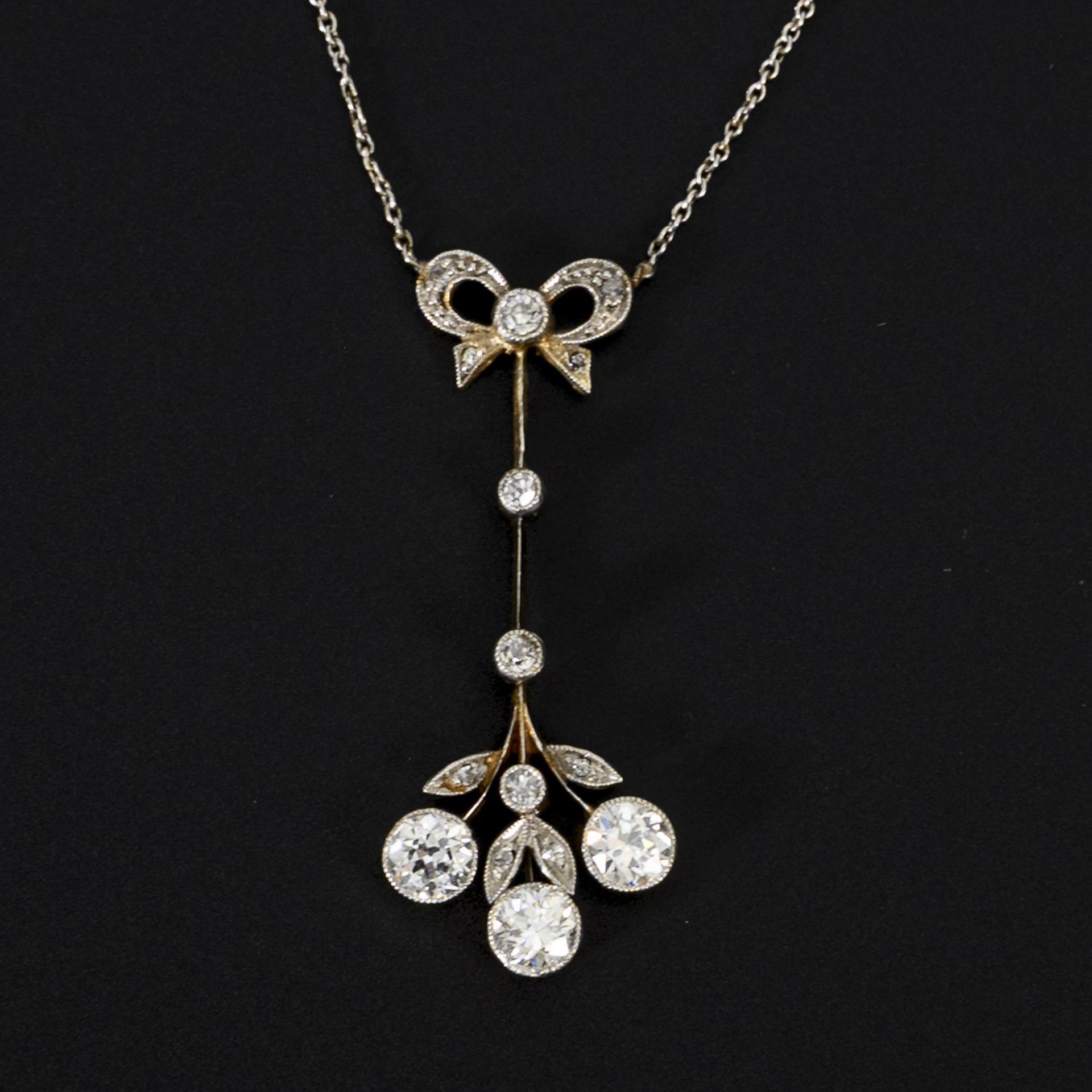 Sie befinden sich hier: Startseite Kategorien Schmuck Außergewöhnliches Jugendstil-Collier mit großer Altschliff-Brillanten-Trilogie