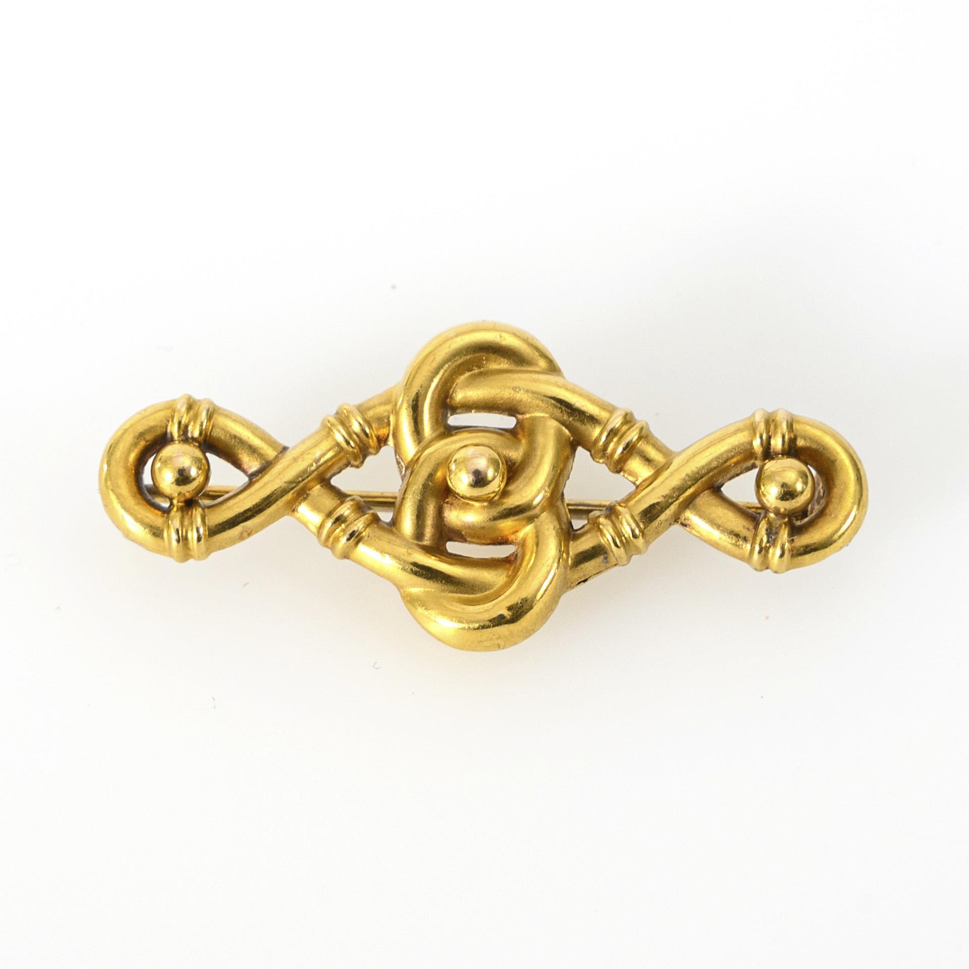 Historische Brosche in knotenförmiger Ausgestaltung mit einfachem Hakenverschluss. Alters- und verarbeitungsbedingte Tragespuren: Rückseitig eine Kugel mit Materialverlust, unter- und oberseitig entlang der Nähte kleinere, beim Tragen nicht sichtbare Fehlstellen, wenige kleine Dellen.