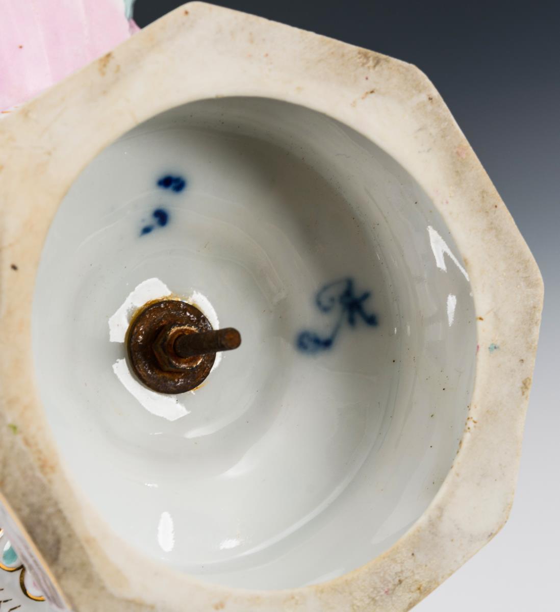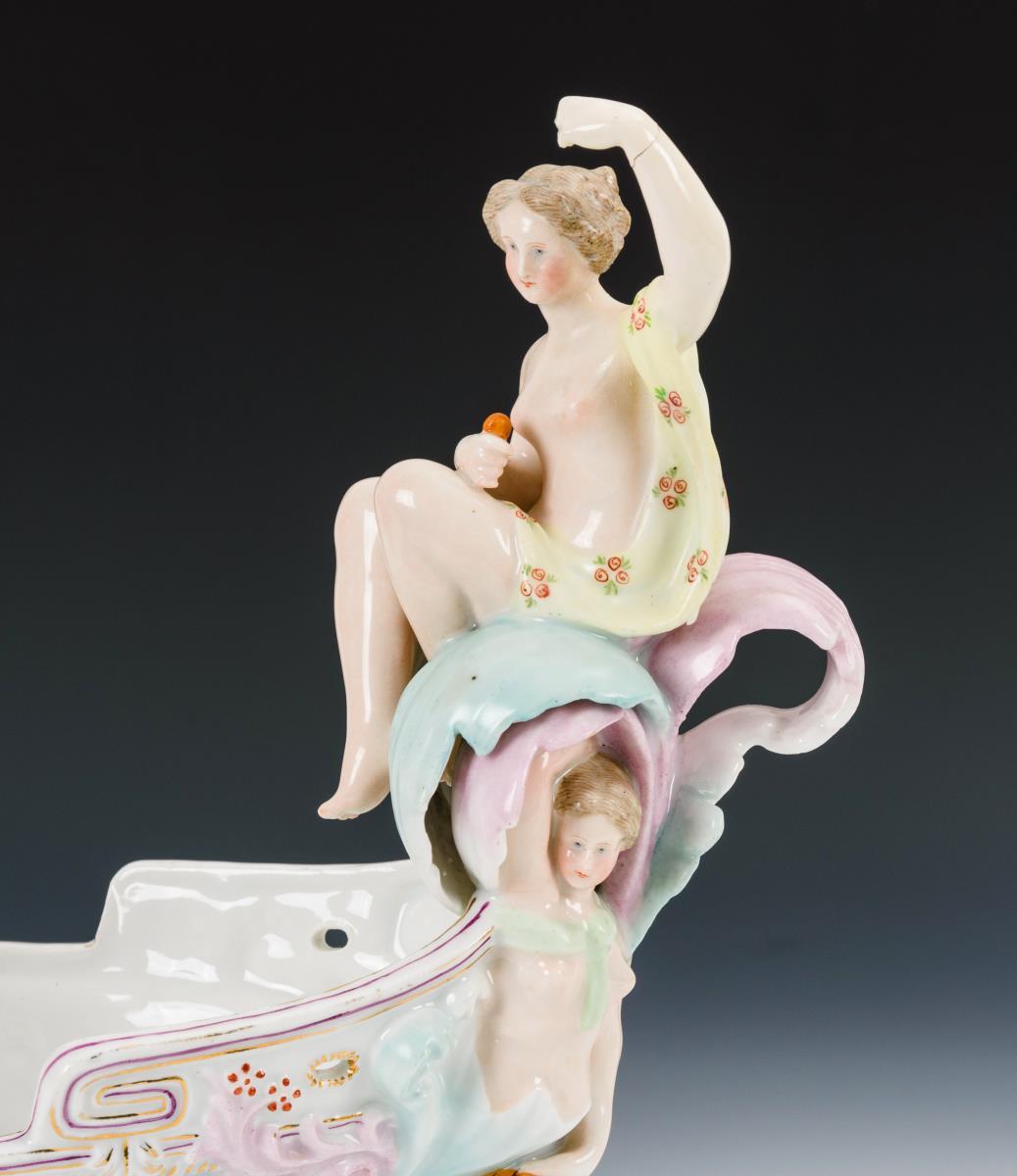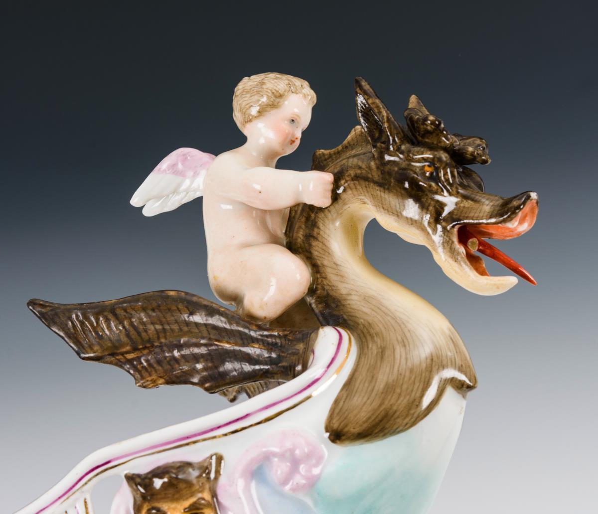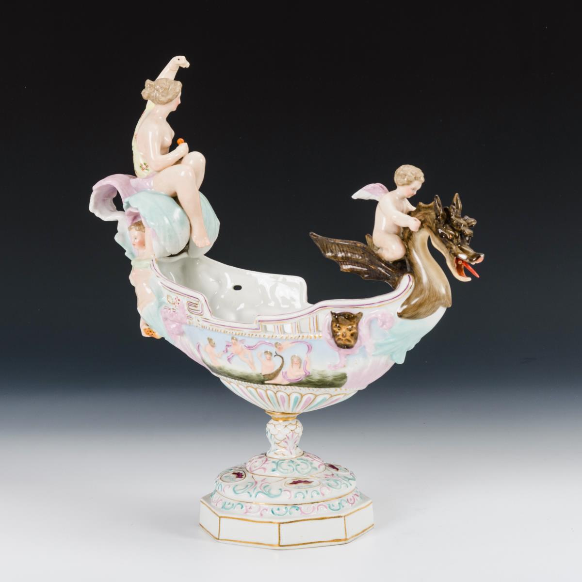 Tafelaufsatz in Schiffchenform mit einem drachenreitenden Putto sowie einer Venus, auf der Wandung figürliches Reliefdekor, oktogonaler Fuß. 1 Hand der Venus geklebt, Drachenflügel und Zunge restauriert, 1 Zungenspitze fehlt.