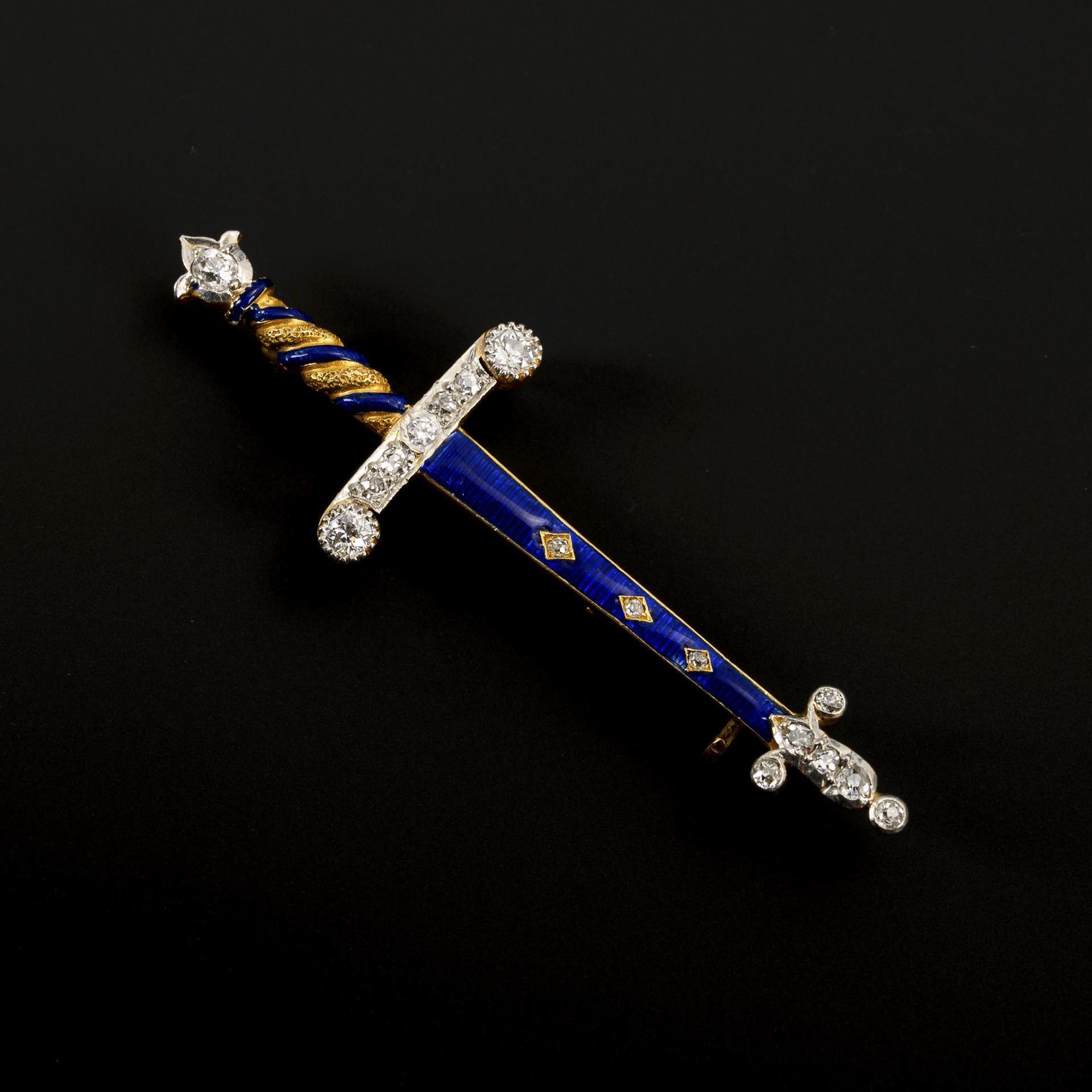Außergewöhnliche historische Brosche mit blauer Emaillierung und Altschliff-Brillanten und Diamanten, die Nadel mit einfachem Hakenverschluss und rückwärtig mit zusätzlichem Haken. Leichte altersgerechte Tragespuren; das Emaille mit einem minimalen Chip, der Haken der Broschierung restauriert, die Nadel leicht verbogen.