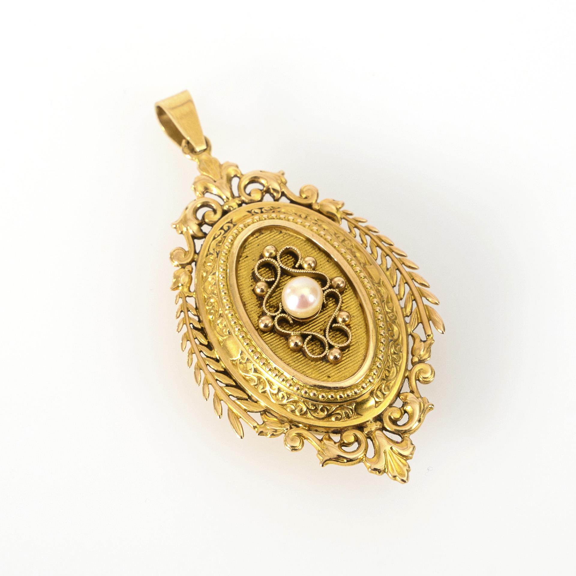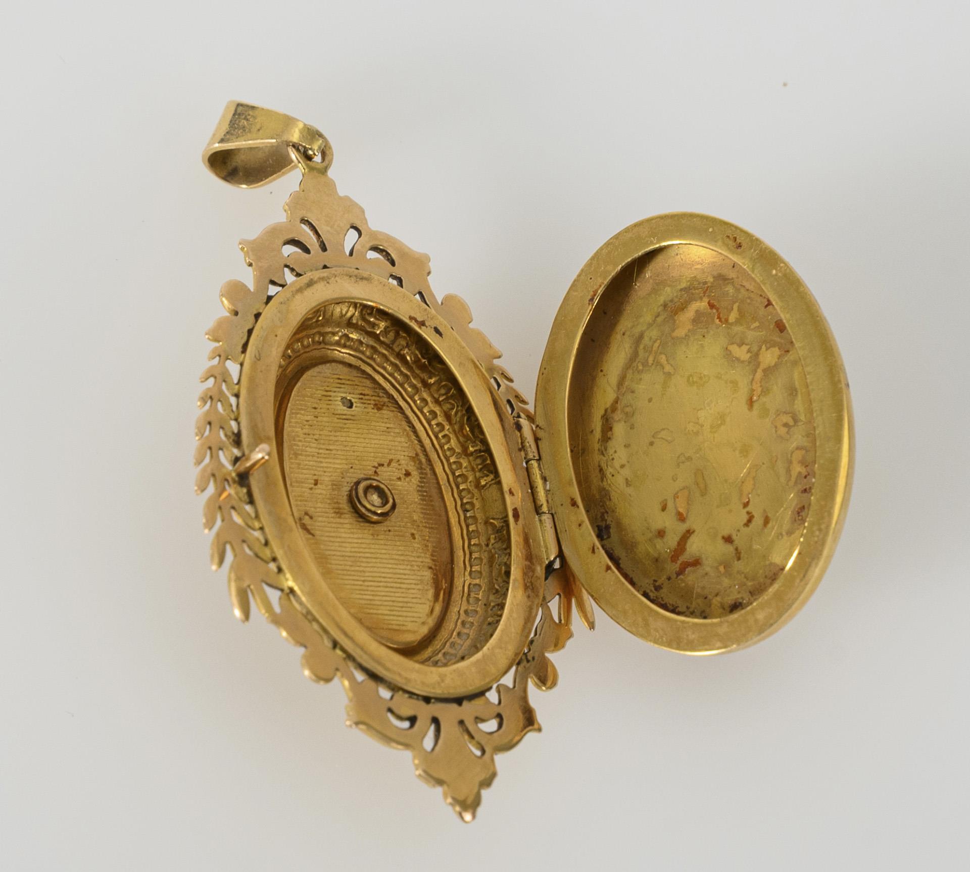 Um 1880, aufwändig gearbeitetes Medaillon mit aufgesetzter Perle, umrahmt von Fleur-de-Lys und Lorbeerkranz-Elementen. Innen keine Rahmungen mehr vorhanden.
