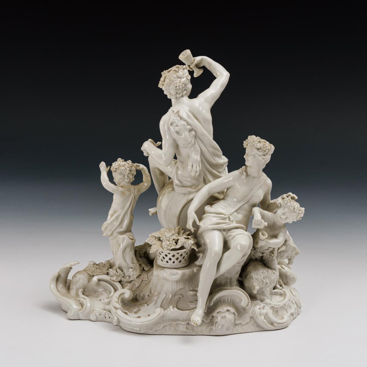 Auf einem Weinfass sitzender Bacchus mit Leopardenfell und Glas, hinter ihm die von Putten mit Weinflaschen und -bechern sowie einem Ziegenbock umgebene Ariadne.